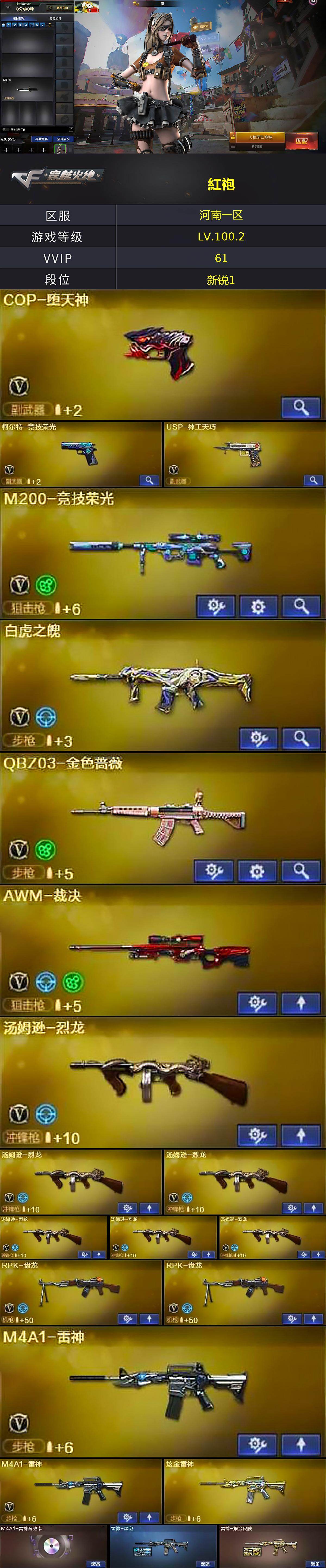 河南一区-69v-4王者武器数-2炫金武器数 【热门武器】:q03-金色蔷薇,m200-竞技荣光,死亡之眼,汤姆逊-烈龙6,rpk-盘龙2,加特林-炼狱,cop-堕天神,沙鹰-修罗2,金刚伞 【王者炫金武器】:炫金雷神,炫金毁灭 【音效卡】:m4a1-雷神音效卡,barrett-碧霄极光音