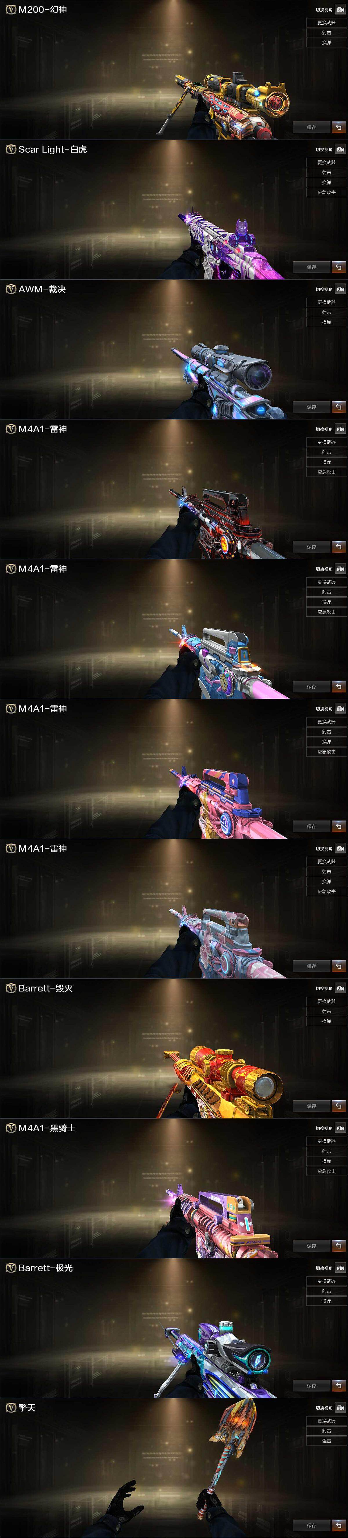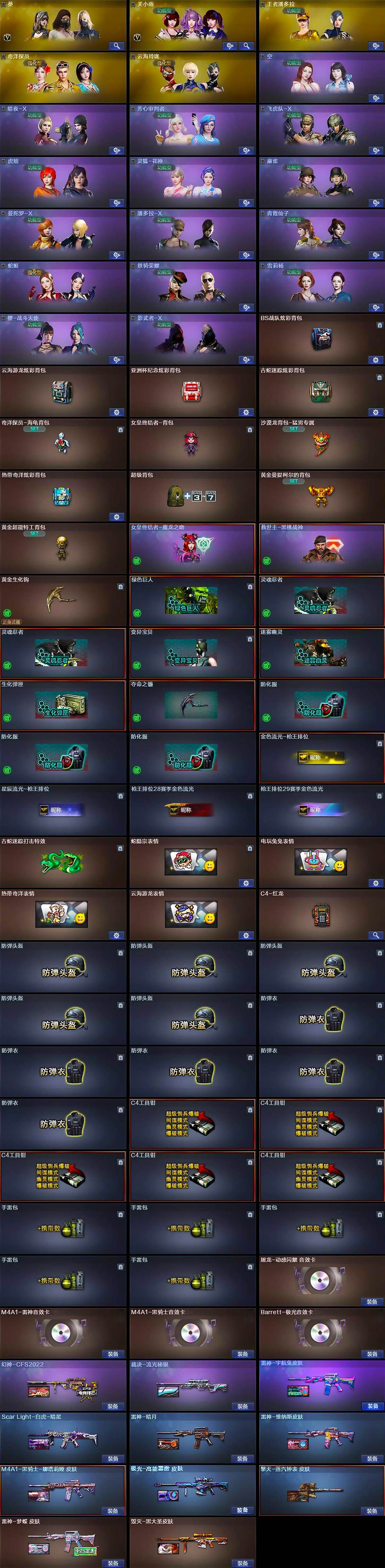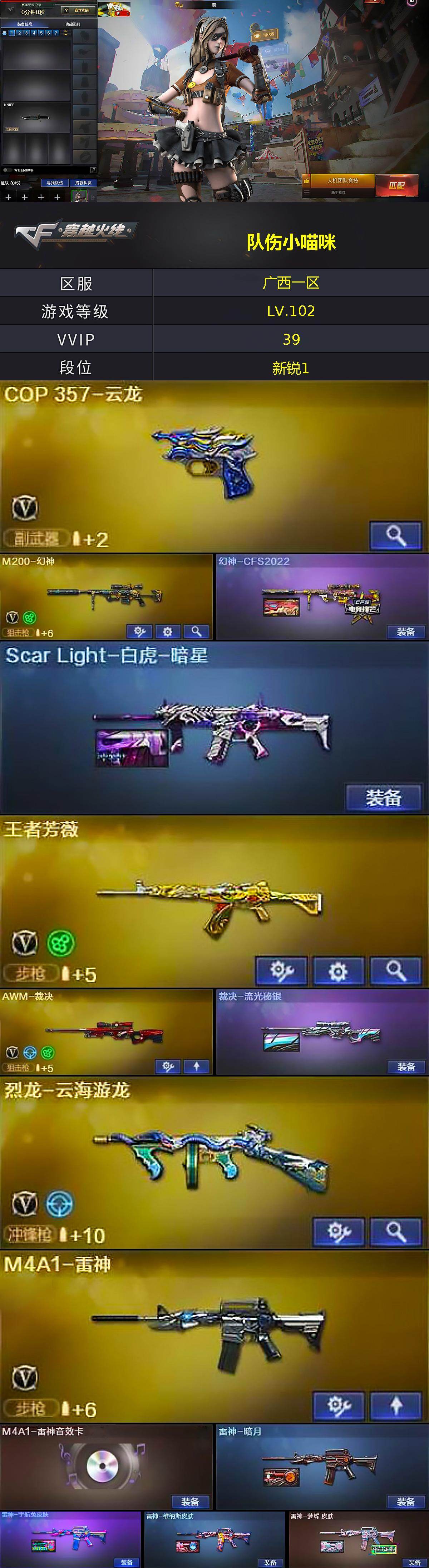 广西一区-40v-5王者武器数-0炫金武器数 【热门武器】:m200-幻神,修罗-古蛇迷踪,死亡之眼2,c.a.t,牛牛-ak47,m4a1-黑骑士,羊驼玩偶,毁灭-孙三炮 【音效卡】:屠龙-动感闪耀 音效卡,m4a1-雷神音效卡,m4a1-黑骑士音效卡,barrett-极光音效卡 【皮肤】:幻神-cfs2022,scar light-白虎-暗星,裁决-流光秘银,雷神-暗月,雷神-宇航兔皮肤