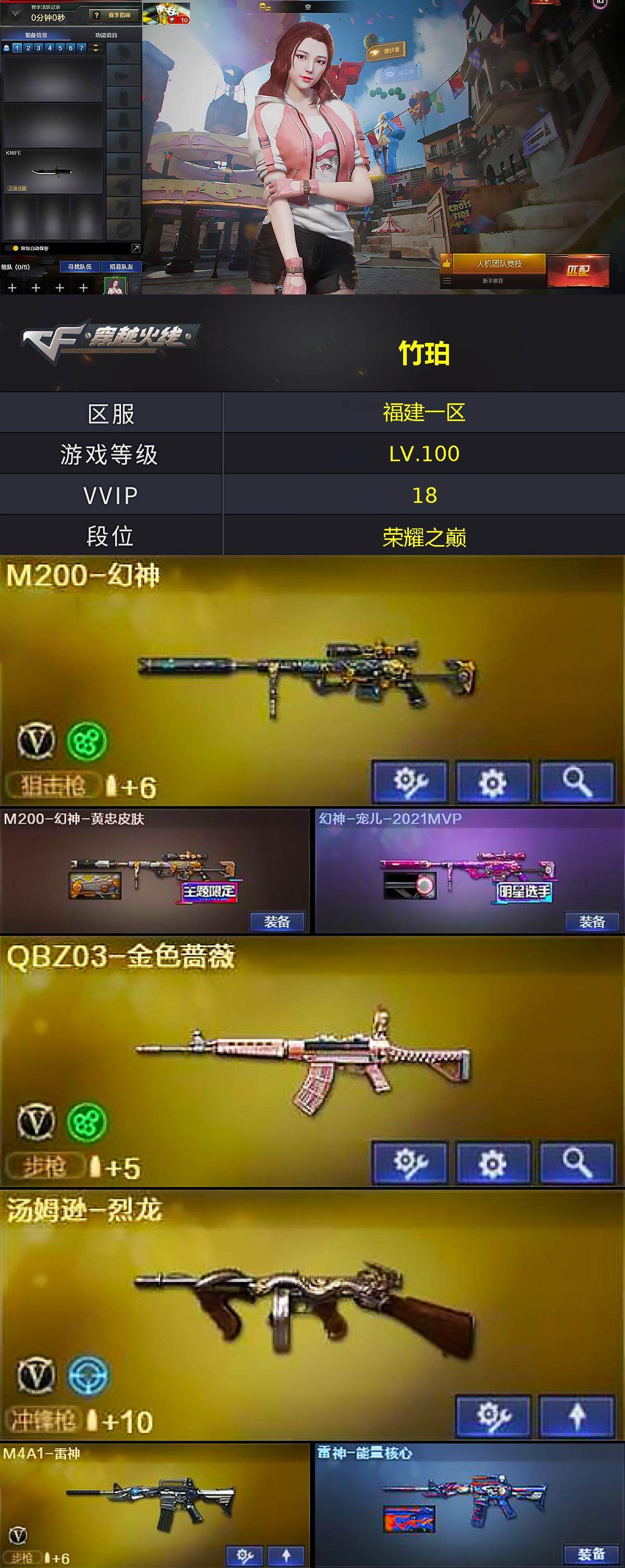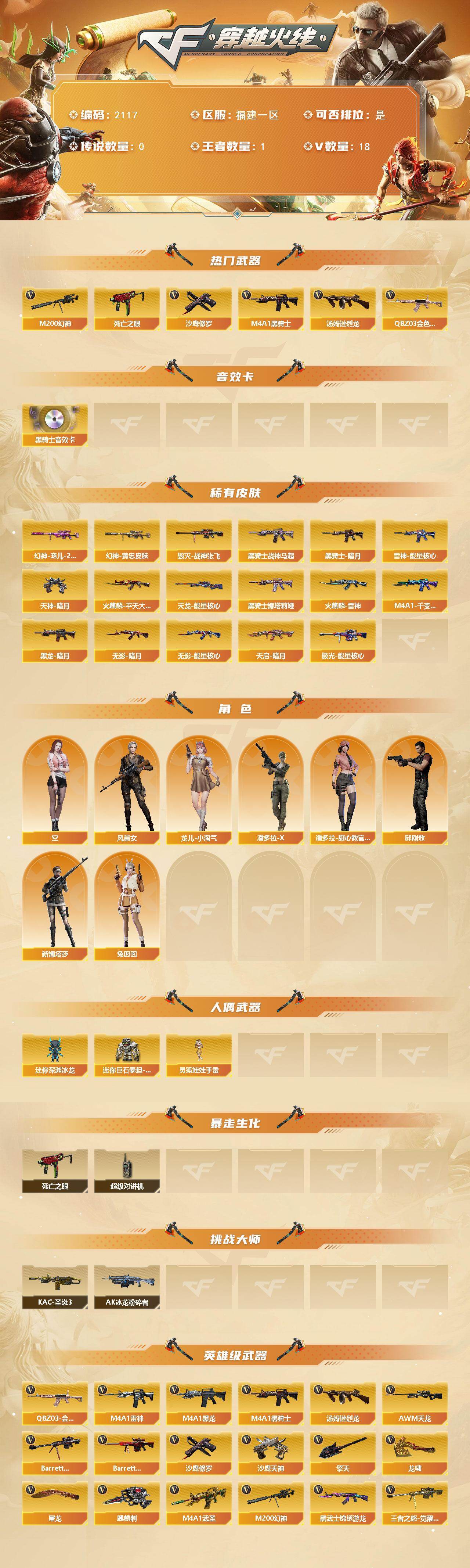 [16717863]福建一区-20v-1王者武器数-0炫金武器数 【热门武器】:q03-金色蔷薇,m200-幻神,死亡之眼2,m4a1-黑骑士,汤姆逊-烈龙,沙鹰-修罗 【音效卡】:m4a1-黑骑士音效卡 【皮肤】:m200-幻神-黄忠皮肤,幻神-宠儿-2021mvp,雷神-能量核心,火麒麟-雷神,火麒麟-平天大圣,毁灭-战神张飞,m4a1-千变-孔明皮肤,黑龙-暗月,黑骑士-暗月,黑骑士-战神马超,m4a1-黑骑士-娜塔莉娅 皮肤,无影-暗月3,无影-能量核心,天启-暗月,天龙-能量核心,极光-能量核心,天神-暗月2 【角色】:空,风暴女,龙儿-小淘气,潘多拉-x,潘多拉-甜心教官,邱刚敖,兔囡囡,新娜塔莎 【人偶武器】:迷你深渊冰龙,迷你巨石泰坦-魔花研究所,灵狐娃娃手蕾 【暴走生化】:死亡之眼2,超级对讲机 【挑战大师】:ak47-冰龙粉碎者,kac-圣炎切割者iii 【英雄级武器】:m4a1-黑龙,m4a1-雷神,m4a1-黑骑士,m4a1-武圣,黑武士-锦绣游龙,q03-金色蔷薇,awm-天龙,barrett-毁灭,barrett-极光,m200-幻神,王者之怒-觉醒版,汤姆逊-烈龙,沙鹰-修罗,沙鹰-天神,屠龙,龙啸,擎天,麒麟刺 【道具】:战舰背包,夺命之镰,防化服,星辰流光-呛王排位,呛王排位28赛季金色流光,防弹头盔4,防弹衣5,c4工具钳3,手蕾包3 【特殊呛械】:1黑骑士,1烈龙