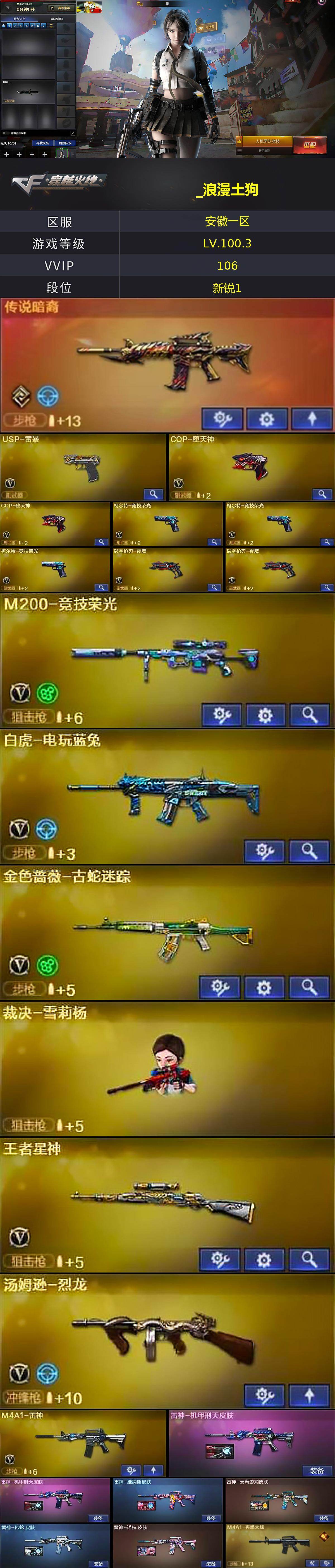 [16718780]安徽一区-103v-1王者武器数-0炫金武器数 【传说武器】:传说暗裔 【热门武器】:传说暗裔,金色蔷薇-古蛇迷踪,修罗-古蛇迷踪,m200-竞技荣光,白虎-电玩蓝兔,cat-刀锋,m4a1-黑骑士2,汤姆逊-烈龙,裁决-雪莉杨,usp-雷暴,cop-堕天神2,沙鹰-修罗 【音效卡】:修罗-古蛇迷踪音效卡,m4a1-黑骑士音效卡,barrett-碧霄极光音效卡2,麒麟刺-百战金芒-盛典舞曲音效卡,炼狱-百战金芒-庆典舞曲音效卡,死神-雪域霜狐-怀旧音效卡,柯尔特-百战金芒-庆典舞曲音效卡,awm-昌龙-怀旧音效卡,ak47-火麒麟-怀旧音效卡 【皮肤】:雷神-机甲刑天皮肤2,雷神-维纳斯皮肤,雷神-云海游龙皮肤,雷神-化蛇 皮肤,雷神-诺拉 皮肤,m4a1-再燃火线,火麒麟-雷神,火麒麟-平天大圣2,火麒麟-百城,毁灭-暗月,毁灭-黑大圣皮肤,毁灭-魔灵皮肤,毁灭-神秘黑洞皮肤,毁灭-虹光风暴 皮肤,毁灭-英雄计划 皮肤,m4a1-千变-孔明皮肤,黑骑士-暗月,m4a1-黑骑士-娜塔莉娅 皮肤,黑武士-典韦皮肤,ak47-b-常胜将军-刘备,awm-再燃火线,屠龙-惊鸿 皮肤,龙啸-蛇姬 皮肤,轻型军用手斧-再燃火线,麒麟刺-月皮肤 【角色】:零,樱,魅影,凌霄,电竞教官-云悠悠,战地猎狐,雪域霜狐,蛇隐宗,暗夜-x,北极狐-x,初恋灵狐,电竞少女,芳心审判者,飞虎队-x,风暴女2,嘉年华灵狐,疾风,荆棘玫瑰,娟娟,兰-海滩派对,兰-新年限定,兰妹妹,猎狐者-追月,0号玩家,零-水下丽影,灵狐者-x,灵狐者-七夕宝贝,龙儿-小淘气,麻雀,娜塔莉娅,潘多拉-x,潘多拉-甜心教官,青霞仙子,蛇姬,斯沃特-x,蜀雪,兔囡囡,维纳斯,雪莉杨-摸金校尉,夜玫瑰-宠粉,樱-战斗天使 【人偶武器】:裁决-雪莉杨,m4a1-雷神-精英刀锋,迷你钢铁终结者,迷你救赎猎手,awm-灵狐-15周年嘉年华2,m37-葵,cat-刀锋,迷你深渊冰龙2,迷你裂空之翼4,迷你波特博士14,夺魂3,迷你牛牛,迷你火种3,迷你生化手蕾,生化手蕾-机甲核心2,深渊终结者手蕾,迷你艾比,迷你超能女侍 【暴走生化】:超级对讲机 【挑战大师】:神圣爆裂者iii2,冰龙粉碎者-白马银呛2,激光毁灭者iii-白马银呛2,vepr-12-金魔,激光毁灭者iii,机甲撕裂者iii