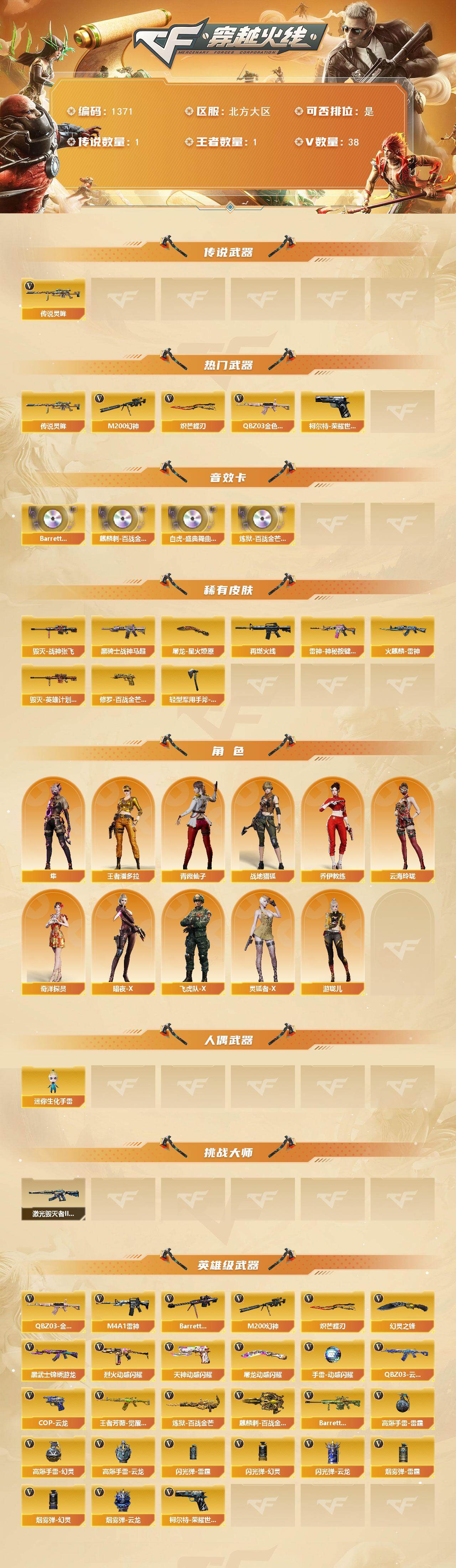 [16720054]北方大区-38v-1王者-0炫金 【传说武器】:传说灵眸 【热门武器】:传说灵眸,q03-金色蔷薇,m200-幻神,柯尔特-荣耀世冠白鲨2023,炽芒蝶刃 【音效卡】:barrett-碧霄极光音效卡,麒麟刺-百战金芒-盛典舞曲音效卡,白虎-盛典舞曲音效卡,炼狱-百战金芒-庆典舞曲音效卡 【皮肤】:m4a1-再燃火线,雷神-神秘按键 皮肤,火麒麟-雷神,毁灭-战神张飞,毁灭-英雄计划 皮肤,黑骑士-战神马超,修罗-百战金芒 皮肤,屠龙-星火燎原,轻型军用手斧-再燃火线 【角色】:隼,战地猎狐,王者潘多拉,奇洋探员,乔伊教练,云海玲珑,暗夜-x,飞虎队-x,灵狐者-x,青霞仙子,游珑儿 【人偶武器】:迷你生化手蕾 【挑战大师】:激光毁灭者iii-白马银呛 【英雄级武器】:m4a1-雷神,q03-云龙,黑武士-锦绣游龙,q03-金色蔷薇,烈火-动感闪耀,王者芳薇-觉醒版,barrett-毁灭,m200-幻神,炼狱-百战金芒,柯尔特-荣耀世冠白鲨2023,cop 357-云龙,天神-动感闪耀,幻灵之锋,炽芒蝶刃,屠龙-动感闪耀,麒麟刺-百战金芒,高爆手蕾-雷霆,高爆手蕾-幻灵2,手蕾-动感闪耀,高爆手蕾-云龙,闪光丹-雷霆,闪光丹-幻灵2,闪光丹-云龙,盐雾蛋-雷霆,盐雾蛋-幻灵,盐雾蛋-云龙,barrett-碧霄极光 【道具】:bs战队炫彩背包,女皇终结者-背包,百战金芒炫彩背包,哔哩哔哩名片,女皇终结者-魔龙之吻,救世主-黑桃战神,黄金生化钩,绿色巨人,灵魂忍者2,妖姬,迷雾幽灵,夺命之镰,防化服3,金色流光-呛王排位2,星辰流光-呛王排位,流光-鎏金之域,流光-再燃火线,呛王排位28赛季金色流光,呛王排位29赛季金色流光,语音特效-盛典烟火,萌萌小葵表情,动感闪耀表情,防弹头盔2,防弹衣2,c4工具钳2,手蕾包2 【特殊呛械】: