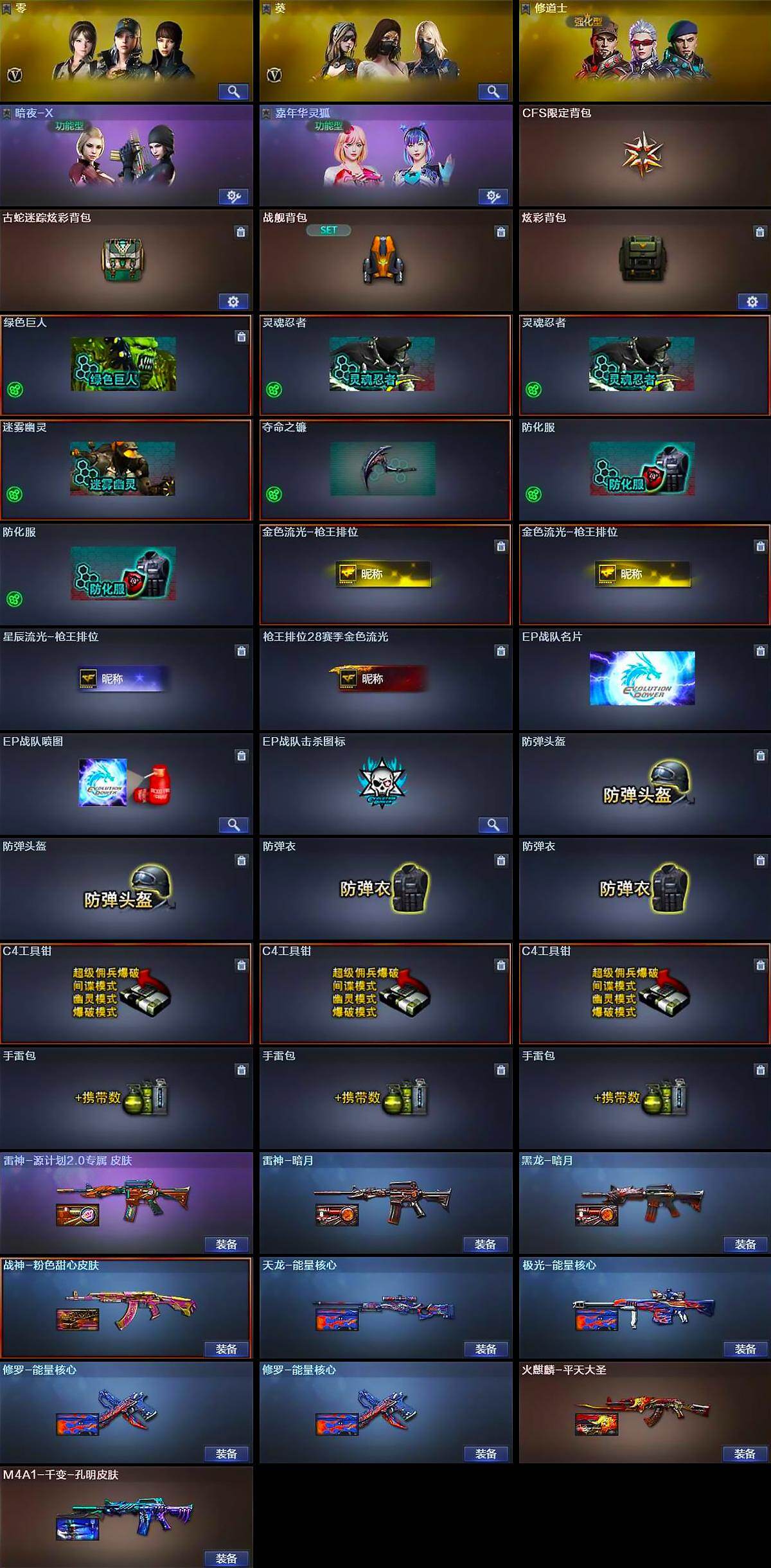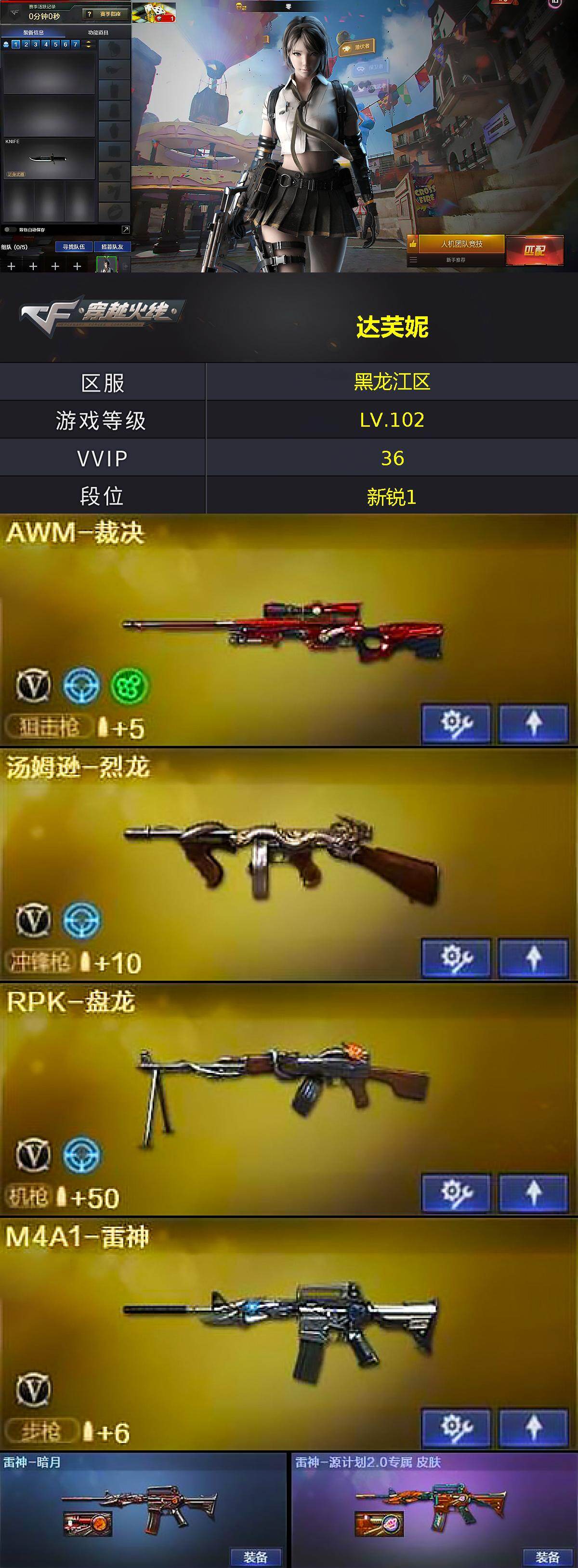 黑龙江区-37v-4王者武器数-0炫金武器数 【热门武器】:死亡之眼,m4a1-黑骑士,汤姆逊-烈龙,rpk-盘龙,加特林-炼狱2,沙鹰-修罗4 【王者炫金武器】:玫瑰精灵-悦动3,炼狱-悦蓝 【皮肤】:雷神-暗月,雷神-源计划2.0专属 皮肤,火麒麟-平天大圣,毁灭-英雄计划 皮肤,m4a1-千变-孔明皮肤,黑龙-暗月,战神-粉色甜心皮肤,天龙-能量核心,极光-能量核心,修罗-能量核心