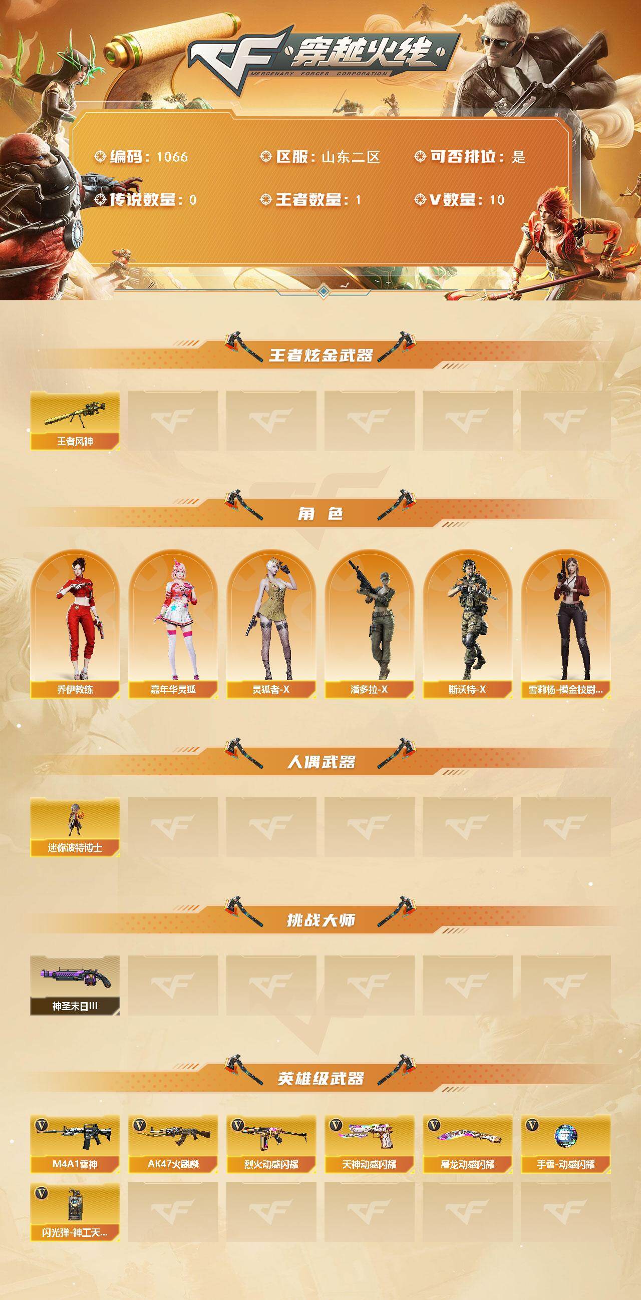 [16722752]山东二区-11v-1王者武器数-0炫金武器数 【王者炫金武器】:王者风神 【角色】:乔伊教练,嘉年华灵狐,灵狐者-x,潘多拉-x,斯沃特-x,雪莉杨-摸金校尉 【人偶武器】:迷你波特博士 【挑战大师】:神圣爆裂者-末日iii 【英雄级武器】:ak47-火麒麟,m4a1-雷神,烈火-动感闪耀,天神-动感闪耀,屠龙-动感闪耀,手蕾-动感闪耀,闪光丹-神工天巧 【道具】:云山科技背包,云海游龙炫彩背包,超级背包,女皇终结者-魔龙之吻,救世主-黑桃战神,绿色巨人,灵魂忍者,迷雾幽灵,夺命之镰,防化服3,金色流光-呛王排位2,星辰流光-呛王排位,呛王排位28赛季金色流光,动感闪耀表情,防弹头盔4,防弹衣4,c4工具钳4,手蕾包4 【特殊呛械】: