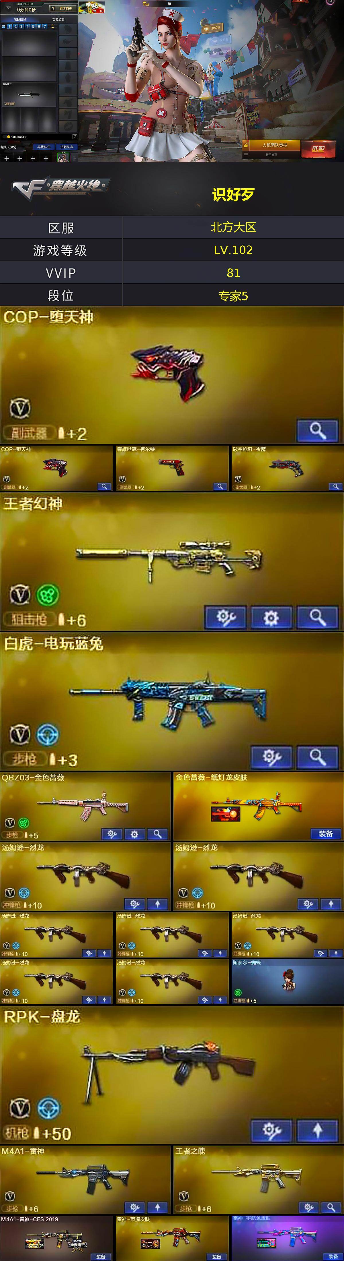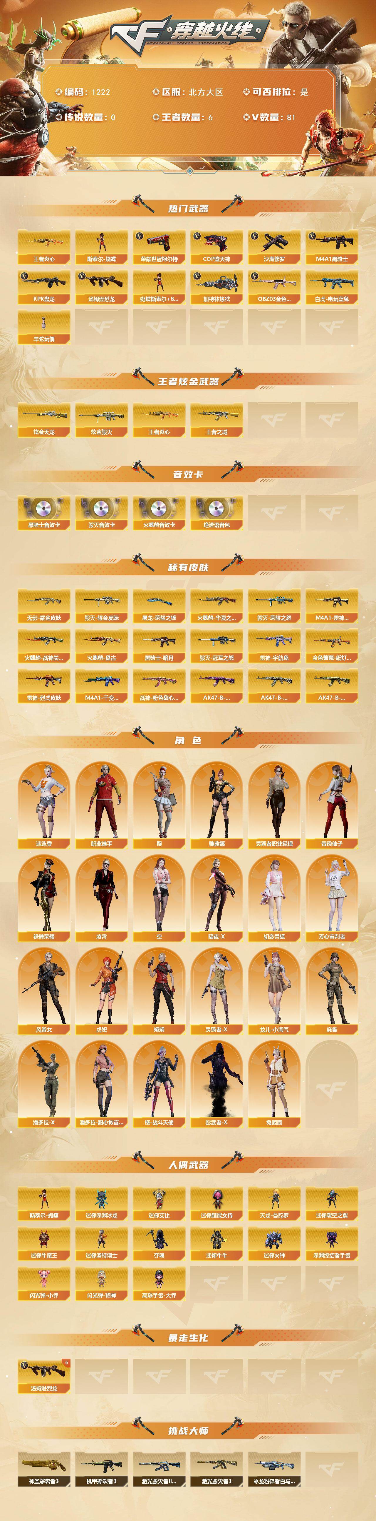 [16723408]北方大区-85v-6王者武器数-2炫金武器数 【热门武器】:q03-金色蔷薇,白虎-电玩蓝兔,荣耀世冠-柯尔特,王者炎心,m4a1-黑骑士,汤姆逊-烈龙7,rpk-盘龙,加特林-炼狱,斯泰尔-蝴蝶,羊驼玩偶,cop-堕天神2,沙鹰-修罗3 【王者炫金武器】:王者之城,王者炎心,炫金毁灭,炫金天龙 【音效卡】:ak47-火麒麟音效卡,m4a1-黑骑士音效卡,barrett-毁灭音效卡,绝迹语音包 【皮肤】:金色蔷薇-纸灯龙皮肤,m4a1-雷神-cfs 2019,雷神-烈虎皮肤,雷神-宇航兔皮肤,火麒麟-华夏之心,火麒麟-战神关羽,火麒麟-盘古,毁灭-荣耀之怒,毁灭耀金皮肤,毁灭-冠军之怒,m4a1-千变-孔明皮肤,黑骑士-暗月,无影耀金皮肤,战神-粉色甜心皮肤,ak47-b-常胜将军-曹操4,ak47-b-常胜将军-刘备,ak47-b-常胜将军-孙权3,屠龙-荣耀之锋 【角色】:樱,迷迭香,凌霄,空,暗夜-x,初恋灵狐,芳心审判者,风暴女,虎妞,娟娟,灵狐者-x,灵狐者-职业经理,龙儿-小淘气,麻雀,潘多拉-x,潘多拉-甜心教官,青霞仙子,铁骑荣耀,兔囡囡,樱-战斗天使,影武者-x,职业选手,雅典娜 【人偶武器】:天龙-曼陀罗,斯泰尔-蝴蝶,迷你深渊冰龙,迷你裂空之翼,迷你牛魔王,迷你波特博士,夺魂,迷你牛牛,迷你火种,深渊终结者手蕾,闪光丹-小乔,闪光丹-貂蝉,高爆手蕾-大乔,迷你艾比,迷你超能女侍 【挑战大师】:神圣爆裂者iii,冰龙粉碎者-白马银呛2,激光毁灭者iii-白马银呛2,激光毁灭者iii,机甲撕裂者iii 【英雄级武器】:m4a1-千变2,ak47-火麒麟,m4a1-雷神,m4a1-黑骑士,ak47-无影,ak47-黑武士,m4a1-龙血,m4a1-夜魔,q03-金色蔷薇,王者之魄-觉醒版,ak-47-猩红传说,ak47-b-常胜将军,白虎-电玩蓝兔,黑武士-cf网剧冠军,barrett-毁灭3,barrett-极光,王者之怒-觉醒版,王者幻神-觉醒版,rpk-盘龙,加特林-炼狱,汤姆逊-烈龙7,aa-12-雷霆,沙鹰-修罗3,沙鹰-天神,cop-堕天神2,荣耀世冠-柯尔特,破空呛刃-夜魔,天神-cf网剧冠军,屠龙2,马来剑-夜魔,幻灵之锋,斩神刀-雷暴,擎天-cf网剧冠军,王者之啸-觉醒版,高爆手蕾-雷暴3,高爆