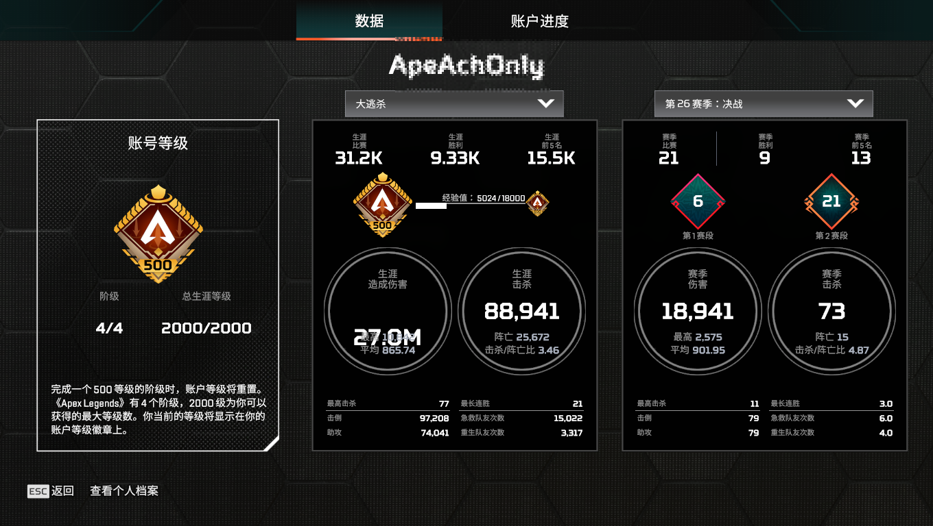 [13115262]gk6283/【第3赛季动态猎杀猎杀尾气/第21/22/23静态猎杀标/生涯8w8击杀/机器人生涯1w4击杀/艾许生涯2w1击杀/奶妈生涯2w5击杀】【账号还有300传家宝碎片相当于满传满威望/匕首,爪刀配件已经全部解锁/2128金皮/2-4/7-25赛季满通】【各种高质量金皮,特殊入厂动作,伪满通账号,骷髅海基本都有,场均也不错,细节可上号查看】