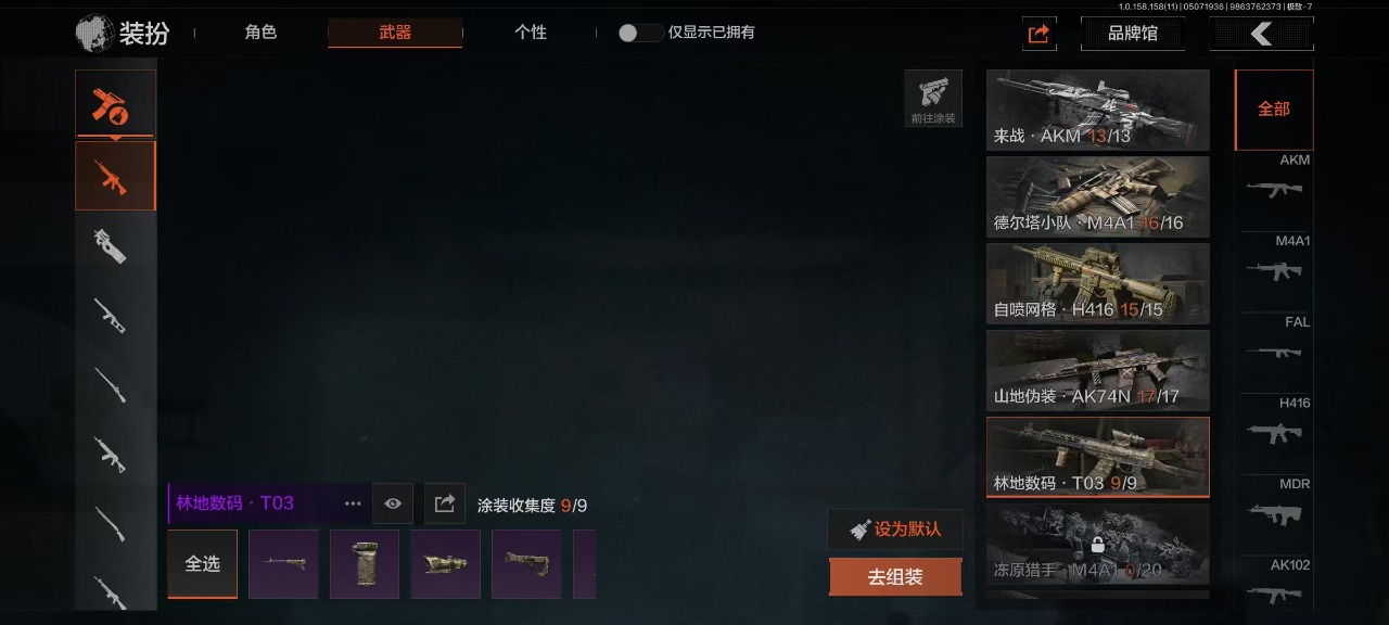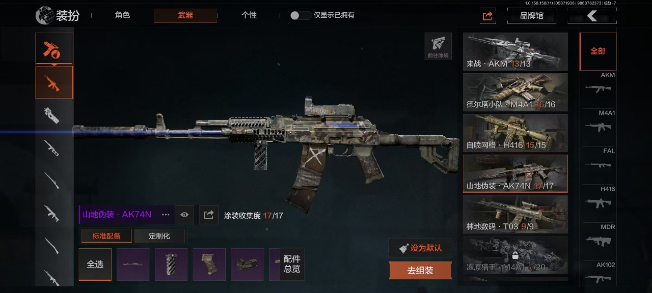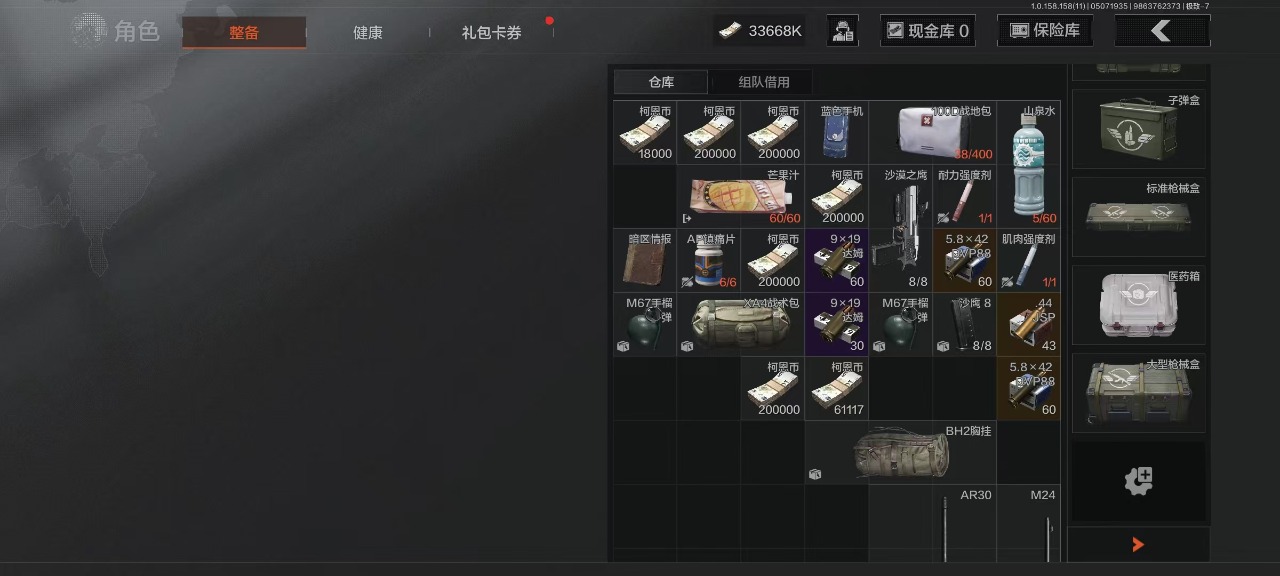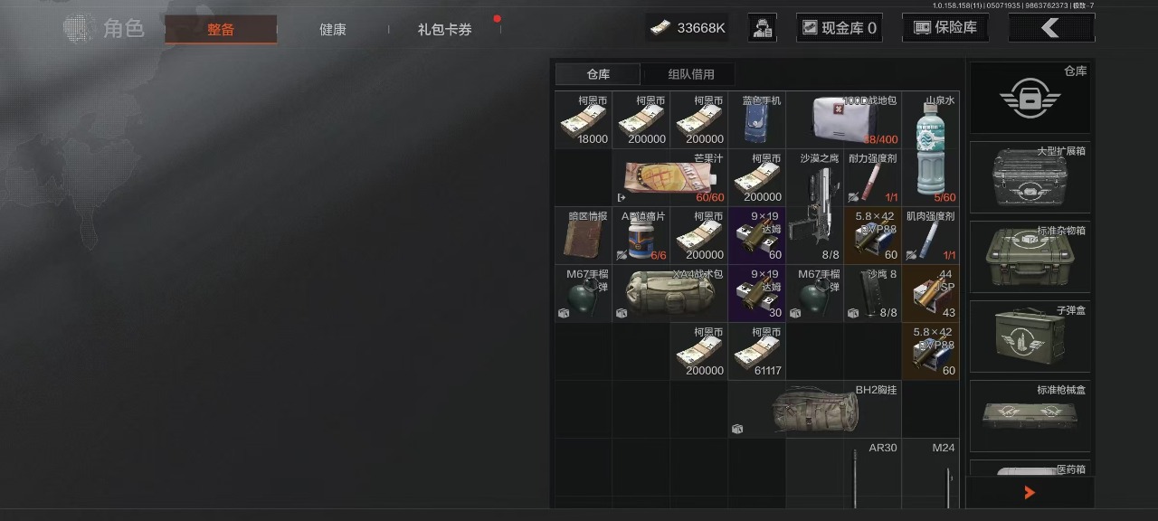 可二次 柯恩币数量:33668 仓库价值:38.3 近战武器:工兵铲来战·开山刀 紫色呛皮:山地伪装·ak74n林地数码·t03德尔塔小队·m4a1自喷网格·h416来战·akm