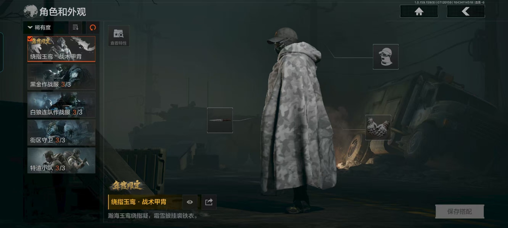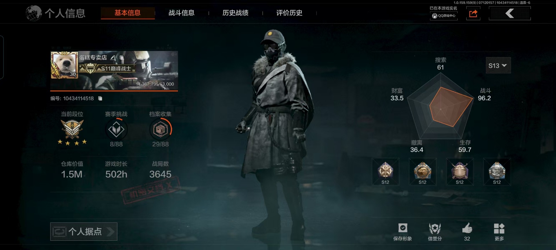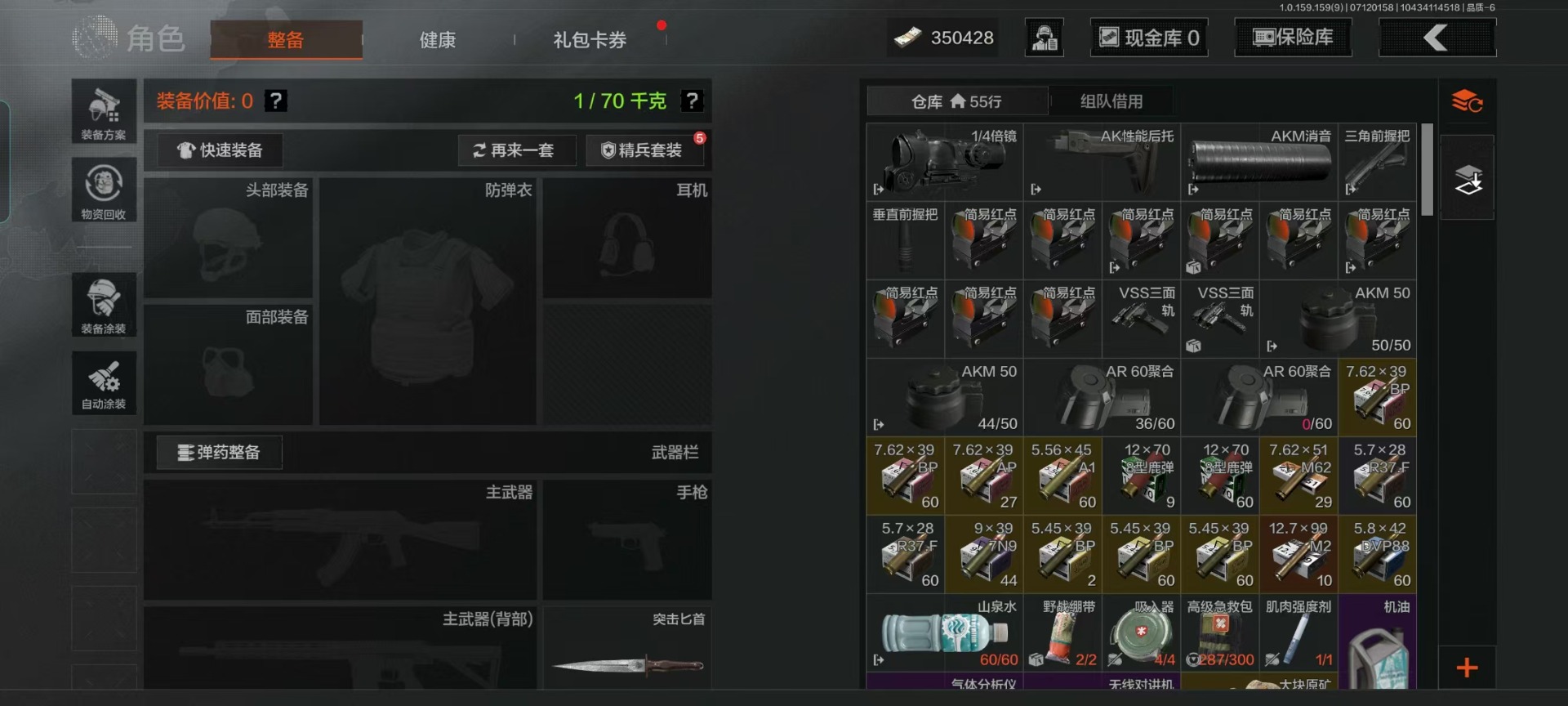 [10018452]可二次 可修改实名 柯恩币数量:350428 仓库价值:1.5 角色装扮(金):绕指玉鸾·战术甲胄 近战武器:突击匕首三尺万仞·战术剑工兵铲 手套:玉鸾挂枝·手套 金色呛皮:长缨风掣·rpk16长缨风掣·ax50 紫色呛皮:娜迦·rpk16