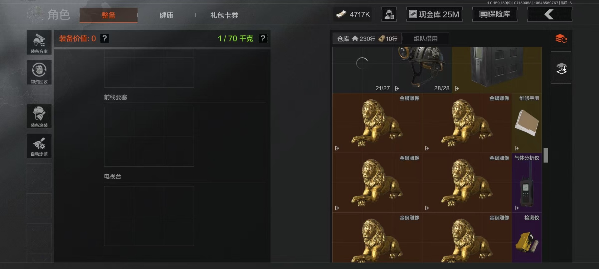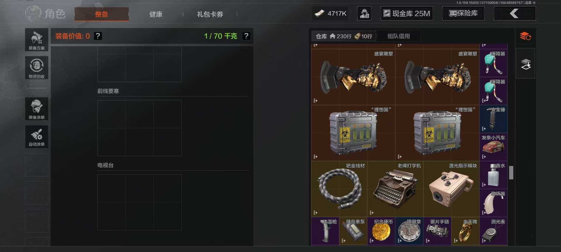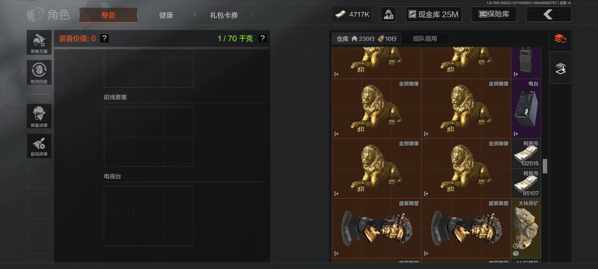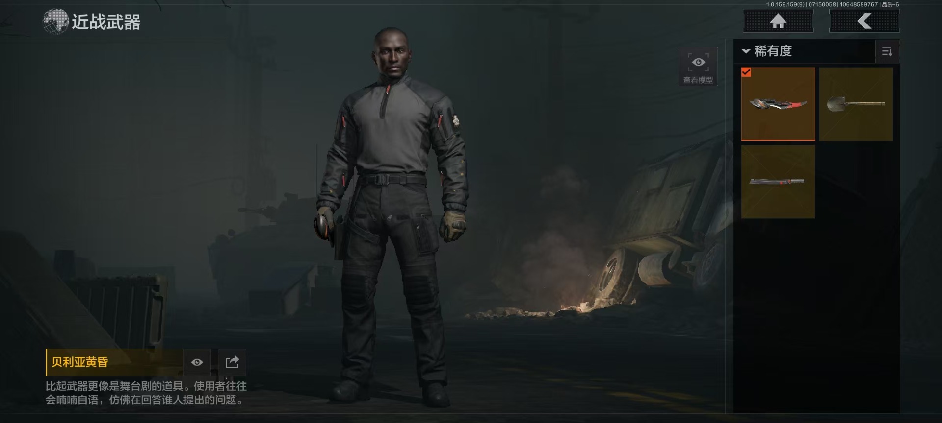 [10024125]可二次 可修改实名 柯恩币数量:4717 仓库价值:126.4 近战武器:贝利亚黄昏工兵铲来战·开山刀