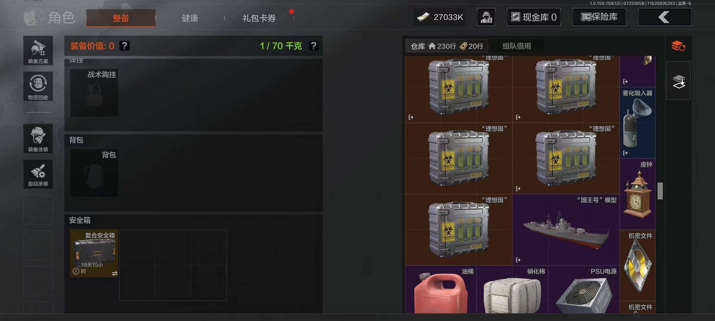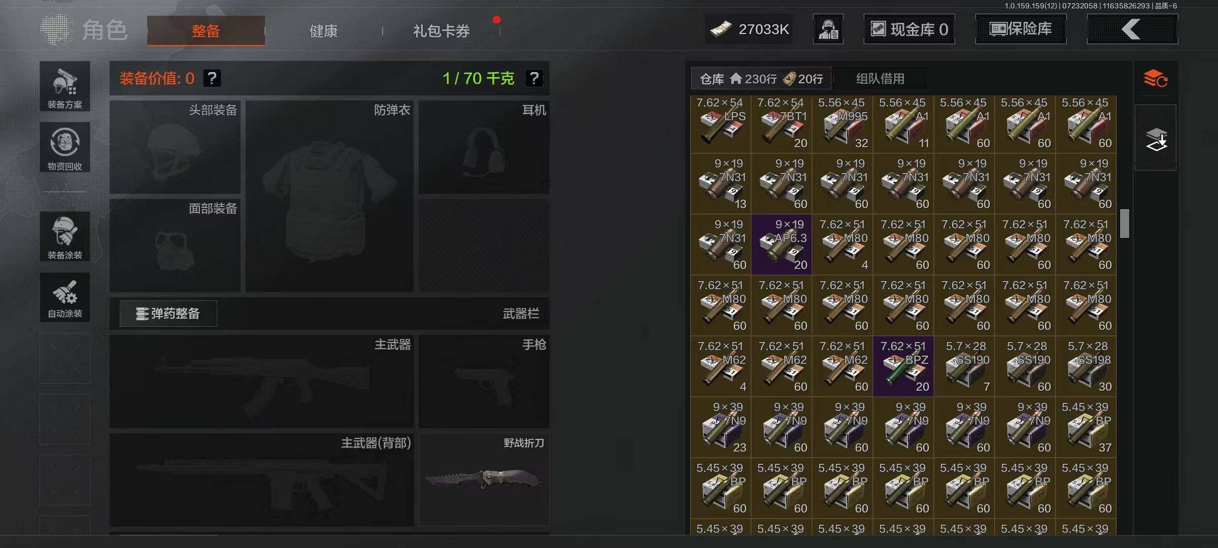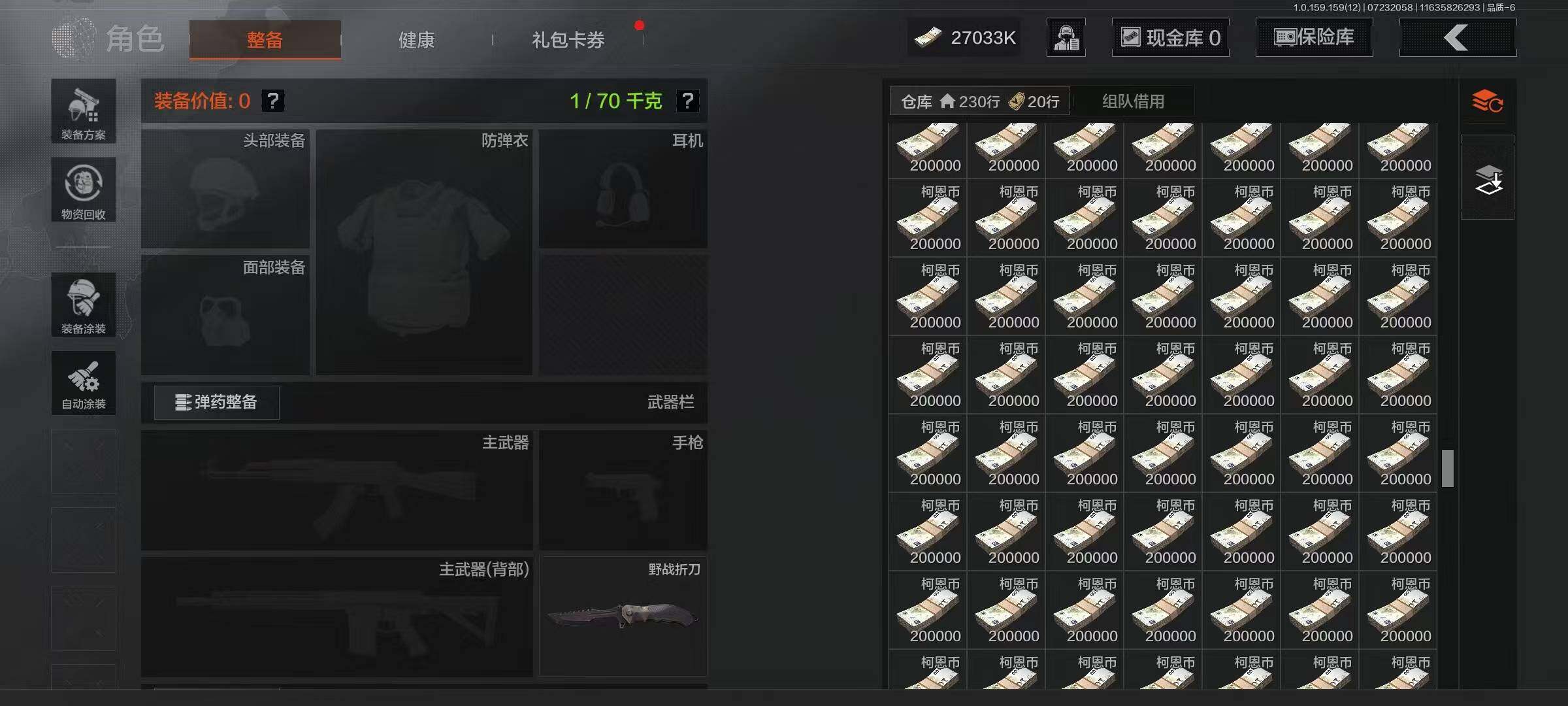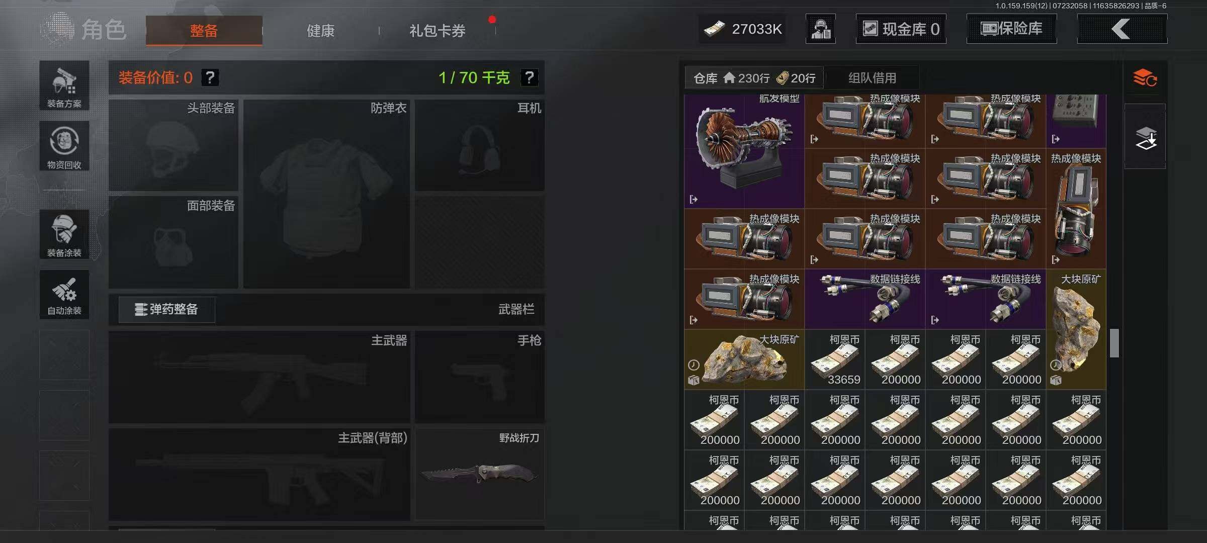 [10090129]暗区 可二次 欧皇摸金号 多大金 多现金 1刀 1金衣 野战折刀 苍白隐者·伪装服 火力倾泻·akm 竞技·m4a1 钢铁真理·f2000 涂绘猎人·ar57 最后防线·aek 雪原凌锋·svds 旗帜·rpk16 理想国