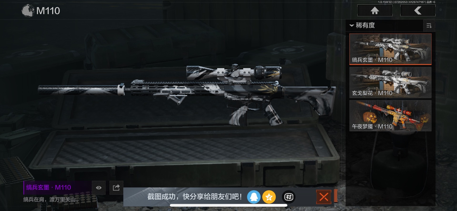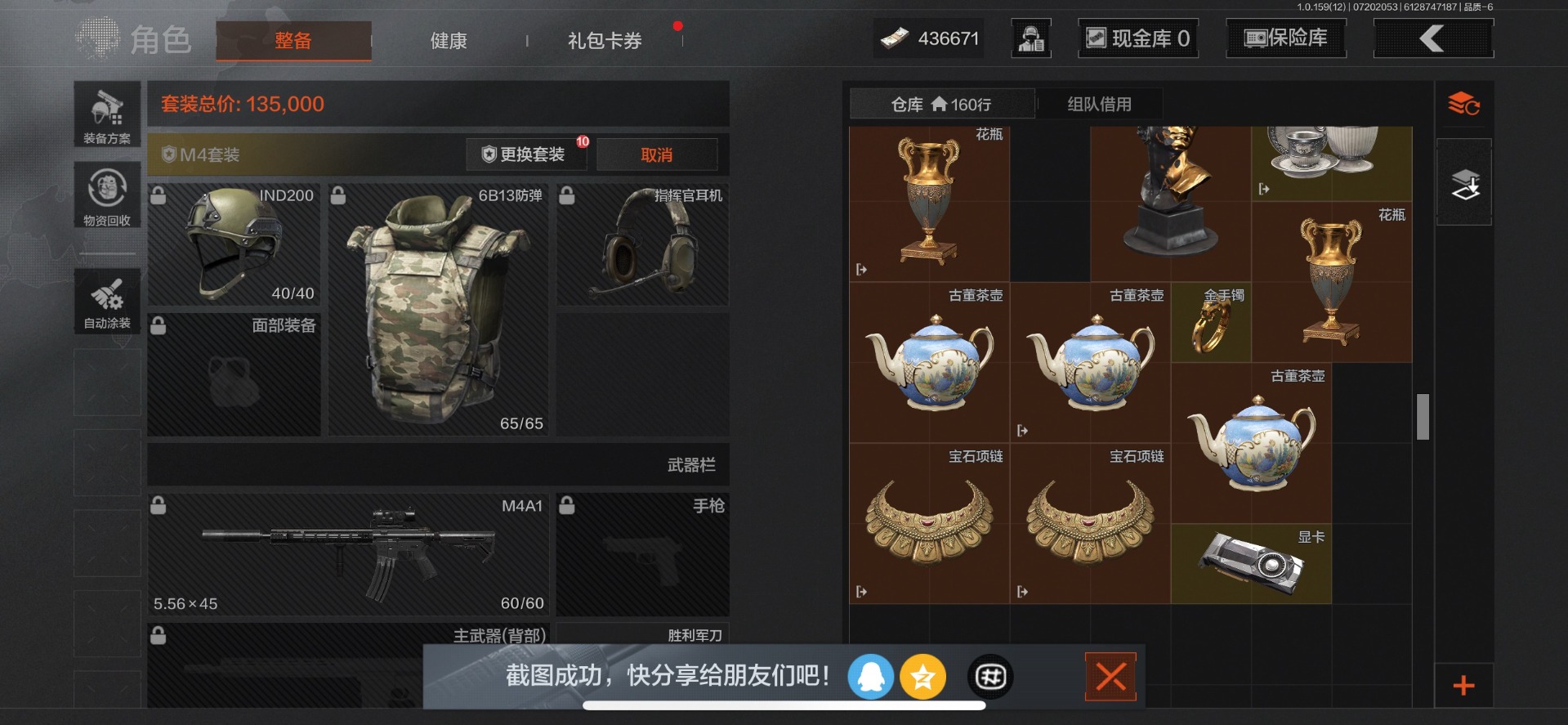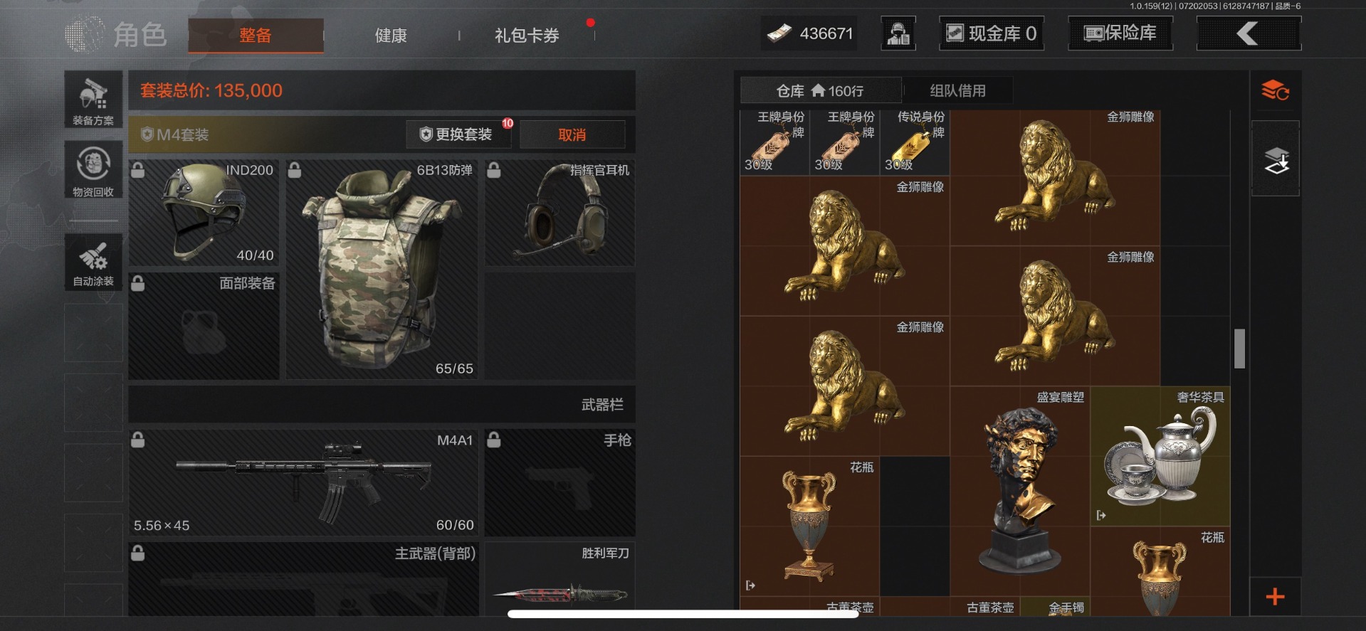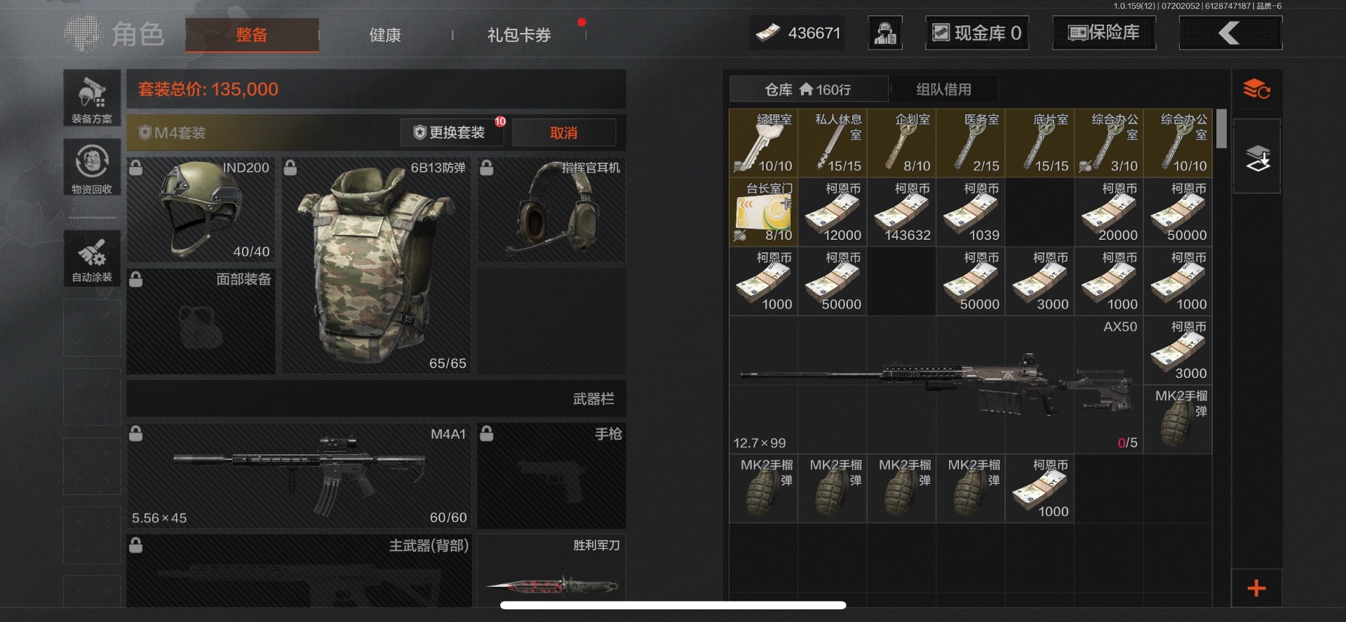 可二次 可修改实名 柯恩币数量:436671 仓库价值:10.7 近战武器:工兵铲来战·开山刀胜利军刀 金色呛皮:长缨风掣·rpk16冻原猎手·m4a1冬夜·ak12蓝色咆哮·h416 紫色呛皮:07式林地迷彩·q191玄戈梨花·m110玄戈梨花·vss骑士之剑·sj16缟兵玄