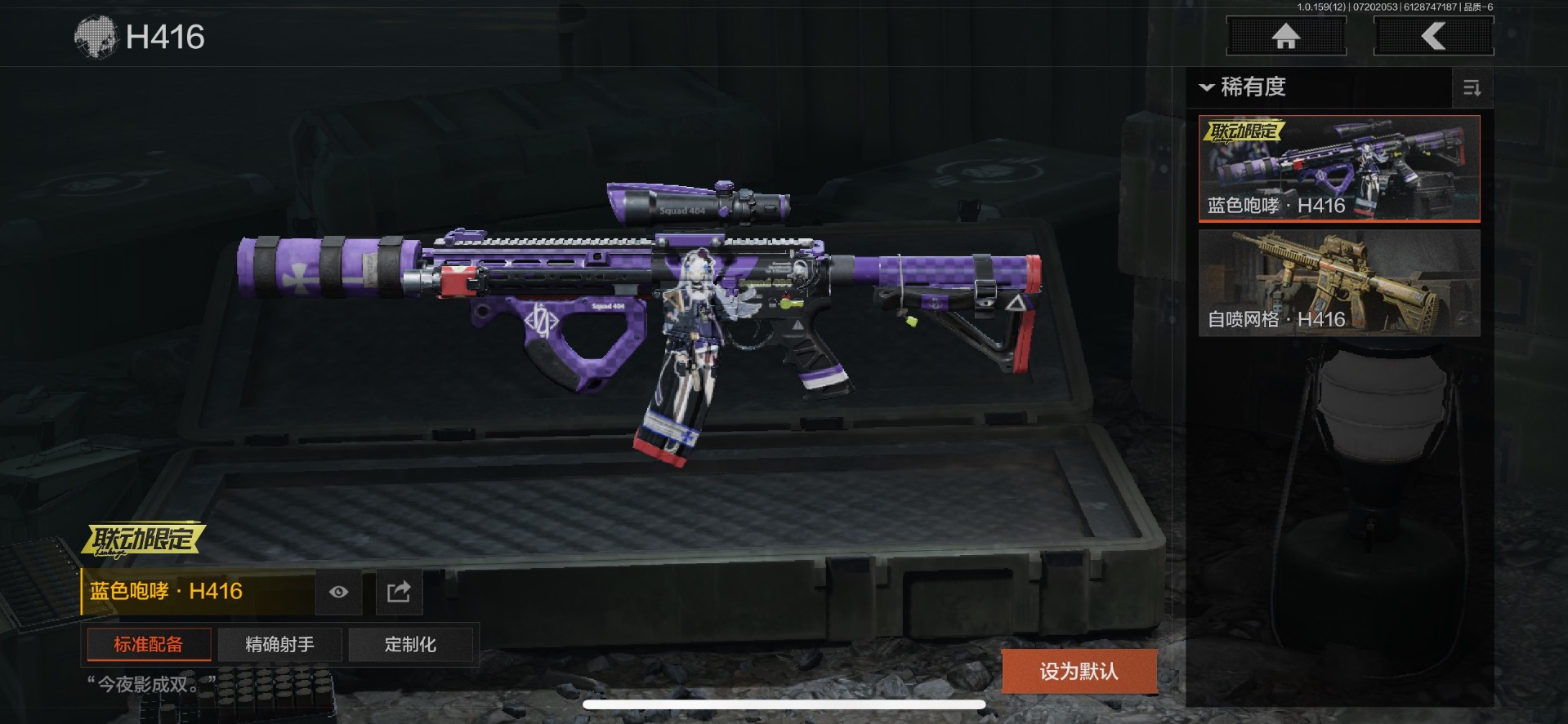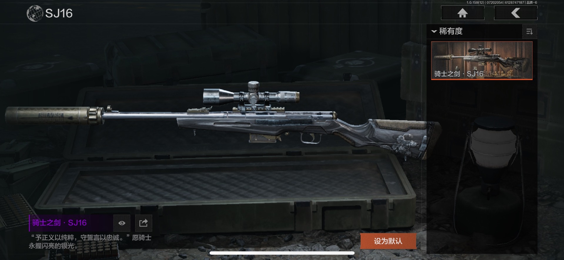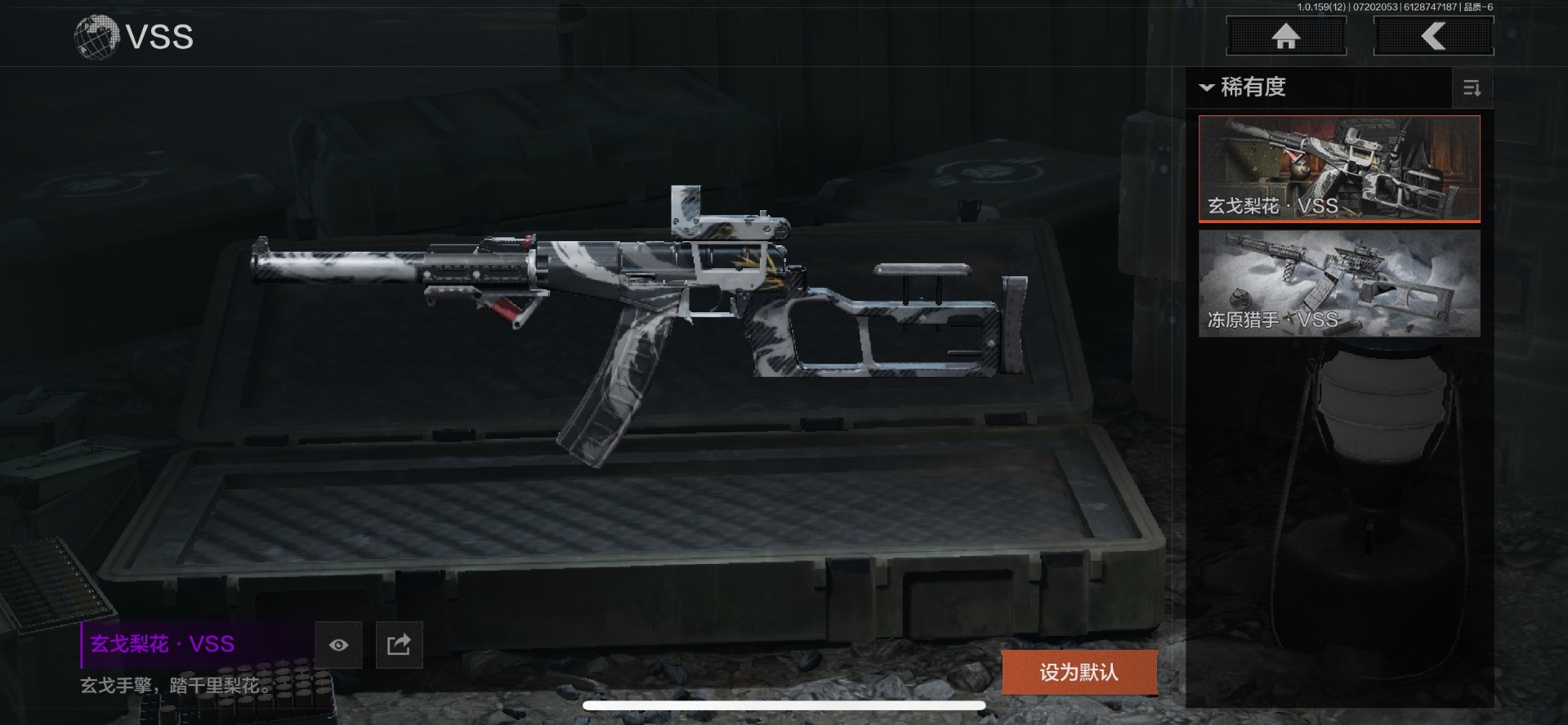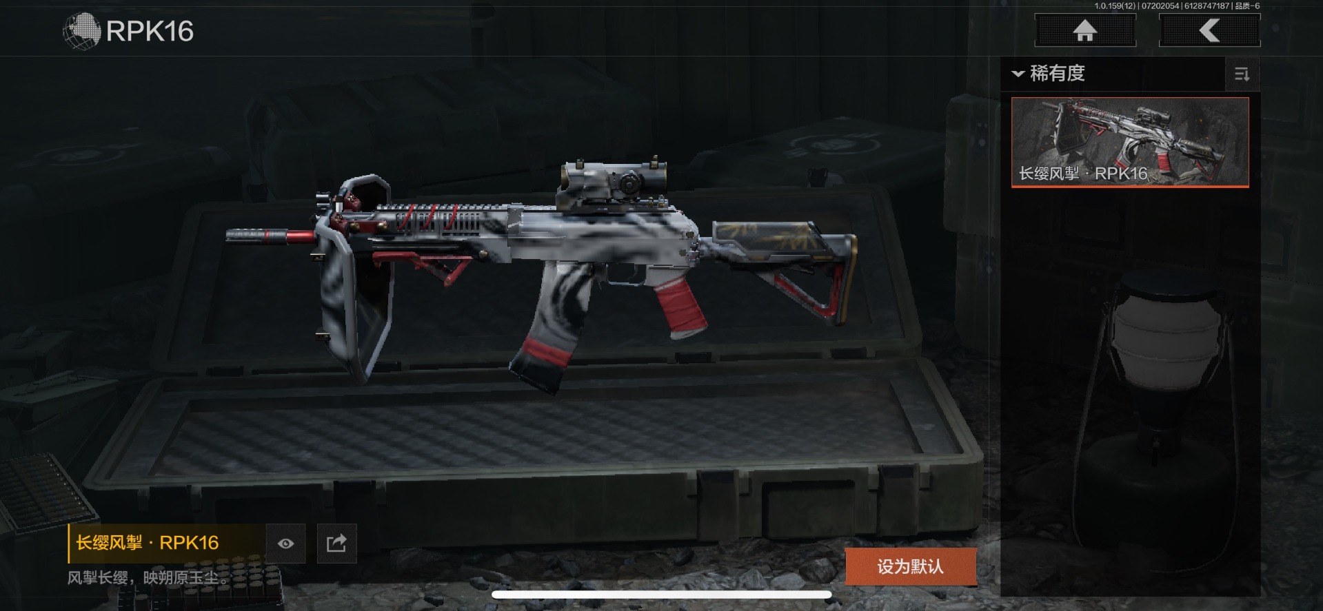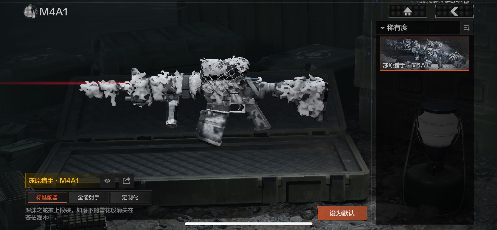 可二次 可修改实名 柯恩币数量:436671 仓库价值:10.7 近战武器:工兵铲来战·开山刀胜利军刀 金色呛皮:长缨风掣·rpk16冻原猎手·m4a1冬夜·ak12蓝色咆哮·h416 紫色呛皮:07式林地迷彩·q191玄戈梨花·m110玄戈梨花·vss骑士之剑·sj16缟兵玄