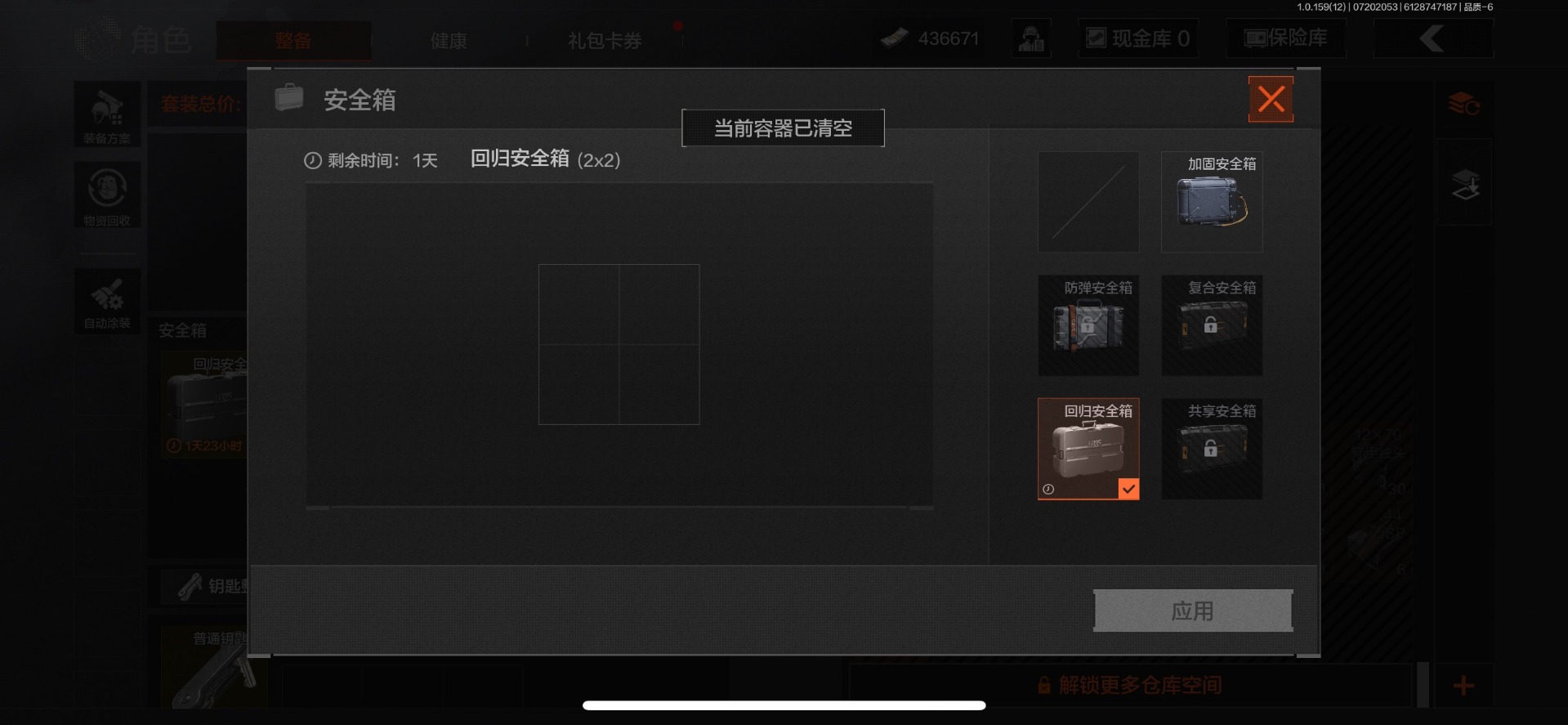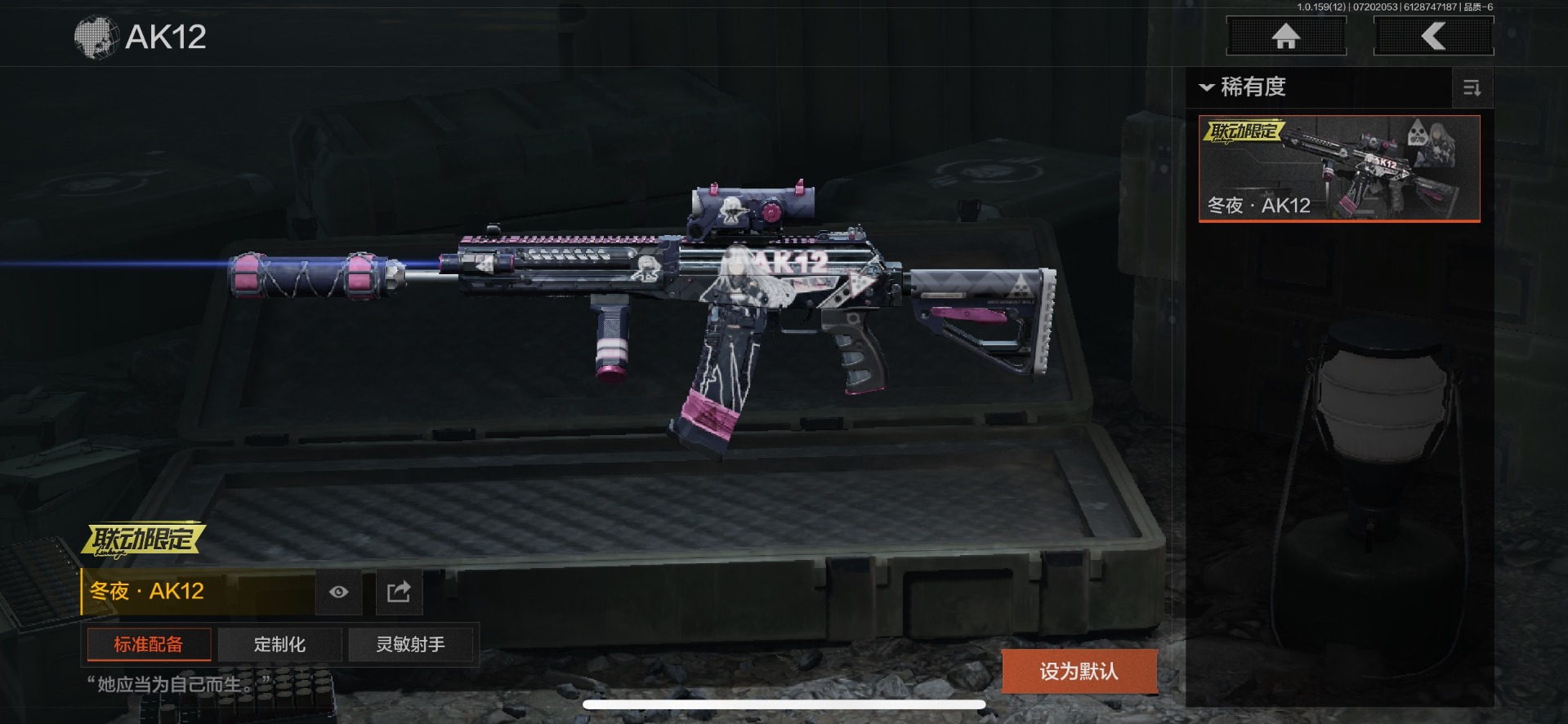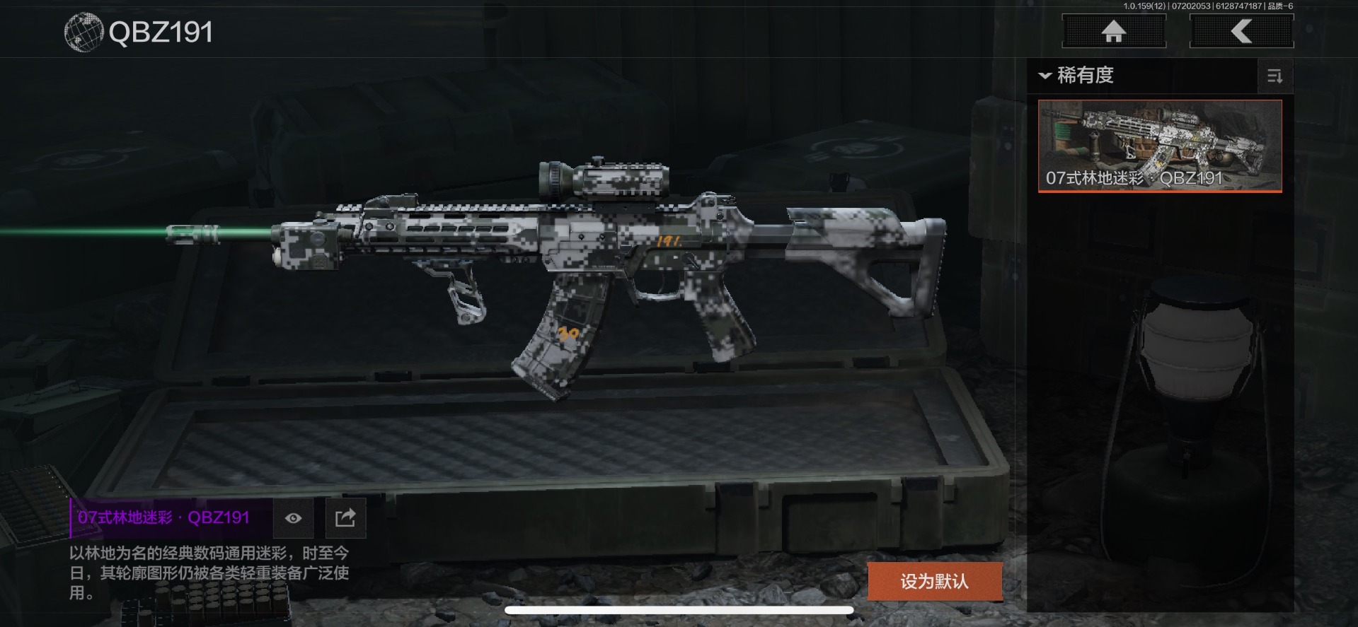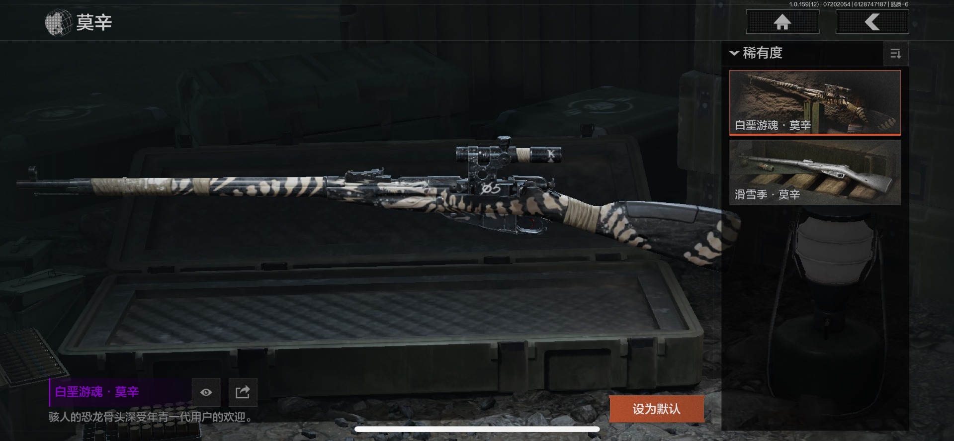 可二次 可修改实名 柯恩币数量:436671 仓库价值:10.7 近战武器:工兵铲来战·开山刀胜利军刀 金色呛皮:长缨风掣·rpk16冻原猎手·m4a1冬夜·ak12蓝色咆哮·h416 紫色呛皮:07式林地迷彩·q191玄戈梨花·m110玄戈梨花·vss骑士之剑·sj16缟兵玄