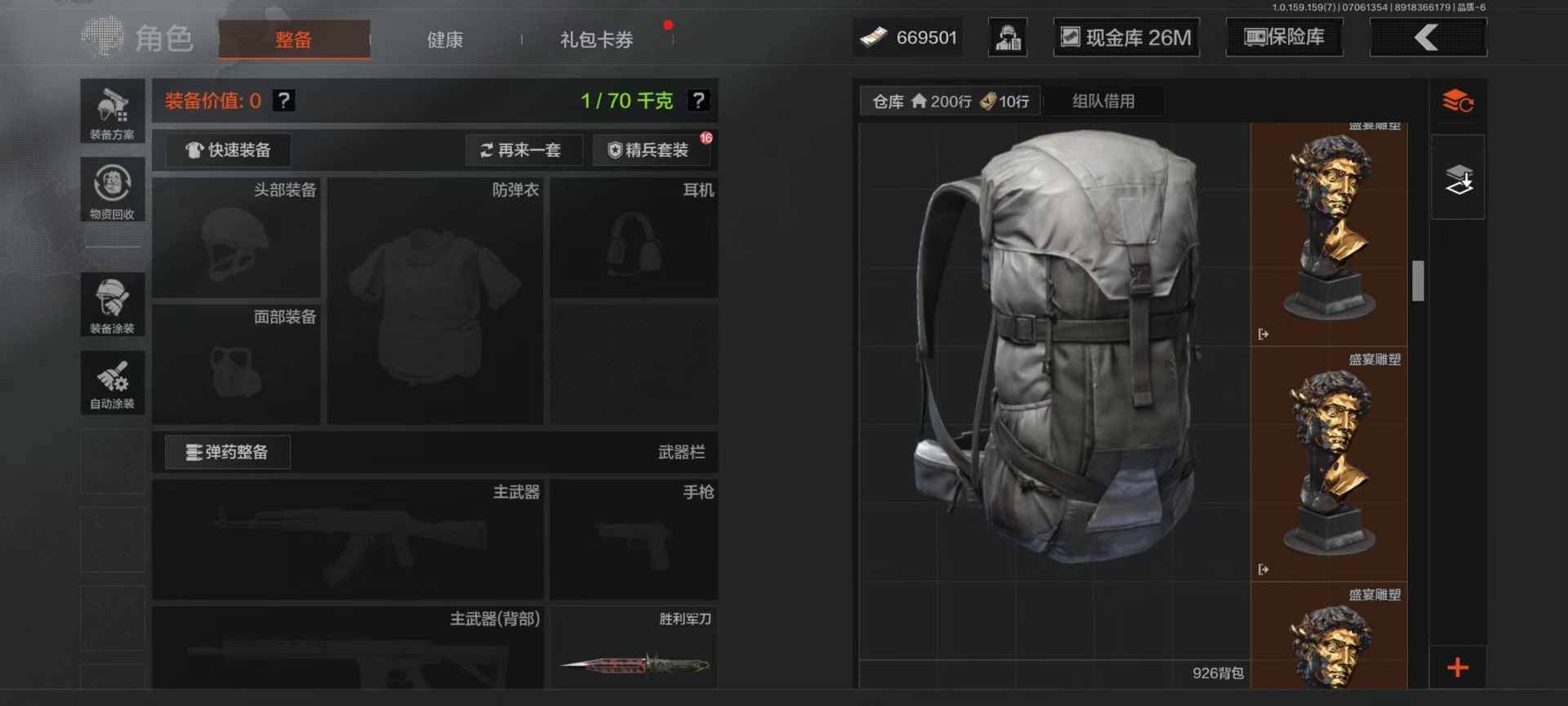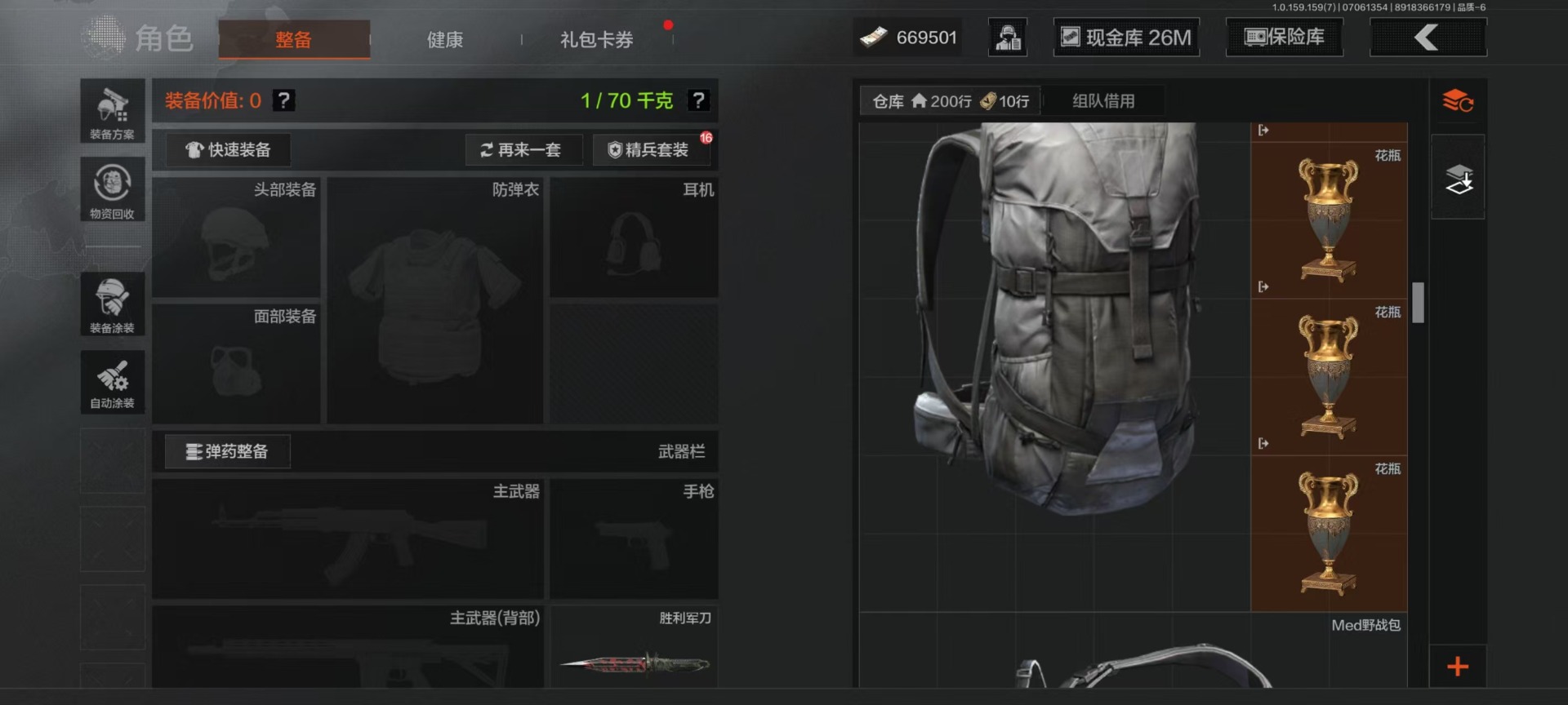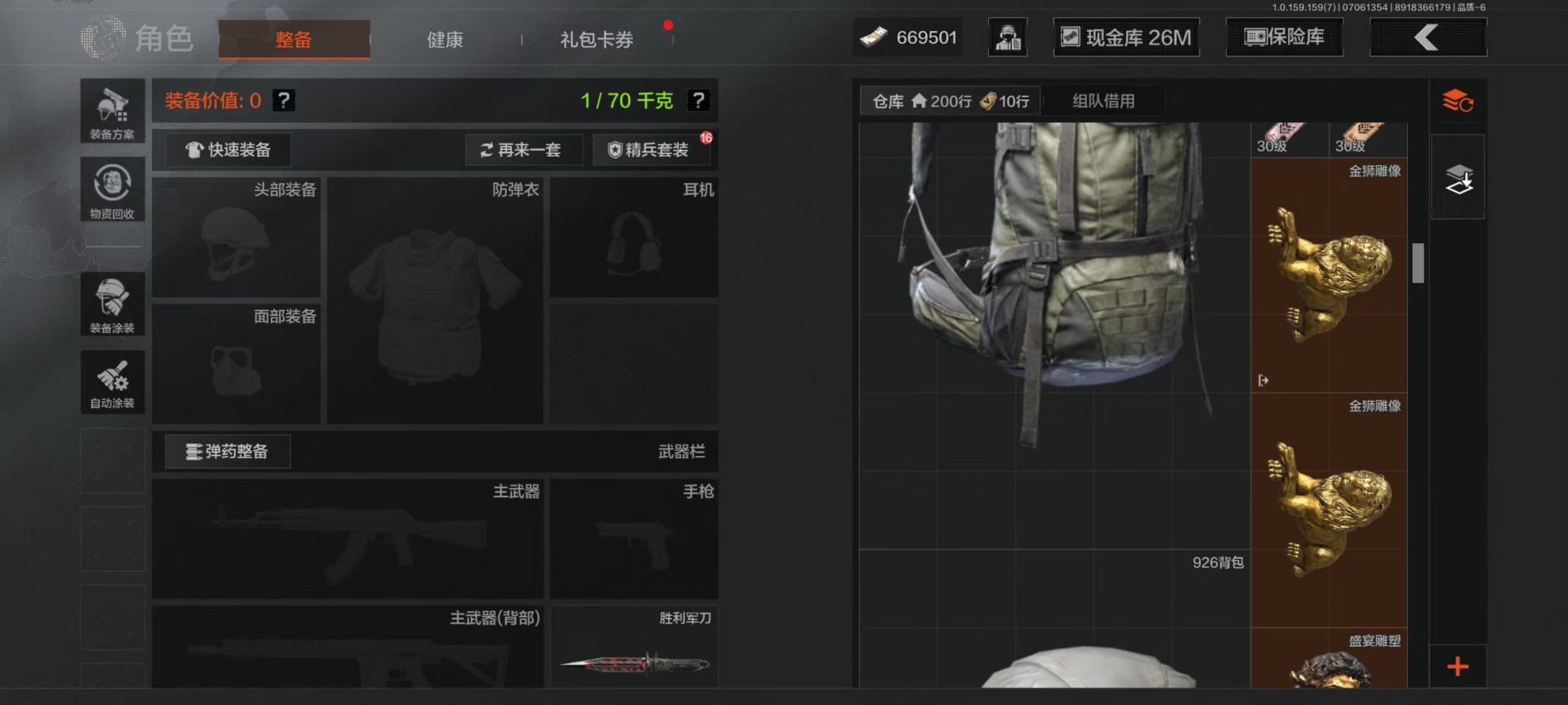 [10147009]可二次 可修改实名 柯恩币数量:669501 仓库价值:53.7 角色装扮(金):苍白隐者·伪装服绅士西服 近战武器:寒牙手刺工兵铲来战·开山刀胜利军刀裁决手杖剑 金色呛皮:午夜梦魇·fal 紫色呛皮:07式林地迷彩·q191缟兵玄墨·akm山地伪装·ak74n和平之手·fal禁止访问·ump45白色丧钟·莫辛雪原凌锋·ak74n雪原凌锋·svds雪山之王·f2000雪山之王·m缟兵玄墨·t03林地数码·t03逆火·mdr巅峰·m4a1自喷网格·h416来战·akm全地形数码·m110午夜梦魇·m110来战·ak74n恶念·vect9 角色装扮(紫):台风ii竞技运动服秋日盛宴风衣万众狂欢套装