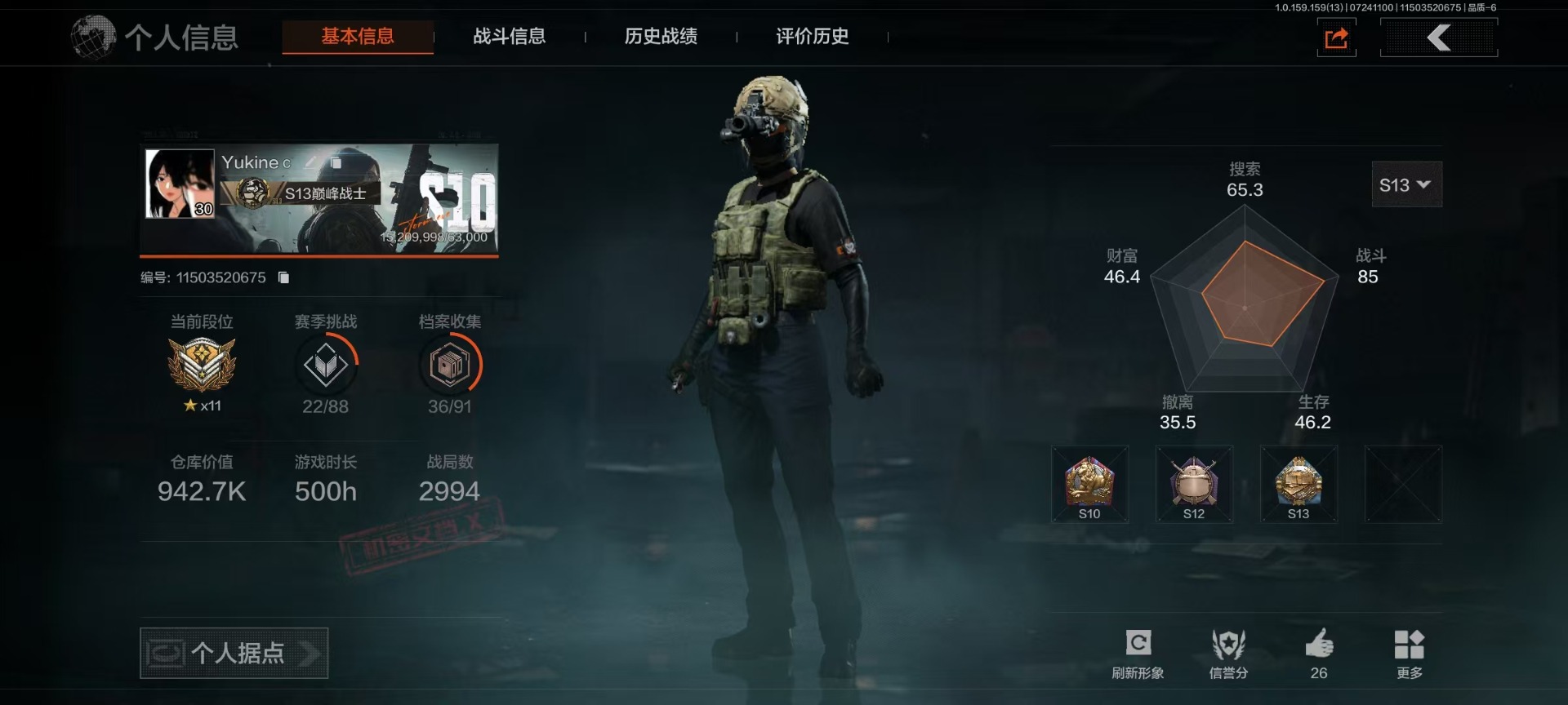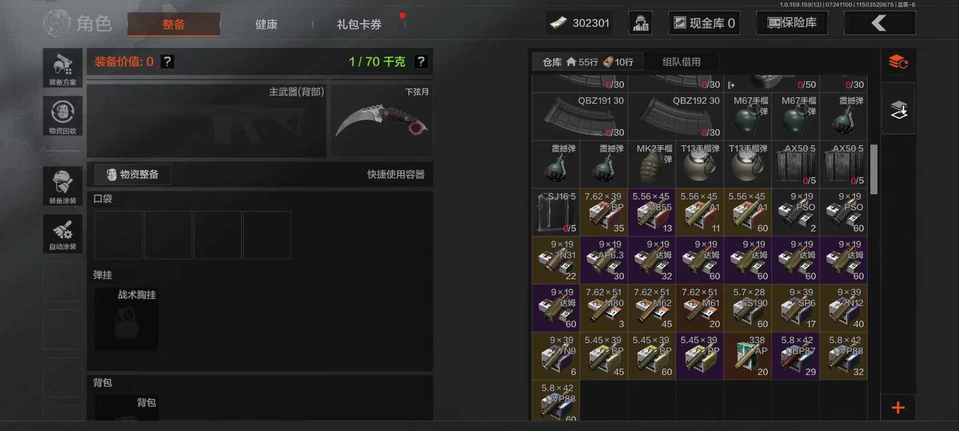 [10186246]可二次 可修改实名 柯恩币数量:302301 仓库价值:0.942 近战武器:工兵铲来战·开山刀下弦月 手套:噤声者作战手套 紫色呛皮:山地伪装·ak74n缟兵玄墨·akm无声暗月·ax50真实之眼spr310自喷网格·h416白垩游魂·莫辛恶念·vect9