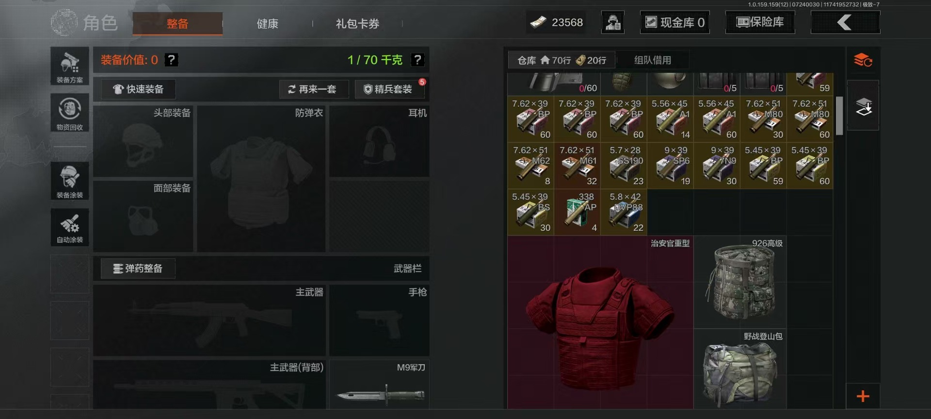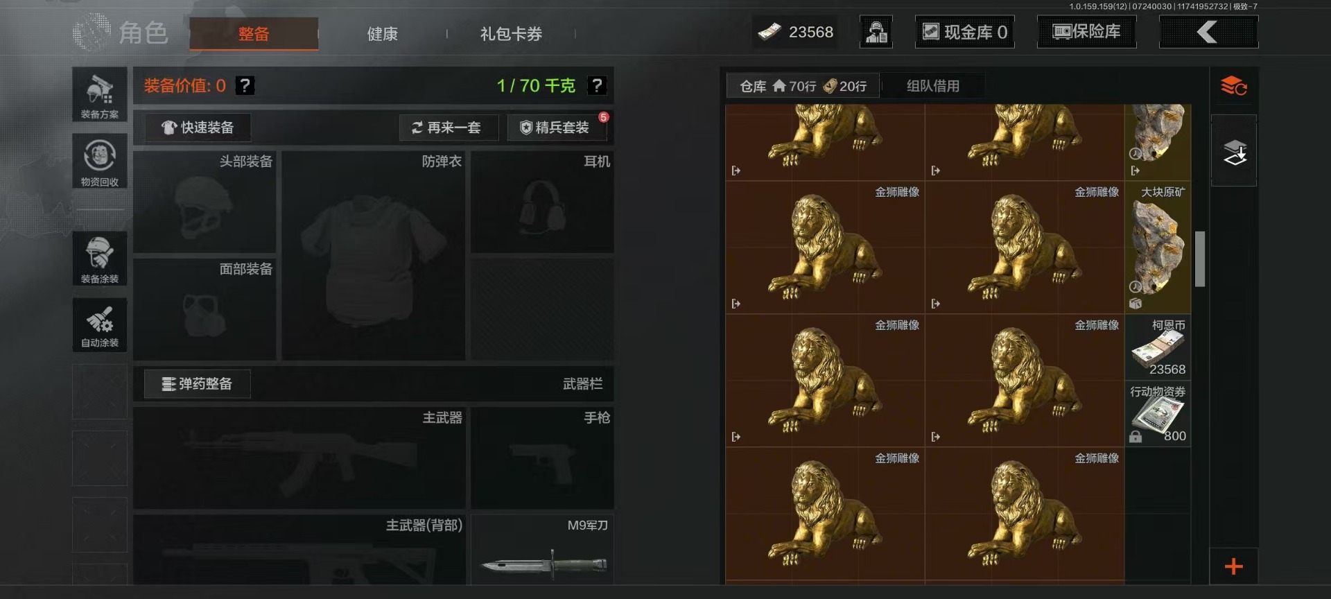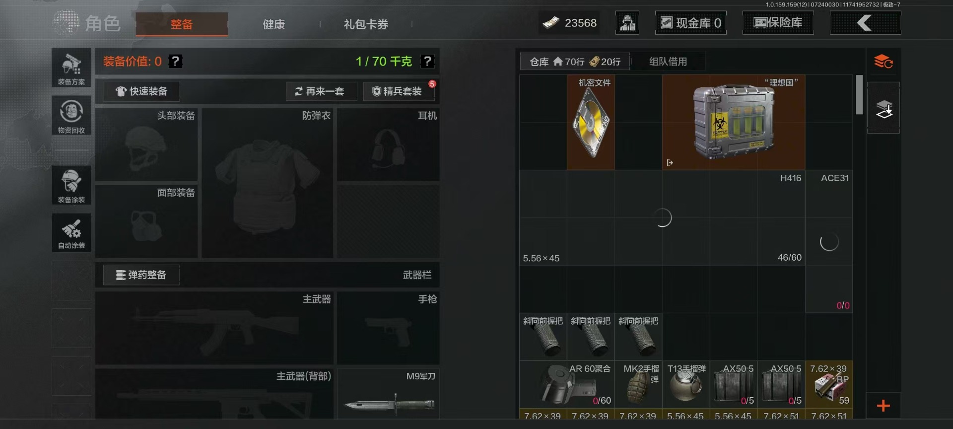 可二次 可修改实名 柯恩币数量:23568 仓库价值:39.7 近战武器:工兵铲 紫色呛皮:火力倾泻·akm迅影毒锋·ak12 角色装扮(紫):荣耀之熊作战套装 大金:理想国 机密文件