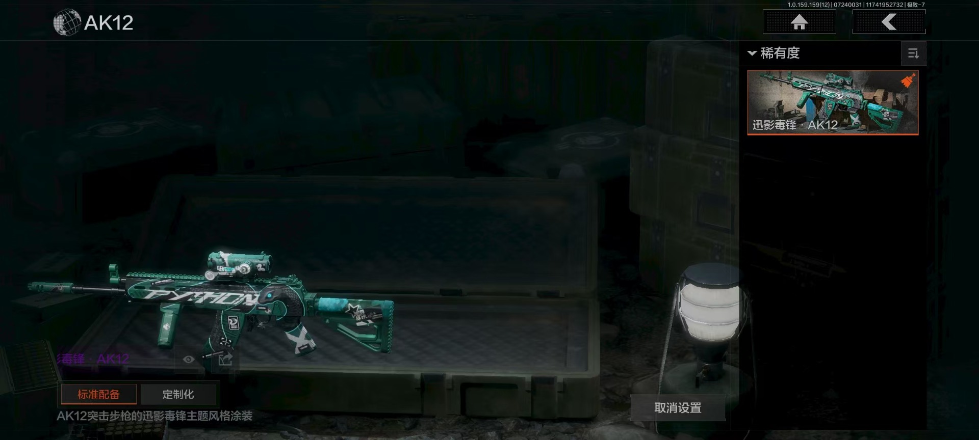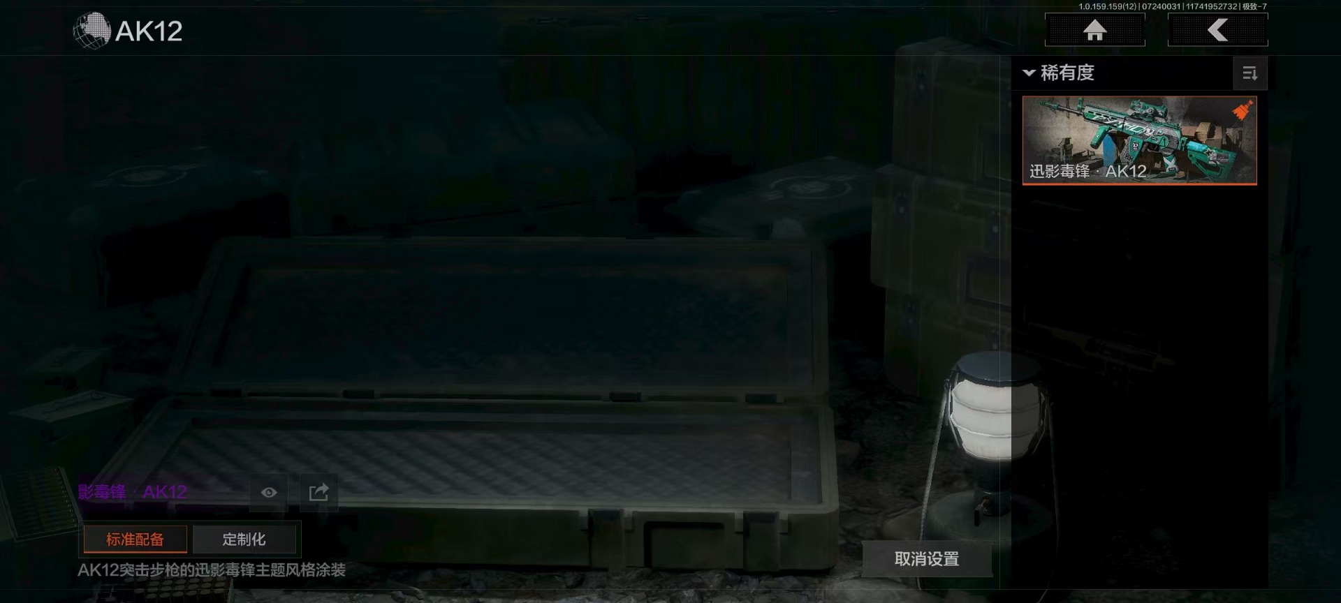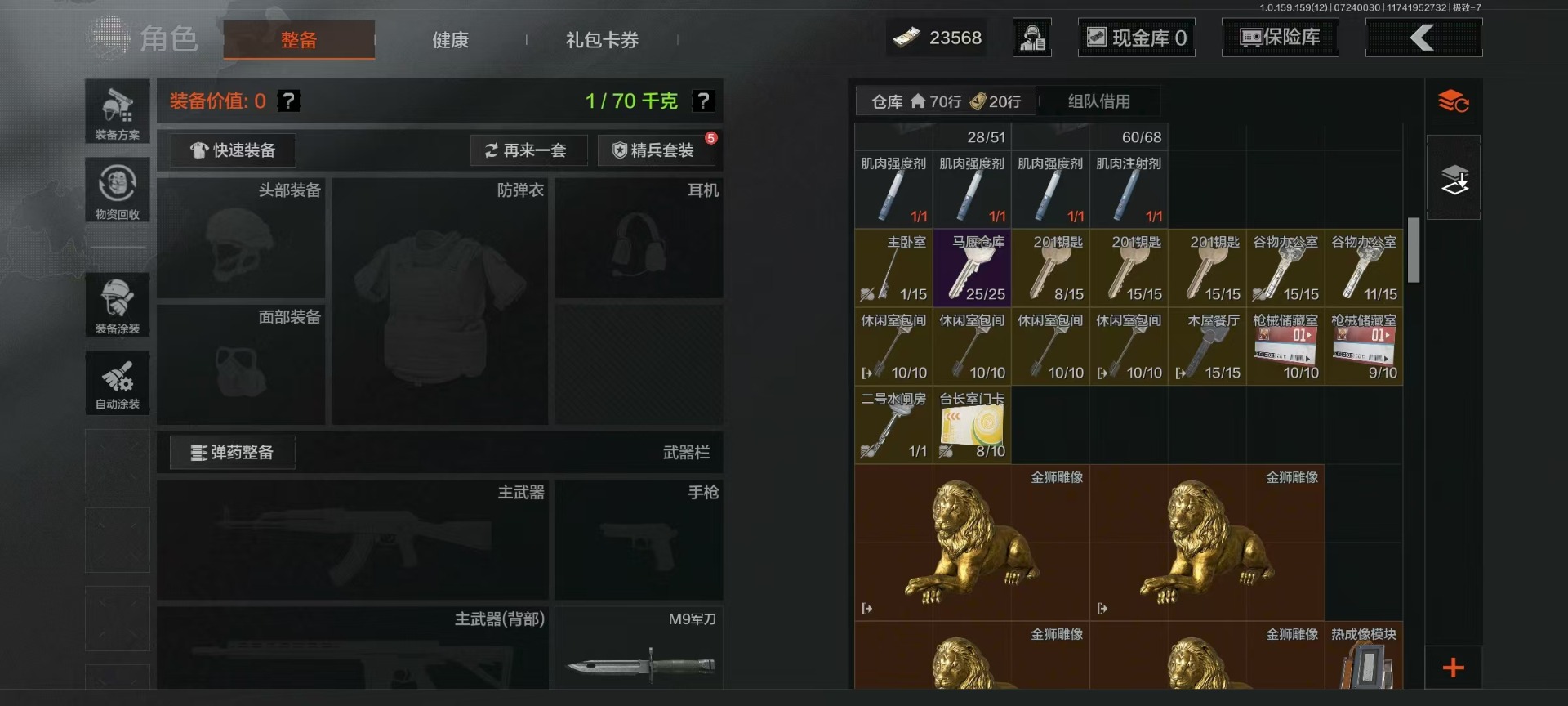 可二次 可修改实名 柯恩币数量:23568 仓库价值:39.7 近战武器:工兵铲 紫色呛皮:火力倾泻·akm迅影毒锋·ak12 角色装扮(紫):荣耀之熊作战套装 大金:理想国 机密文件