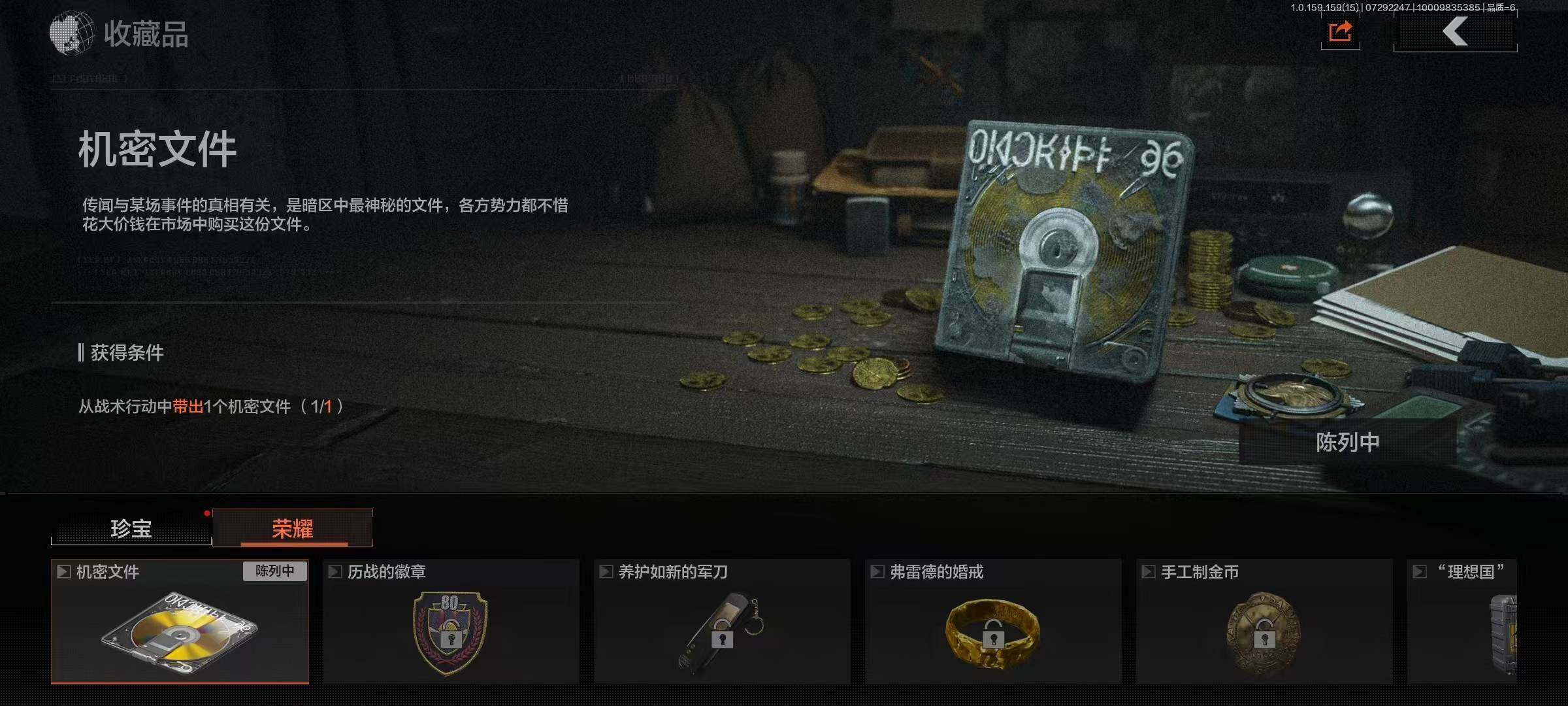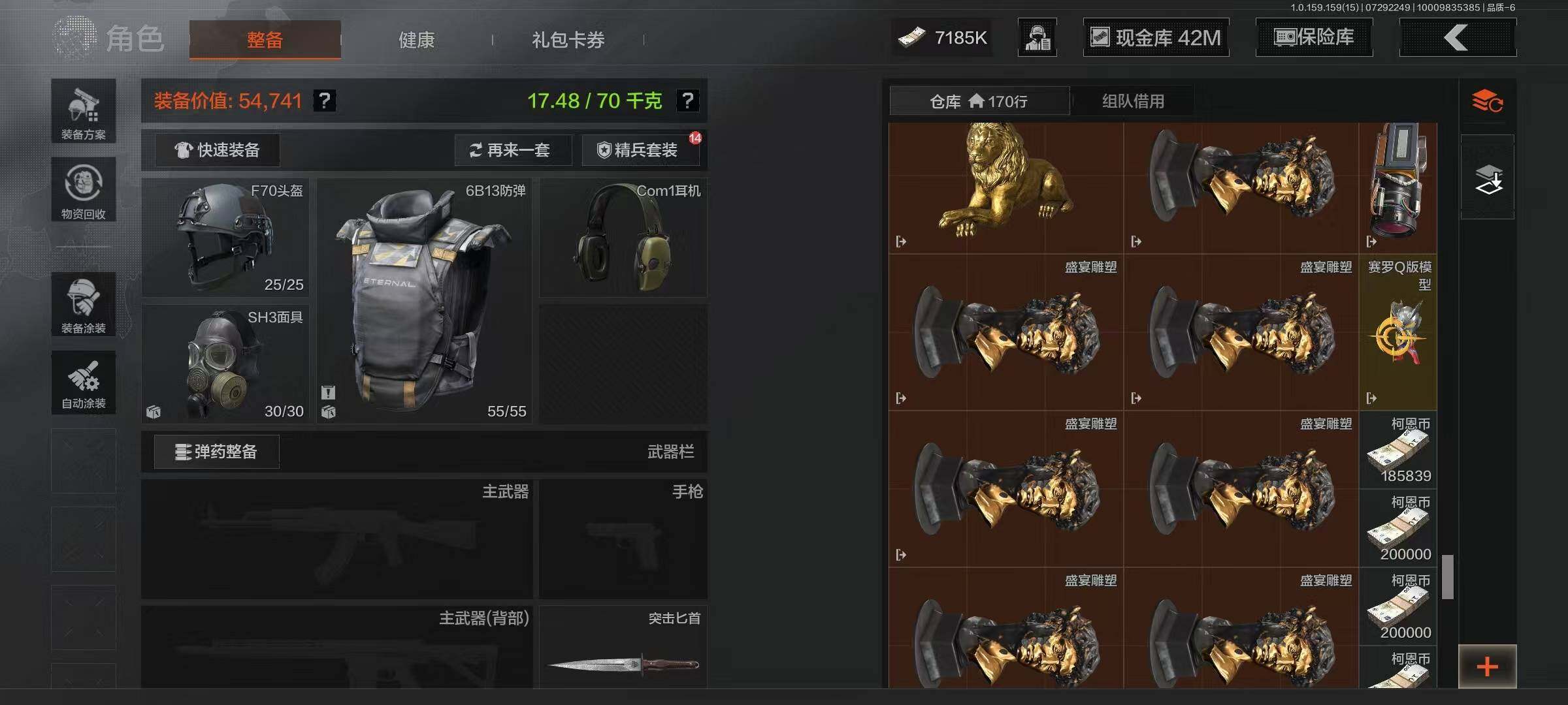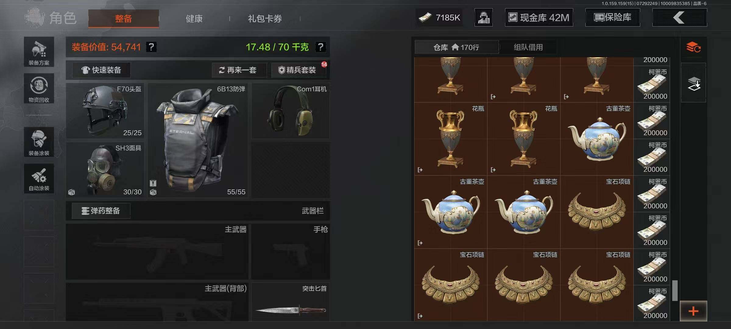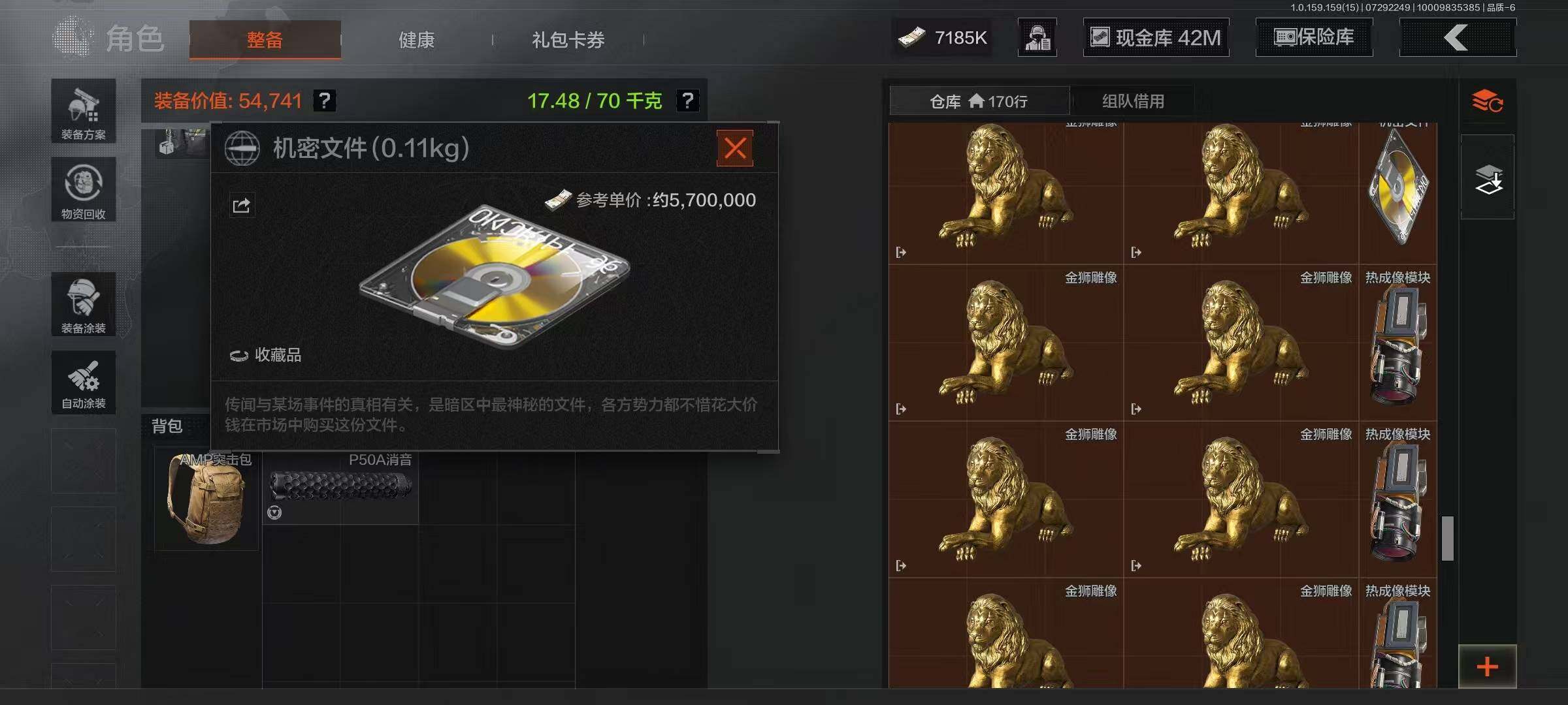 [10259785]暗区 可二次 s1突击匕首 1刀 仓库价值95.2m 4900万 机密文件 棱光裂变·akm 炎夏浪花·ar57 神锋·vect45 都市夜影套装 金狮雕像 热成相模块 盛宴雕塑 花瓶 宝石项链 多钥匙