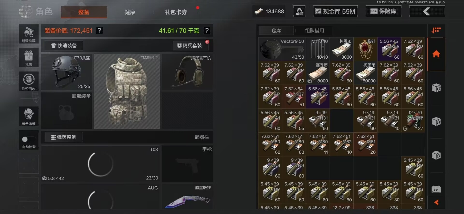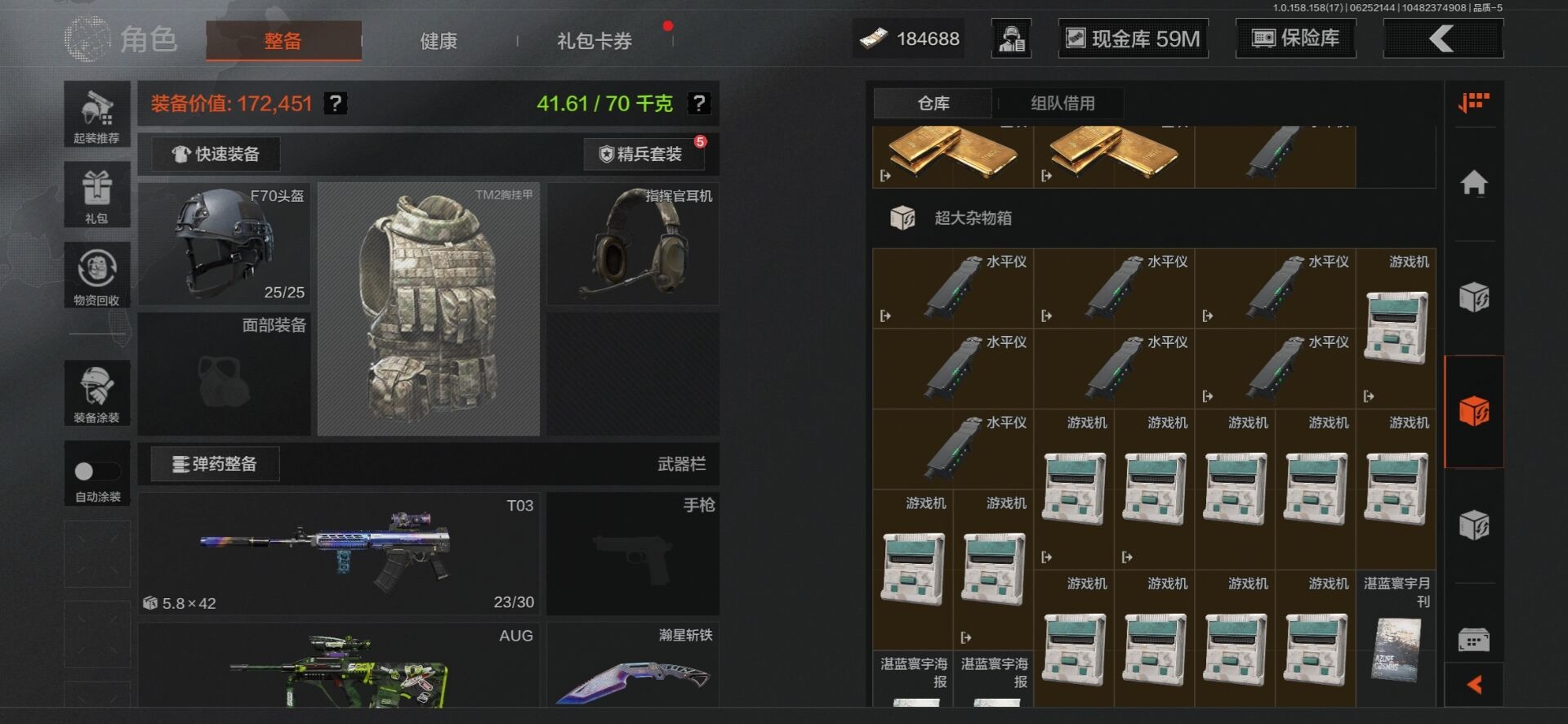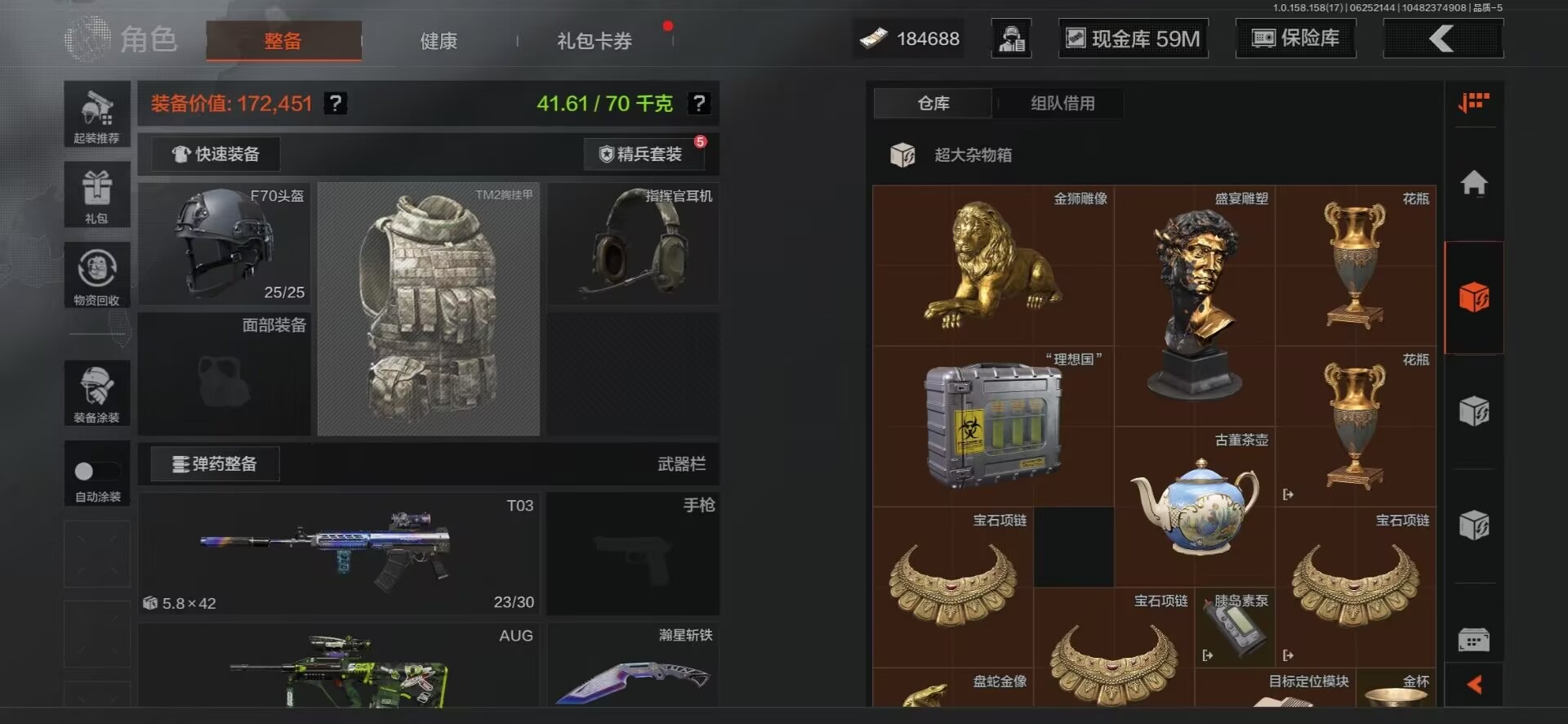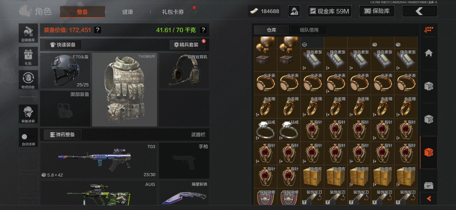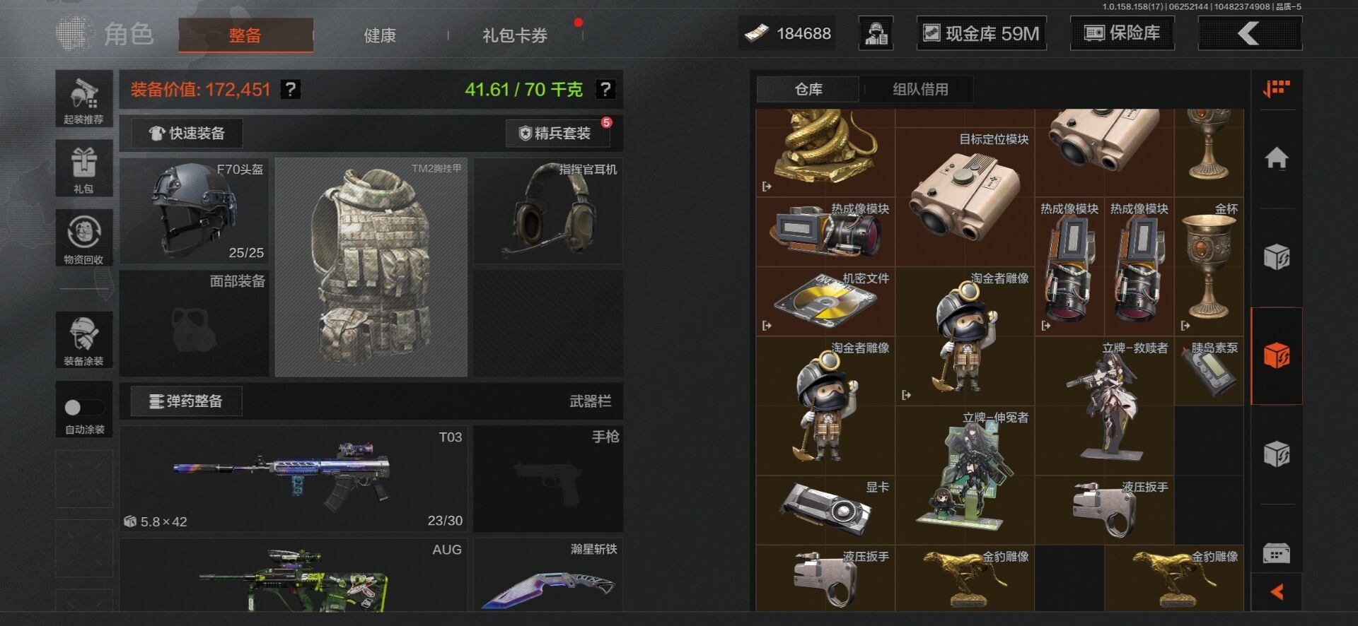 [10401818]可二次 柯恩币数量:184688 仓库价值:119.8 角色装扮(金):噤声者吉利服 近战武器:瀚星斩铁盘牙·彻甲短刃工兵铲来战·开山刀急袭弯刀精英指虎 金色呛皮:竞技·fal骑士之剑·vss蓝色咆哮·h416 紫色呛皮:缟兵玄墨·m缟兵玄墨·m110湖冰倒影·mp5无畏·usas12和平之手·fal禁止访问·ump45白色丧钟·莫辛北国内卫·mdr骑士之剑·sj16骑士之剑·mk14白狼连队·vss自喷网格·h416涂鸦·m德尔塔小队·h416 小金:金豹雕像 金手镯 金块 金手表 钻戒 胸针 金魔方 金杯 大金:茶壶 花瓶 机密文件 金狮子 盘蛇金像