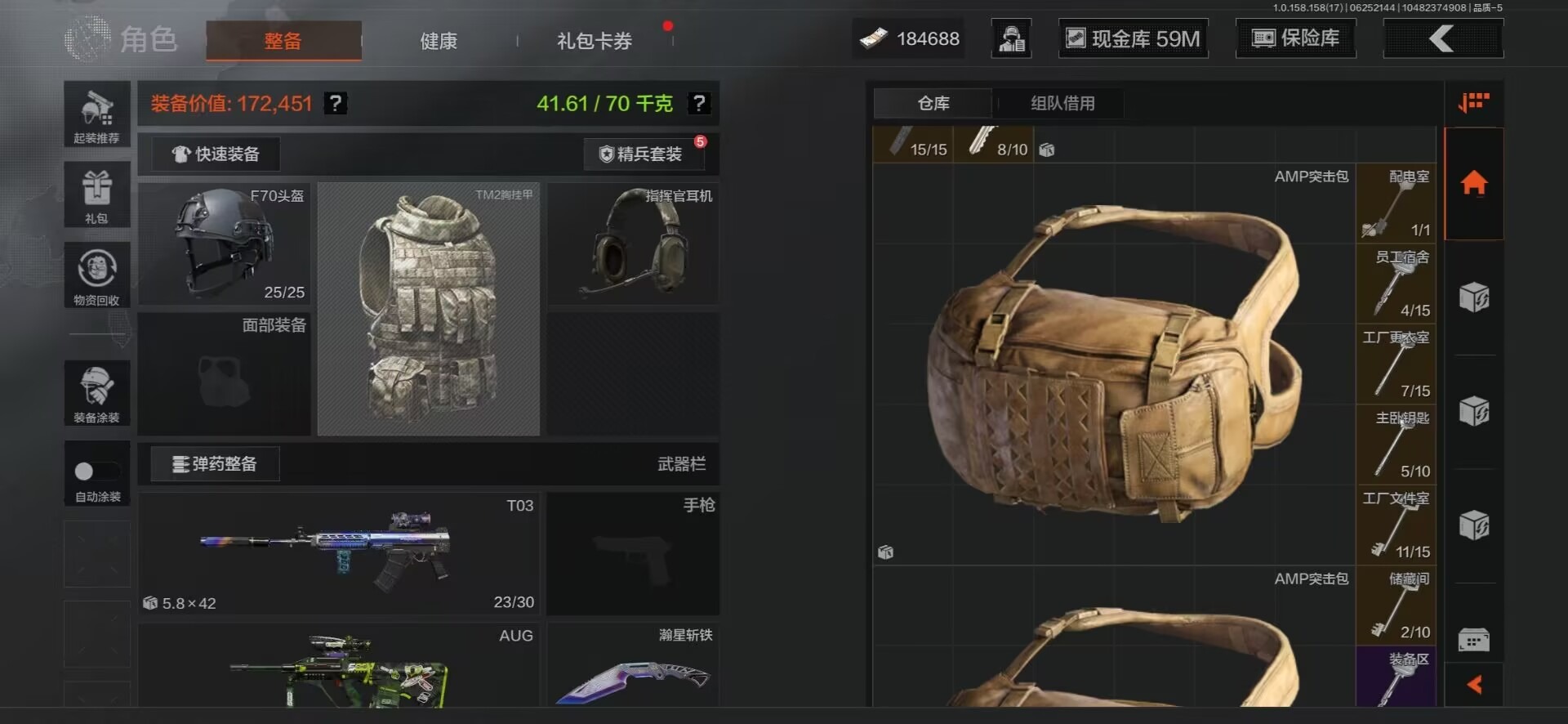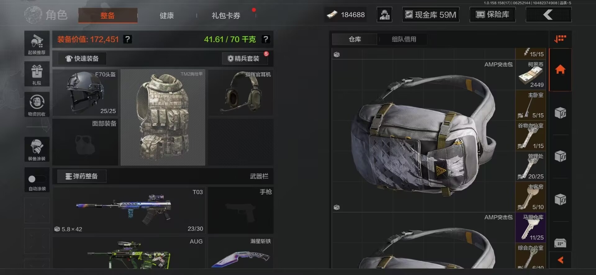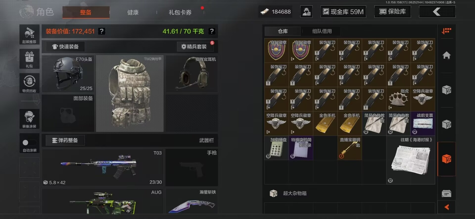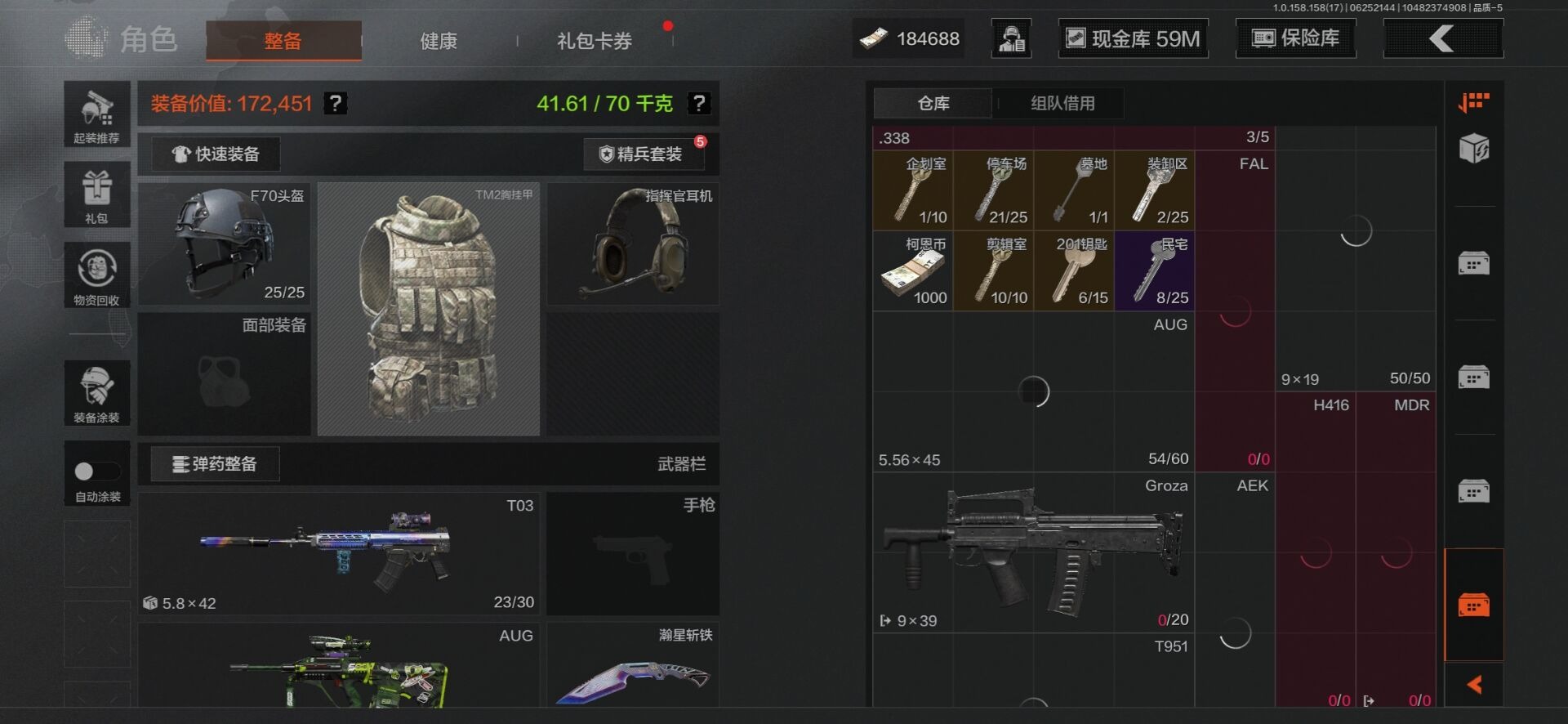 [10401818]可二次 柯恩币数量:184688 仓库价值:119.8 角色装扮(金):噤声者吉利服 近战武器:瀚星斩铁盘牙·彻甲短刃工兵铲来战·开山刀急袭弯刀精英指虎 金色呛皮:竞技·fal骑士之剑·vss蓝色咆哮·h416 紫色呛皮:缟兵玄墨·m缟兵玄墨·m110湖冰倒影·mp5无畏·usas12和平之手·fal禁止访问·ump45白色丧钟·莫辛北国内卫·mdr骑士之剑·sj16骑士之剑·mk14白狼连队·vss自喷网格·h416涂鸦·m德尔塔小队·h416 小金:金豹雕像 金手镯 金块 金手表 钻戒 胸针 金魔方 金杯 大金:茶壶 花瓶 机密文件 金狮子 盘蛇金像
