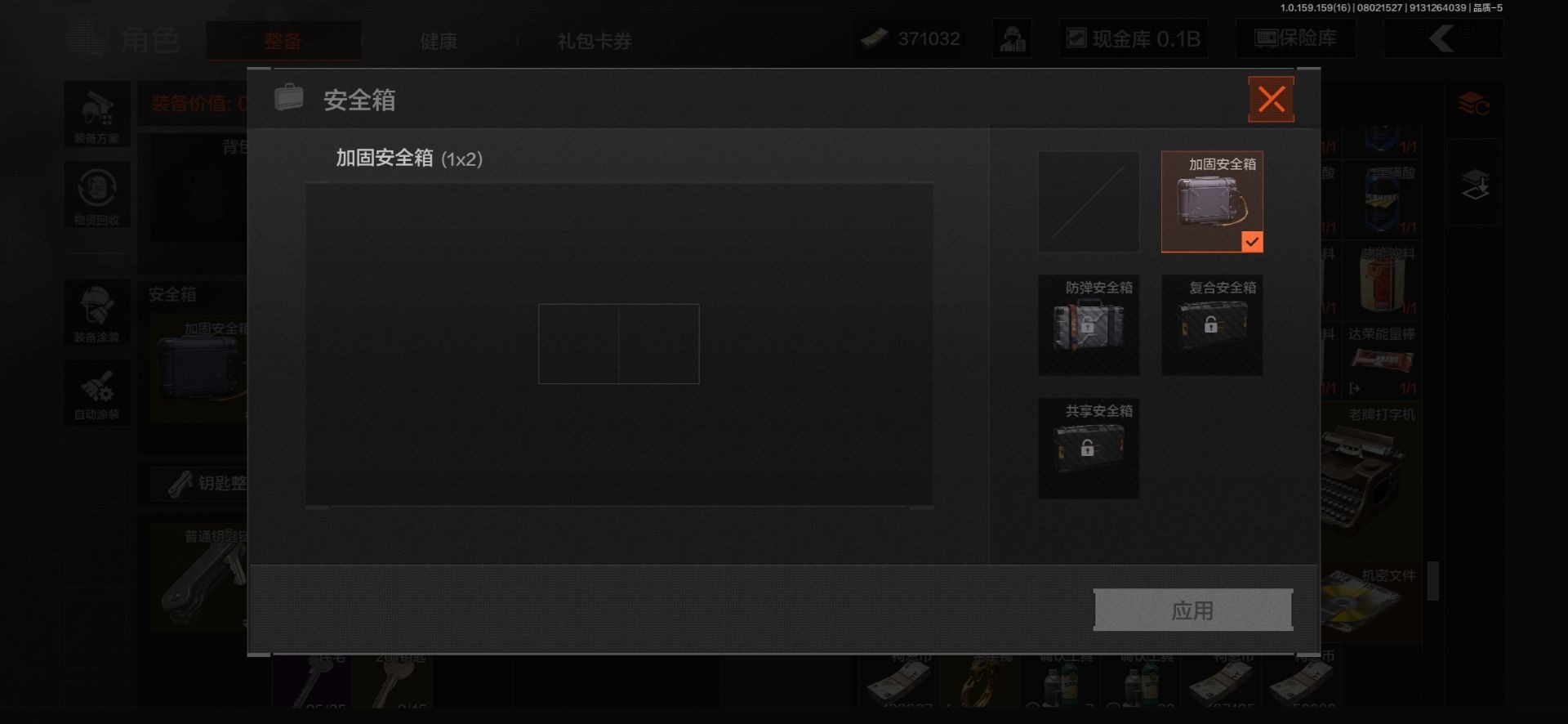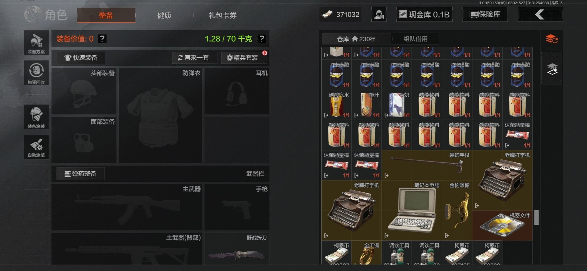 [10419027]可二次 可修改实名 柯恩币数量:371032 仓库价值:116.7 近战武器:工兵铲来战·开山刀野战折刀 紫色呛皮:无畏·usas1207式林地迷彩·q191火力倾泻·akm来战·ak74n 大金:机密文件
