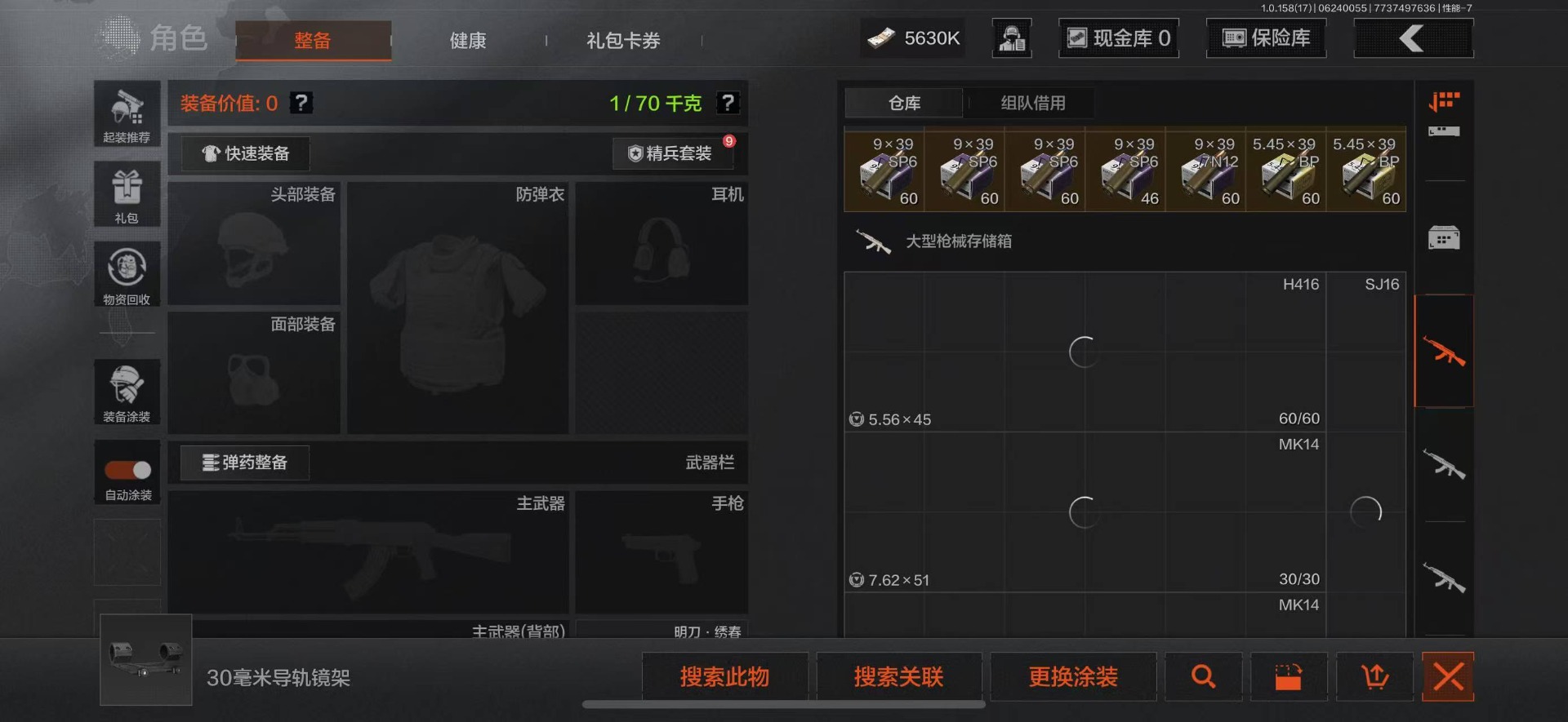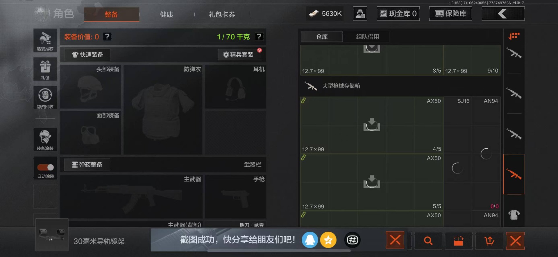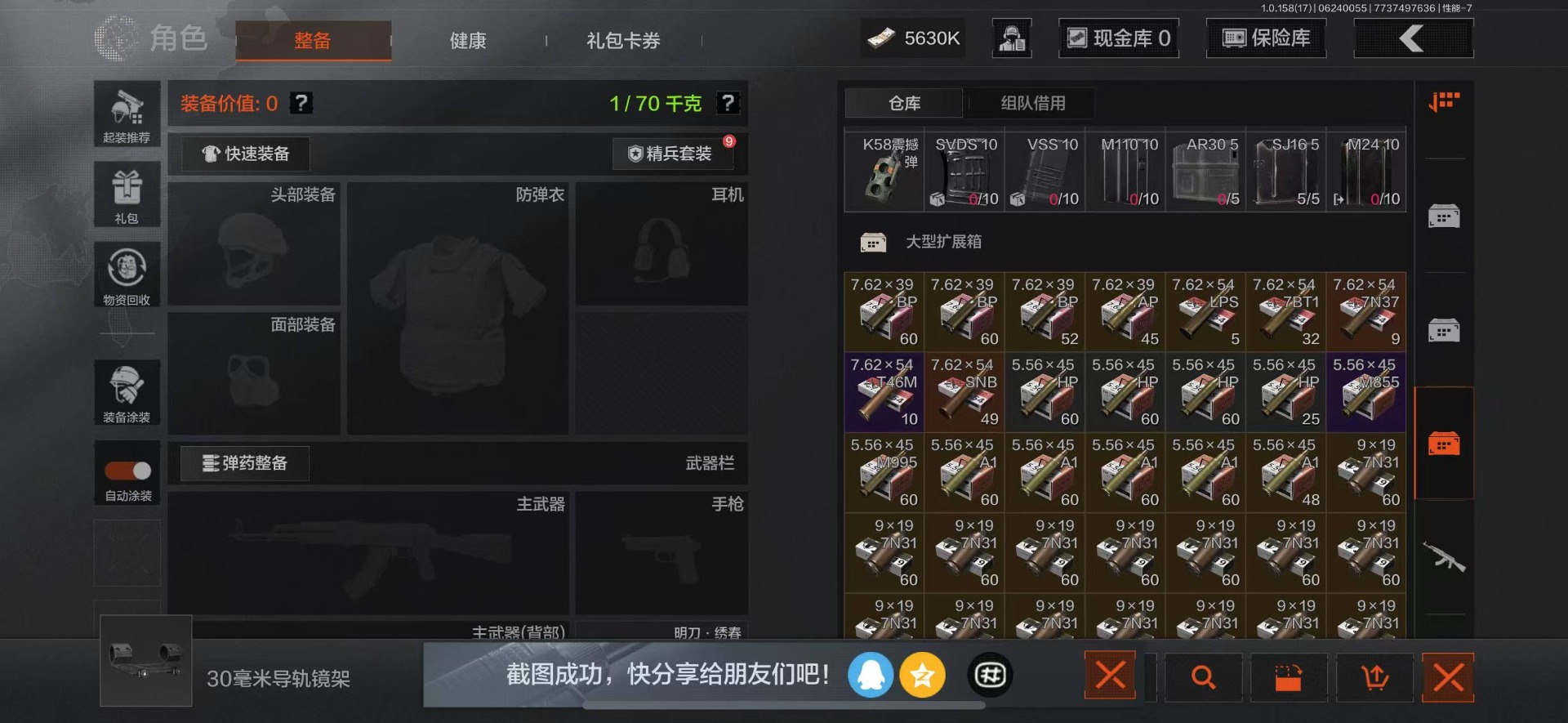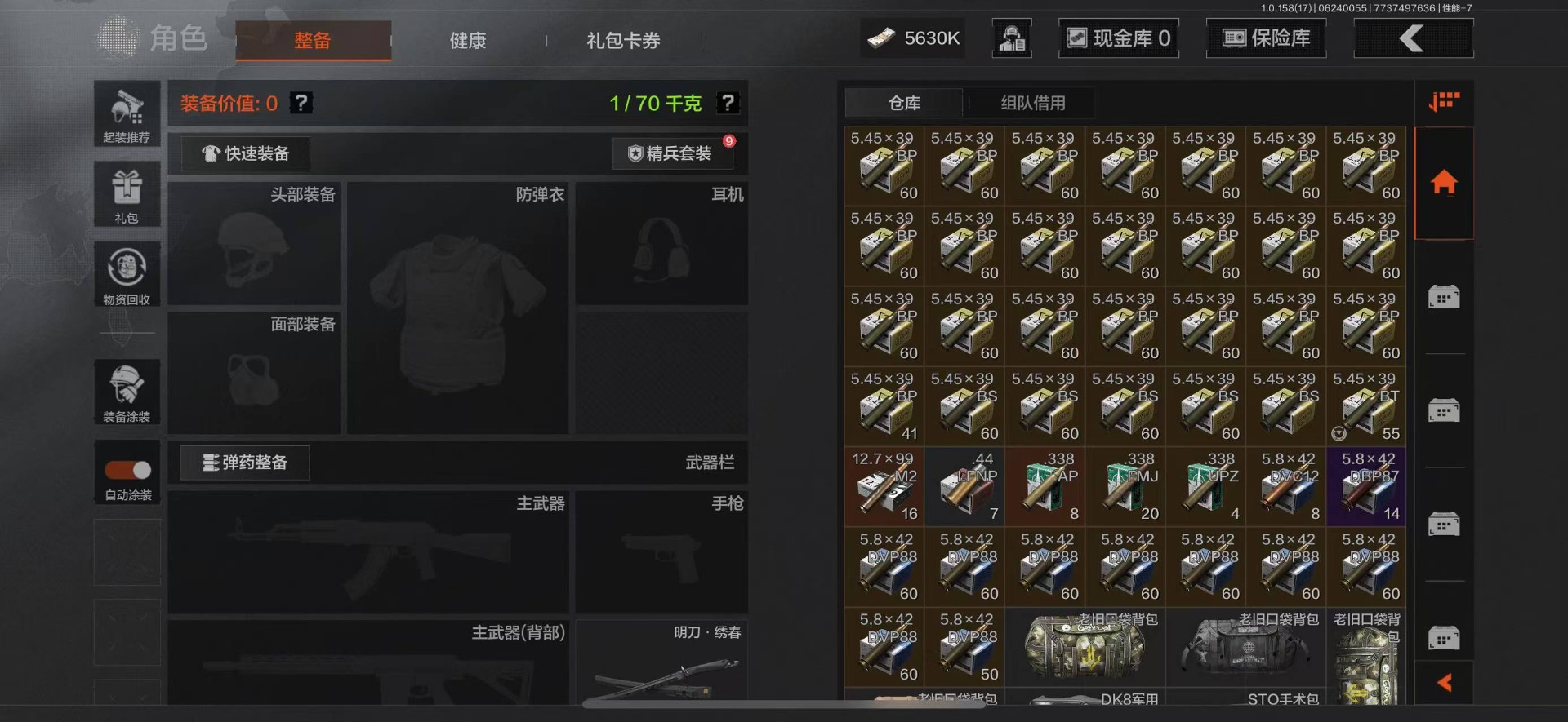可二次 柯恩币数量:5630 仓库价值:21.9 角色装扮(金):龙魂武术运动服 近战武器:工兵铲明刀·绣春龙魂·双节棍 金色呛皮:竞技·fal长缨风掣·vect9 紫色呛皮:缟兵玄墨·akm缟兵玄墨·m110玄戈梨花·vss玄戈梨花·t03玄戈梨花·m缟兵玄墨·vss最后