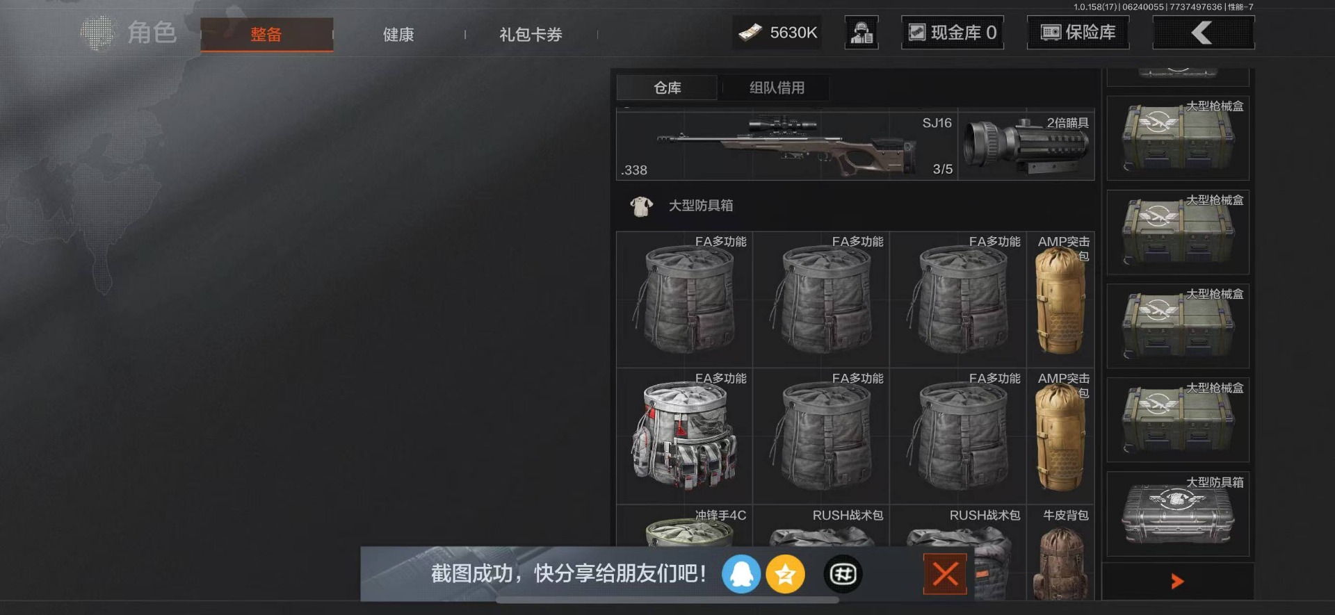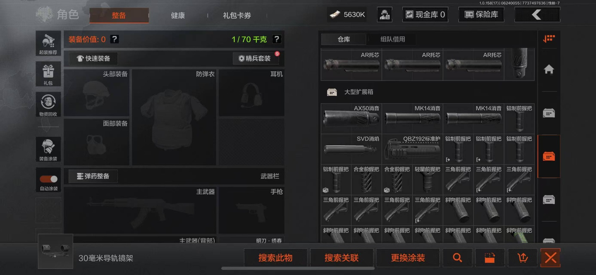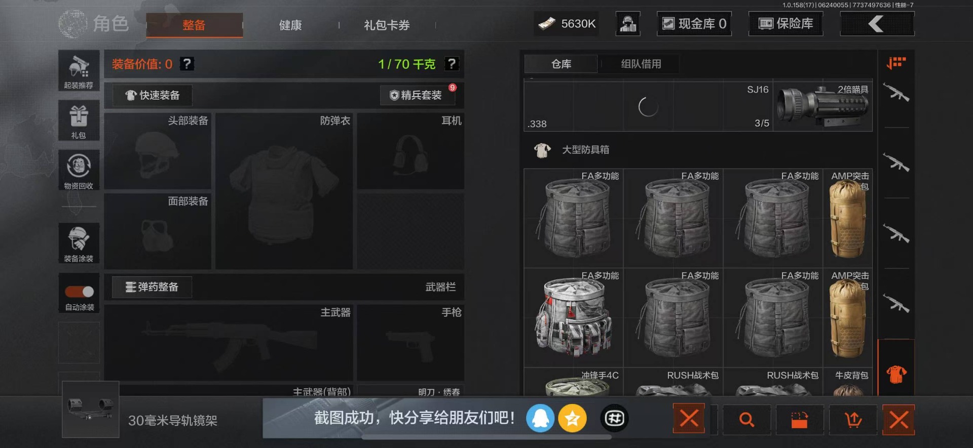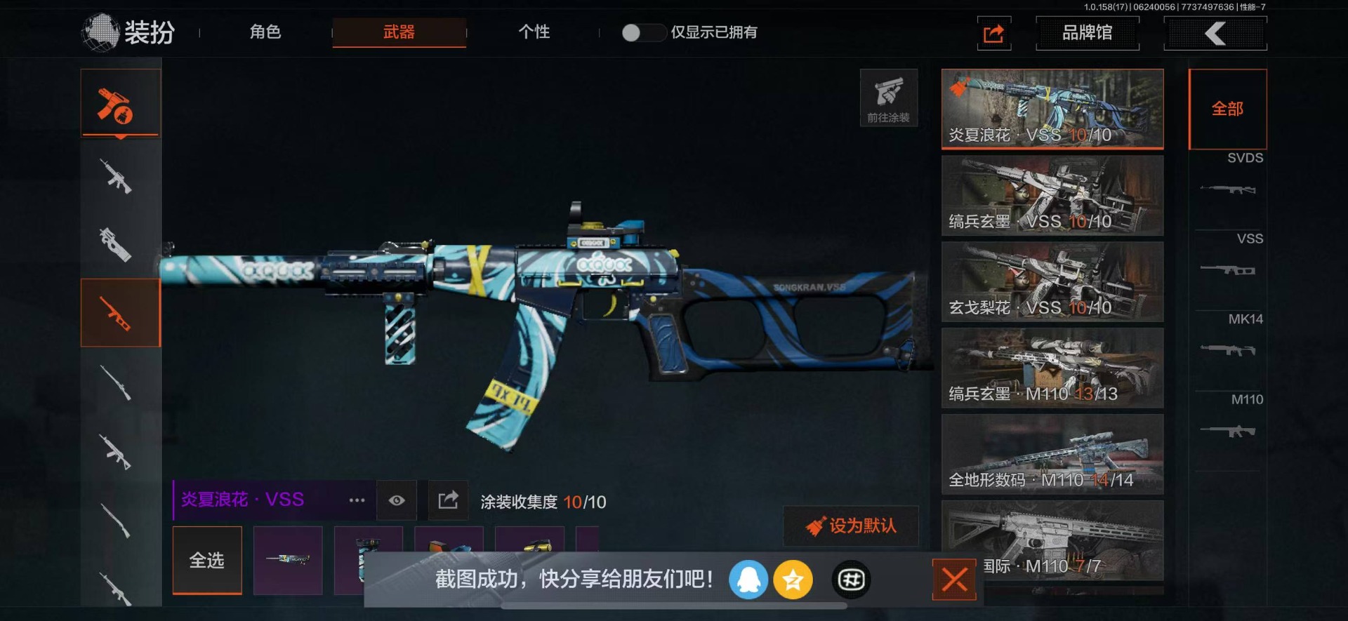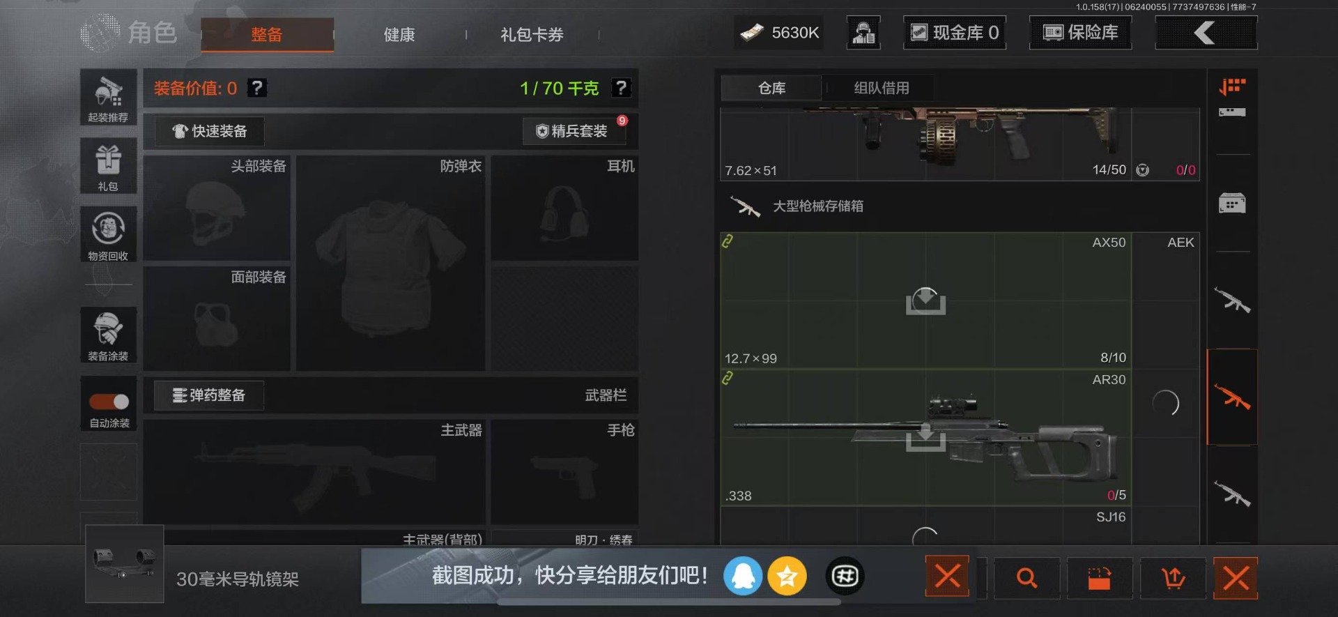 可二次 柯恩币数量:5630 仓库价值:21.9 角色装扮(金):龙魂武术运动服 近战武器:工兵铲明刀·绣春龙魂·双节棍 金色呛皮:竞技·fal长缨风掣·vect9 紫色呛皮:缟兵玄墨·akm缟兵玄墨·m110玄戈梨花·vss玄戈梨花·t03玄戈梨花·m缟兵玄墨·vss最后