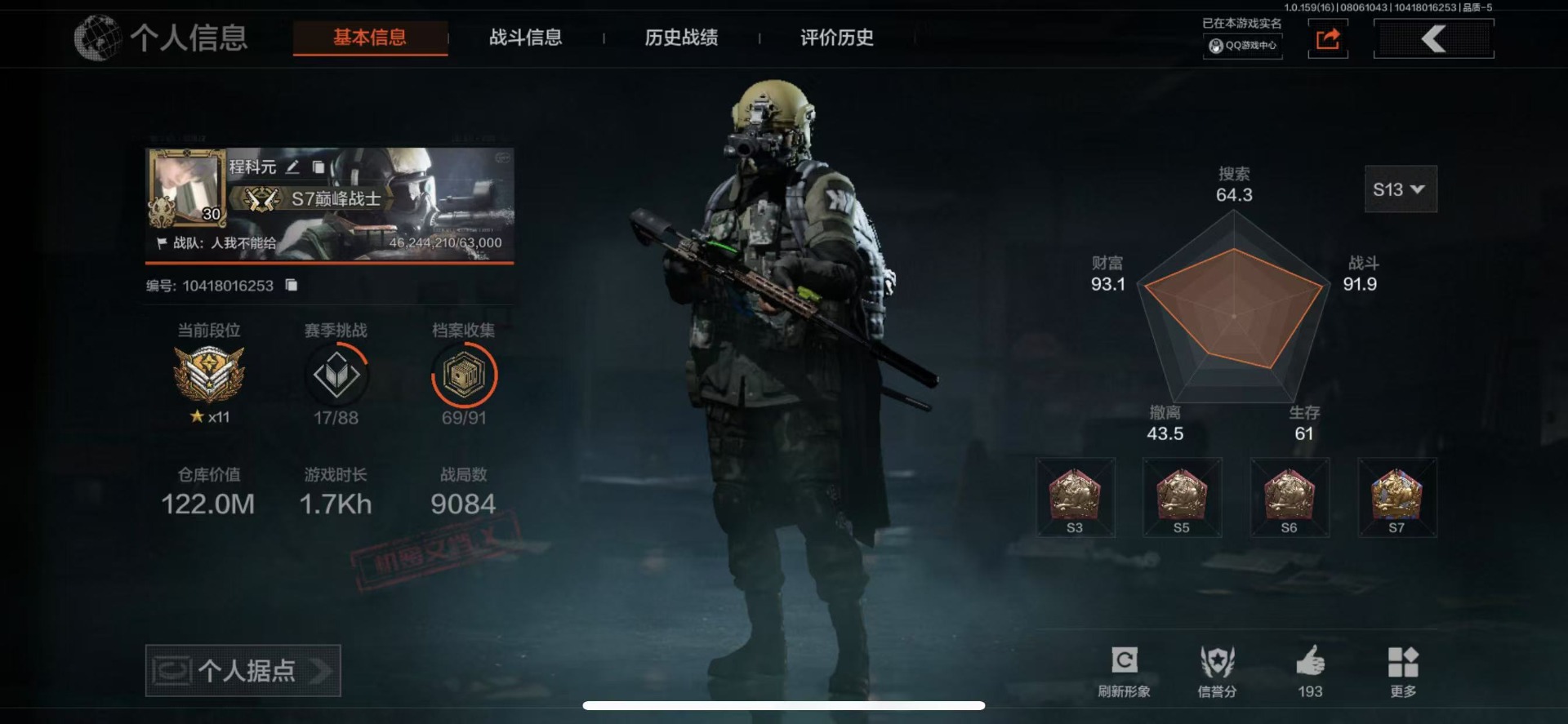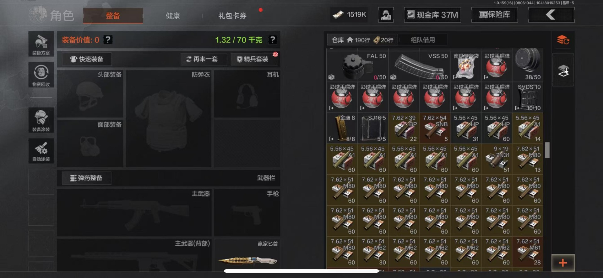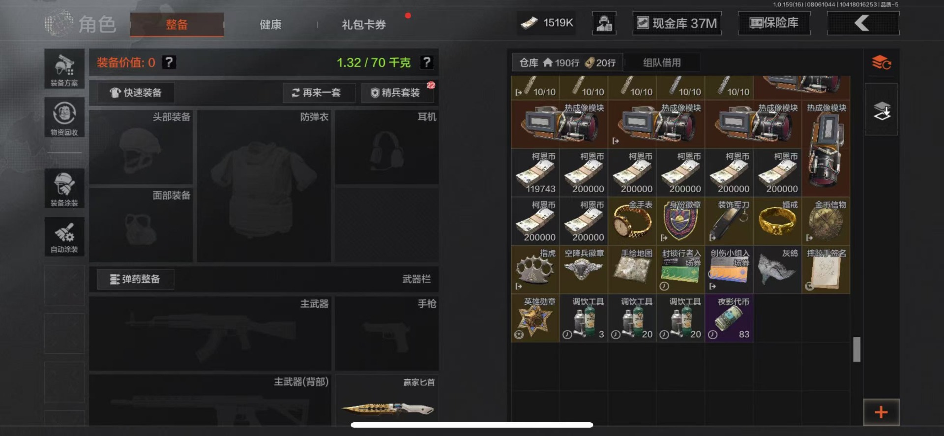 库存价值122.0 4近战武器 1金套装 5金呛皮 可修改实名 柯恩币数量:1519 角色装扮(金):钢铁壁垒作战服 近战武器:赢家匕首工兵铲来战·开山刀裁决手杖剑 金色呛皮:旗帜·aek钢铁真理·q191竞技·fal骑士之剑·vss蓝色咆哮·h416 紫色呛皮:和平之手·fal
