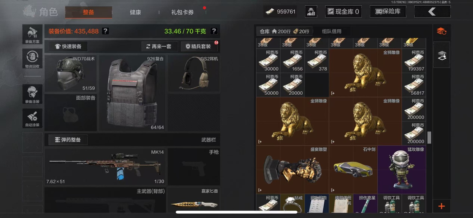 可二次 可修改实名 柯恩币数量:959761 仓库价值:10.3 近战武器:赢家匕首工兵铲涂鸦利刃 金色呛皮:棱光裂变·qbu191骑士之剑·vss黄金·h416 紫色呛皮:骑士之剑·sj16火力倾泻·aug火力倾泻·akm棱光裂变·莫辛棱光裂变·akm快乐游戏·m110饰金·a