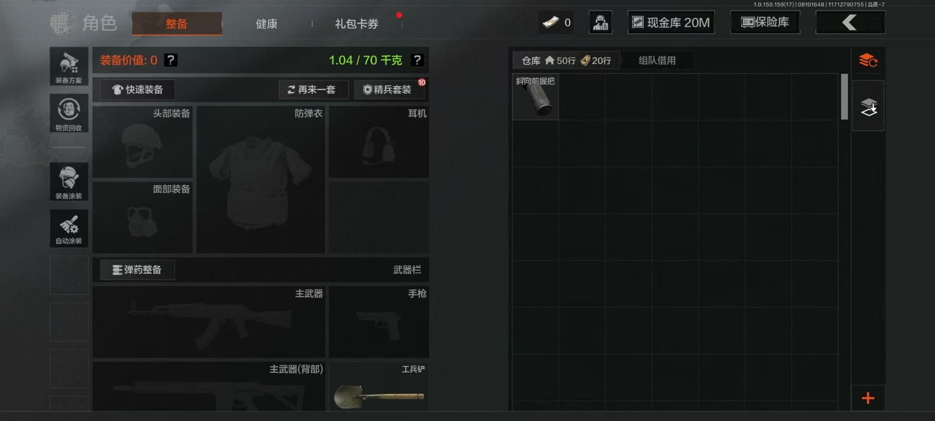 库存价值20.1 1近战武器 可修改实名 柯恩币数量:0 近战武器:工兵铲
