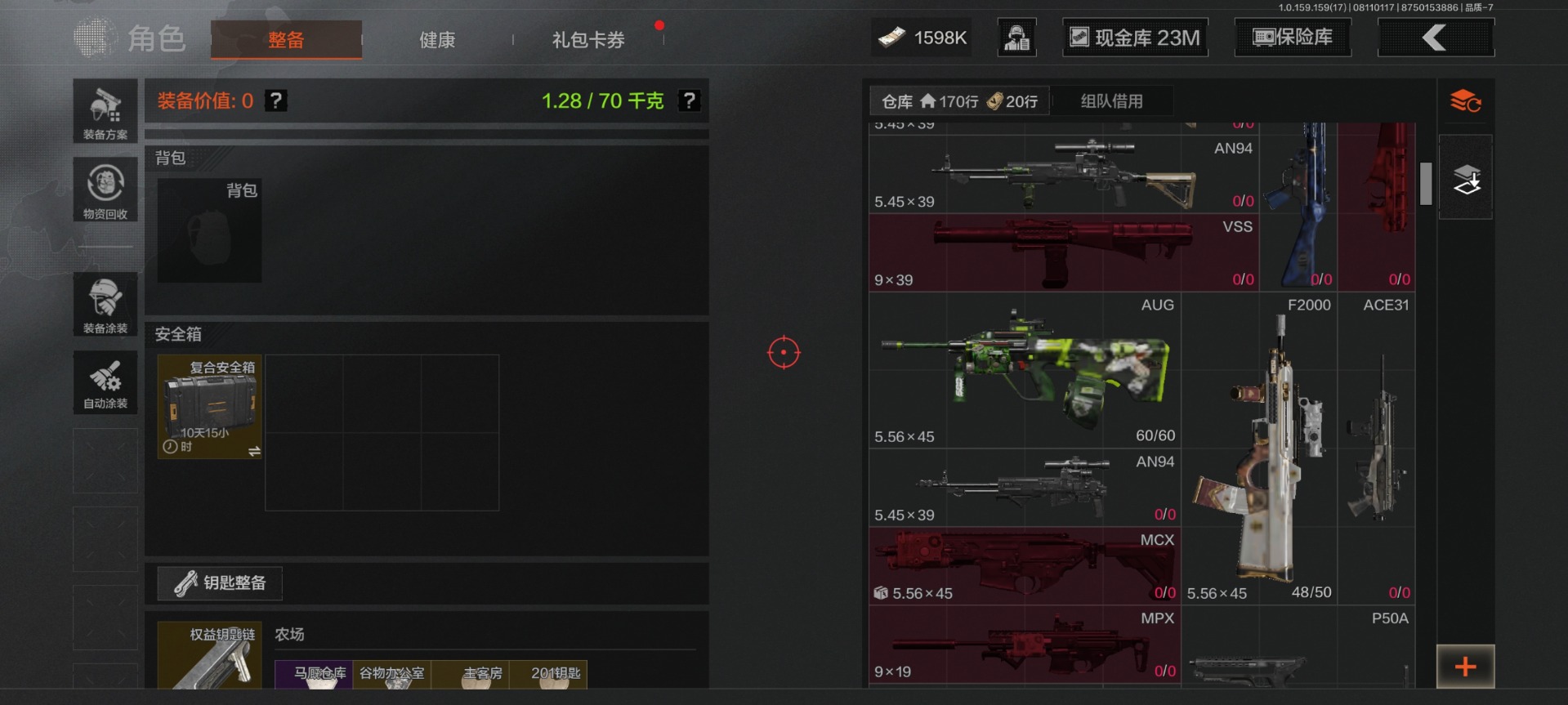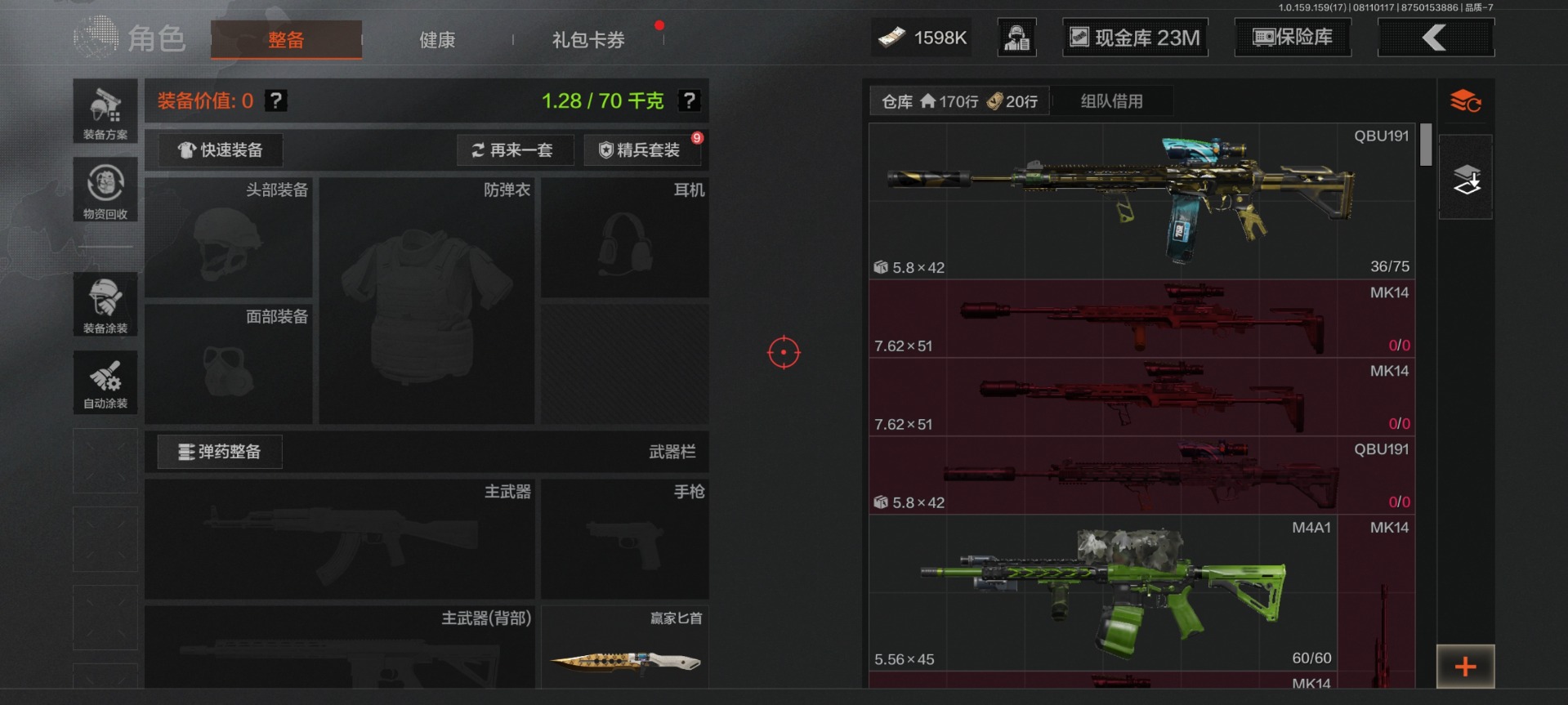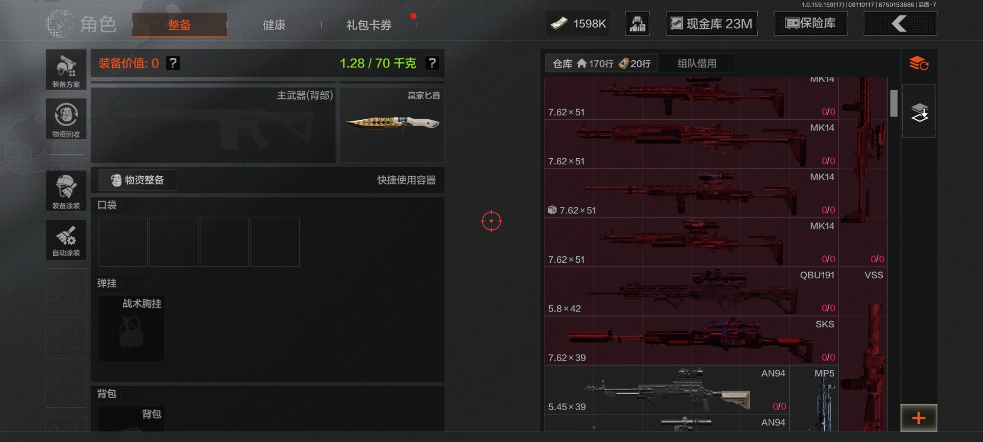 库存价值63.2 1手套 2近战武器 3金呛皮 可修改实名 柯恩币数量:1598 近战武器:赢家匕首工兵铲 手套:急袭手套 金色呛皮:旗帜·aek钢铁真理·q191林中人·fal 紫色呛皮:禁止访问·ump45白貂·f57骑士之剑·ace31骑士之剑·sj16骑士之剑·14炎