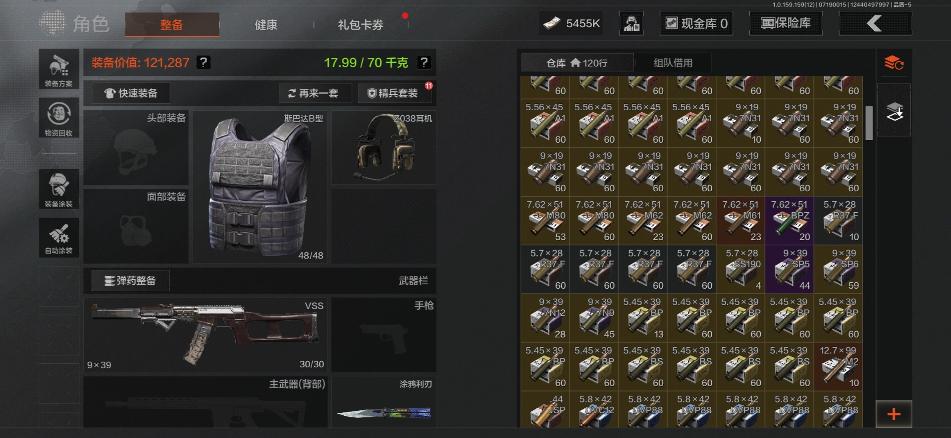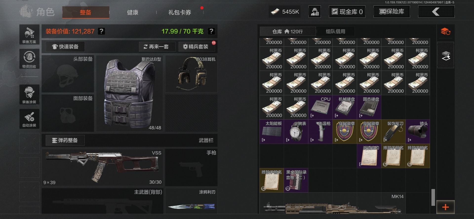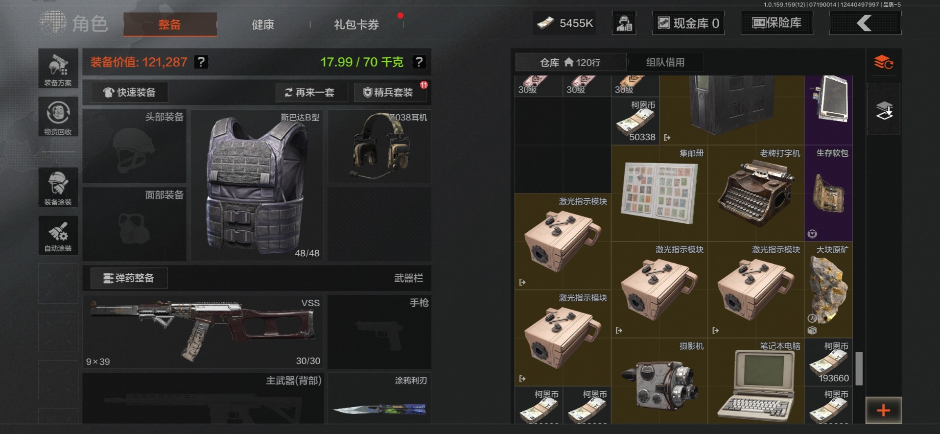 可二次 可修改实名 柯恩币数量:5455 仓库价值:28.1 近战武器:贝利亚黄昏工兵铲来战·开山刀涂鸦利刃 手套:角弓得控·手套 金色呛皮:银月·an94骑士之剑·vss蓝色咆哮·h416棱光裂变·qbu191 紫色呛皮:和平之手·fal火绒草·aug神锋·vect45禁止访