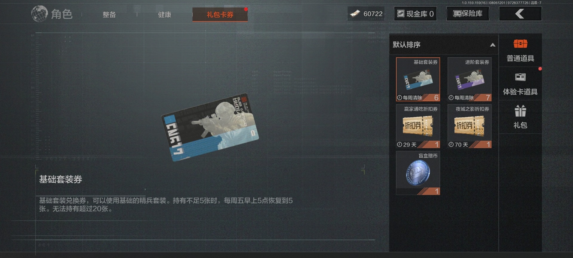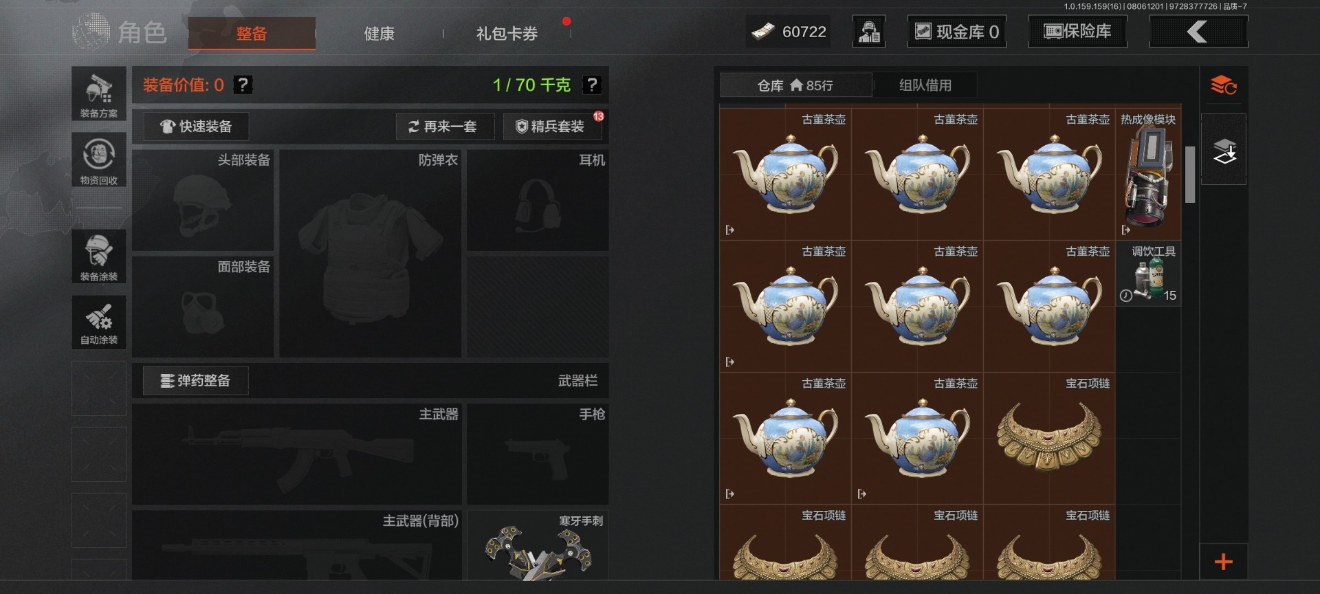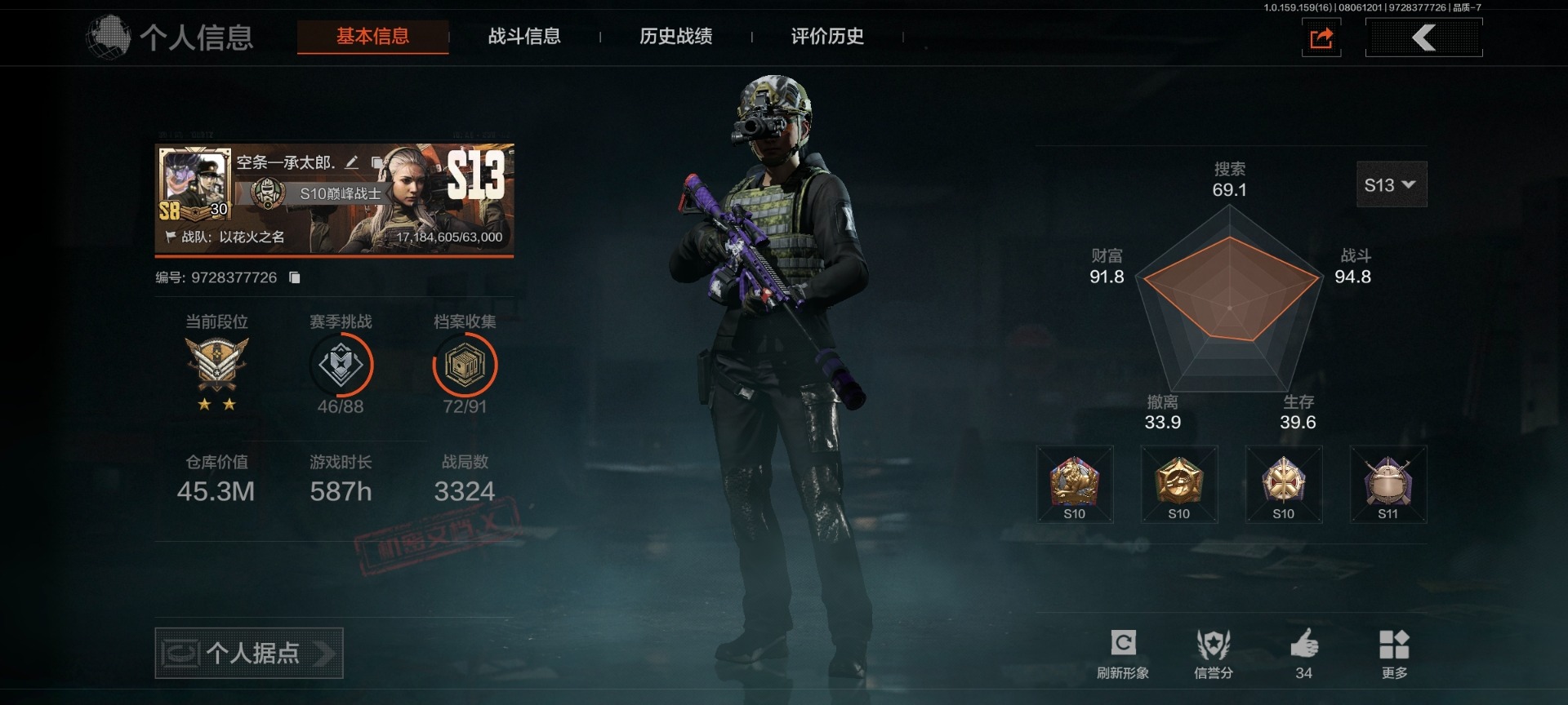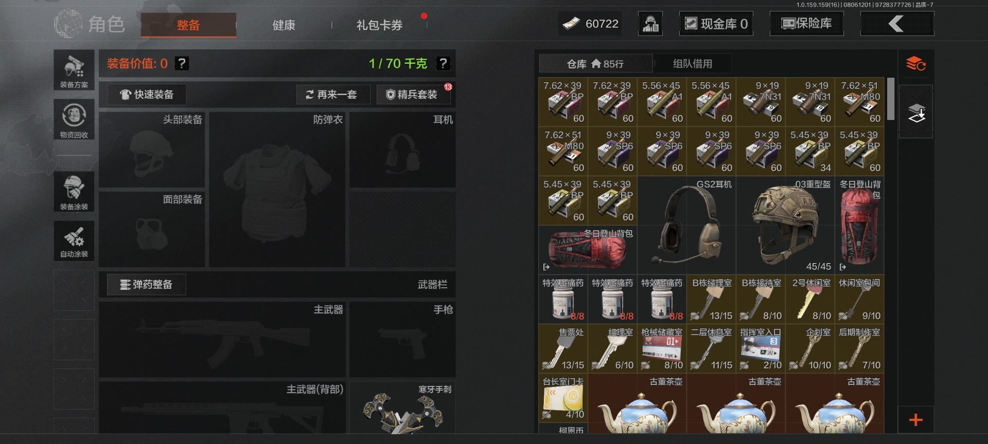 可二次 可修改实名 柯恩币数量:404300 仓库价值:16.9 角色装扮(金):都护铁衣·战术甲胄 近战武器:突击匕首三尺万仞·战术剑工兵铲来战·开山刀霜狼生存刀 金色呛皮:骑士之剑·vss长缨风掣·rpk16蓝色咆哮·h416 紫色呛皮:山地伪装·ak74n和平之手·fal北国内
