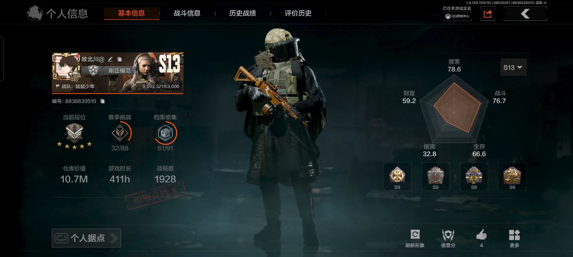 可二次 可修改实名 柯恩币数量:666936 仓库价值:10.7 角色装扮(金):都护铁衣·战术甲胄 近战武器:三尺万仞·战术剑工兵铲来战·开山刀涂鸦利刃 手套:玉鸾挂枝·手套 金色呛皮:钢铁真理·q191长缨风掣·vect9长缨风掣·rpk16长缨风掣·ax50 紫色呛皮:北国