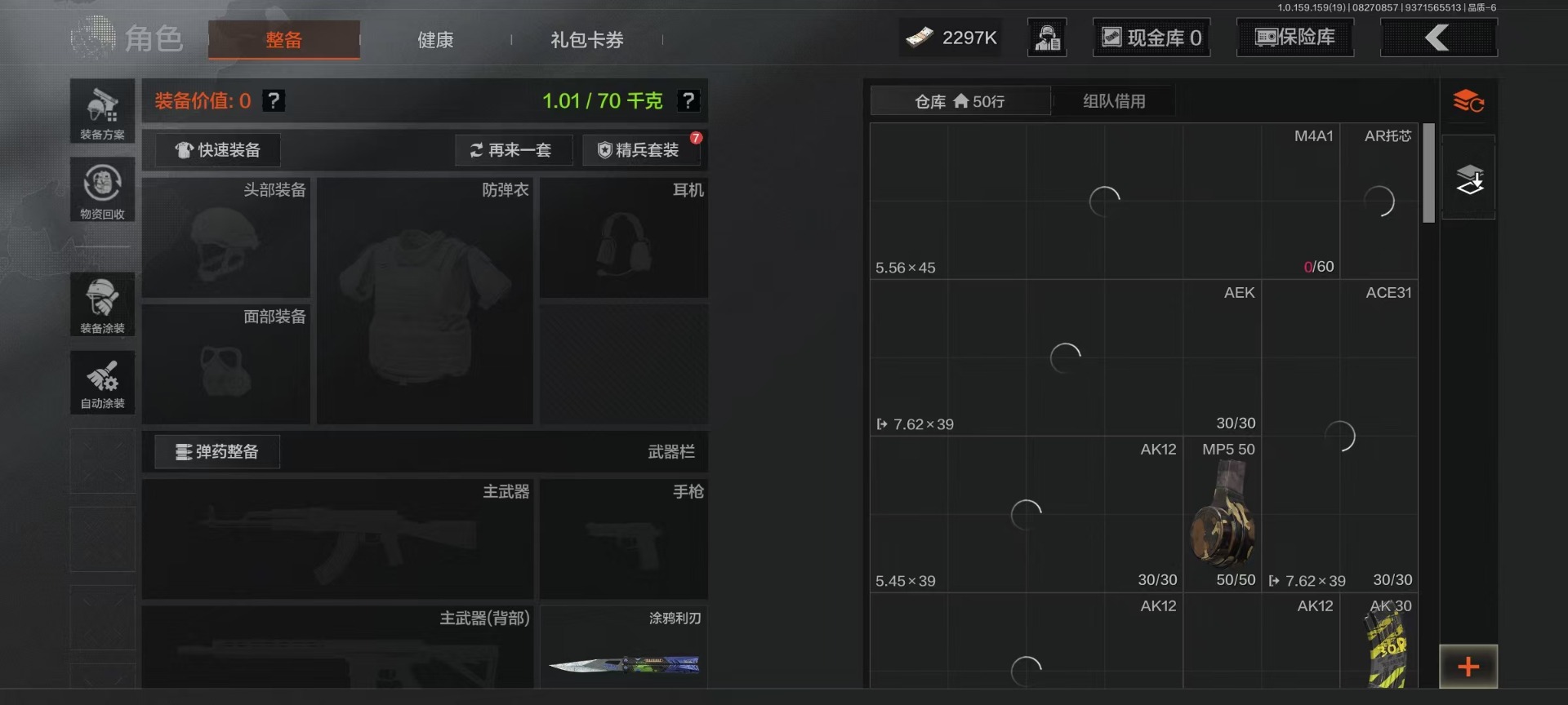 库存价值3.9 2近战武器 可修改实名 优质装备:涂鸦利刃 柯恩币数量:2297 近战武器:工兵铲 紫色呛皮:白貂·f57骑士之剑·ace31骑士之剑·14无畏·usas12竞技·aug最后防线·aek阴影·an94竞技·m4a1白狼连队·vss