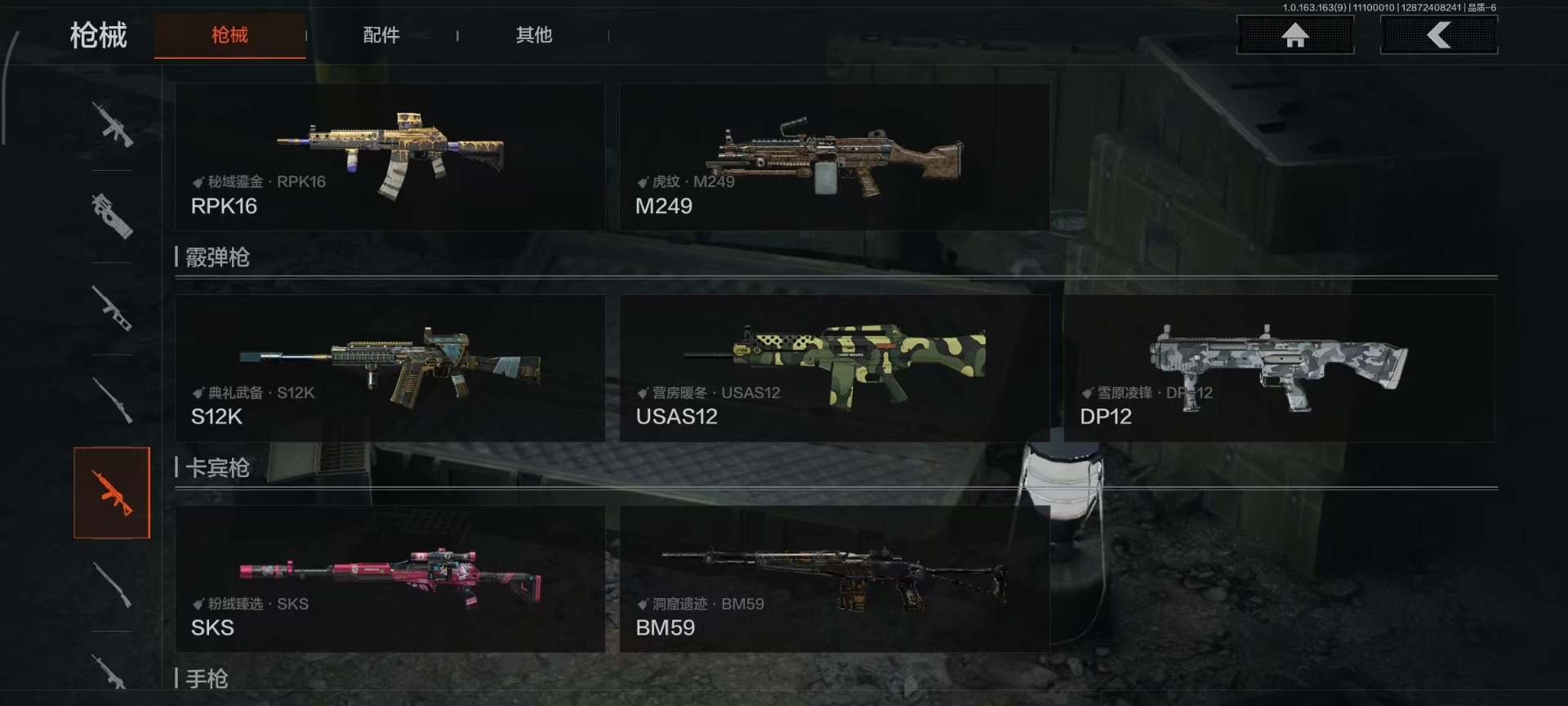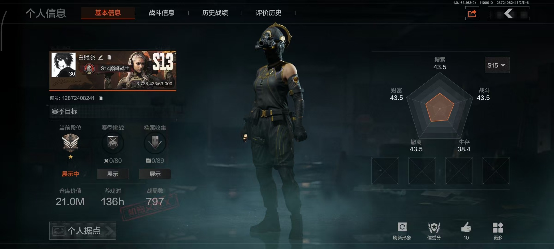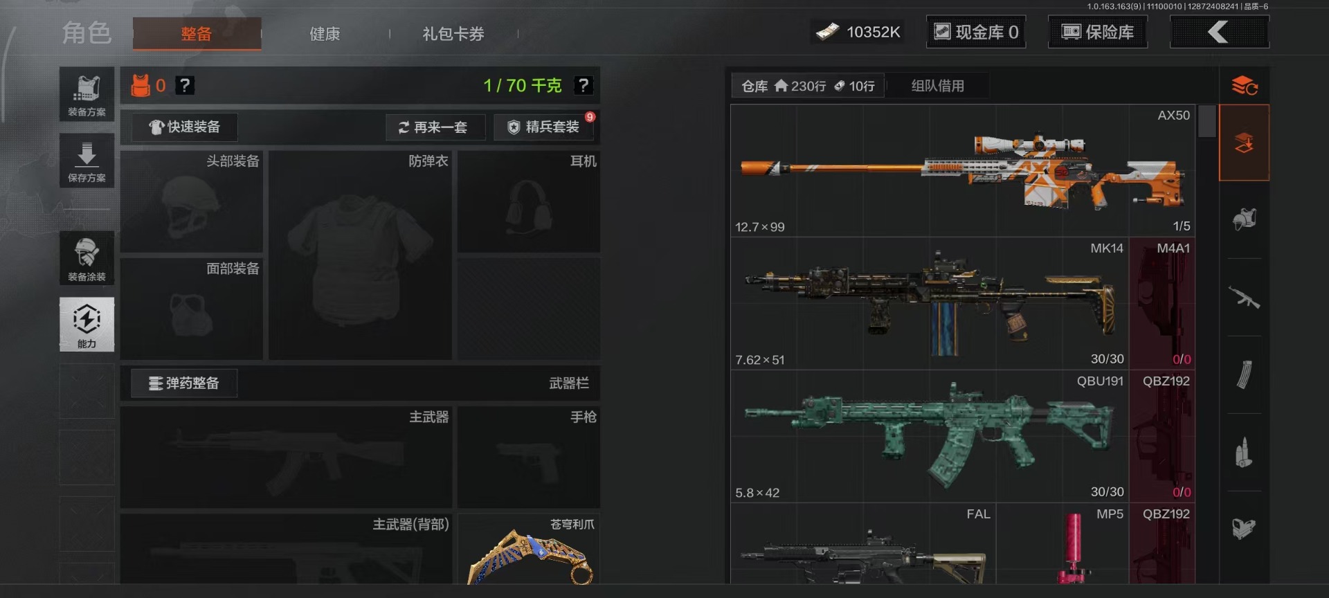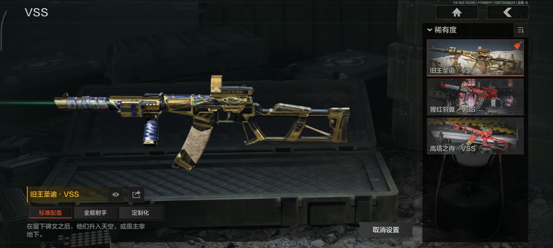 [14239358]库存价值21.0 3近战武器 2金呛皮 可修改实名 【柯恩币数量】:10352 【近战武器】:苍穹利爪热能武器·补牢工兵铲 【金色呛皮】:告丧夜曲·ar57旧王圣谕·vss 【紫色呛皮】:高塔之内·p90高塔之内·vss竞技·m110典礼武备·groza秘域鎏金·rpk16粉绒臻选·sks典礼武备·mk14典礼武备·mcx猩红羽翼·vss骤羽尖啸·莫辛鱼跃丹青·dt mdr典礼武备·s12k幻域莎绫·m4a1 【角色装扮(紫)】:王国卫队礼装金狮护身·转运套装