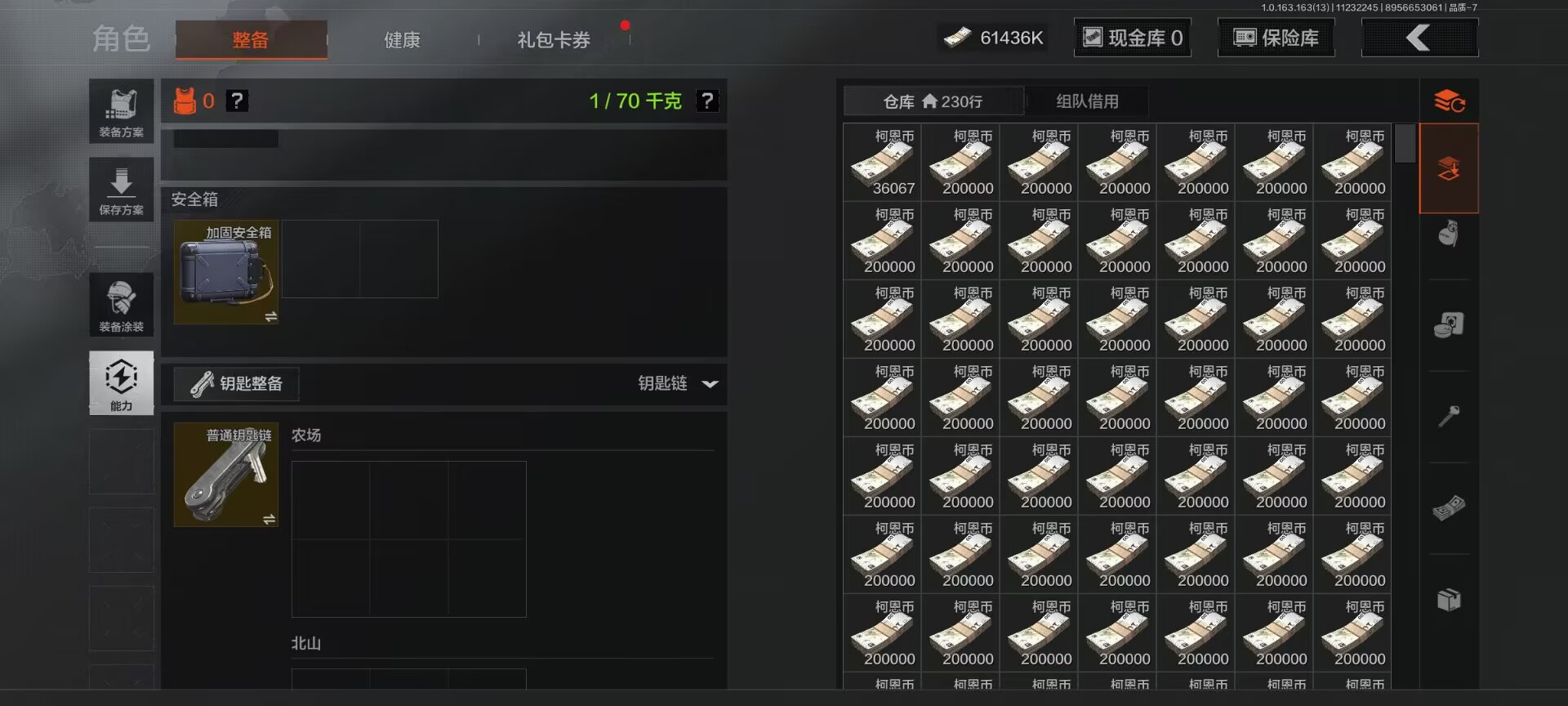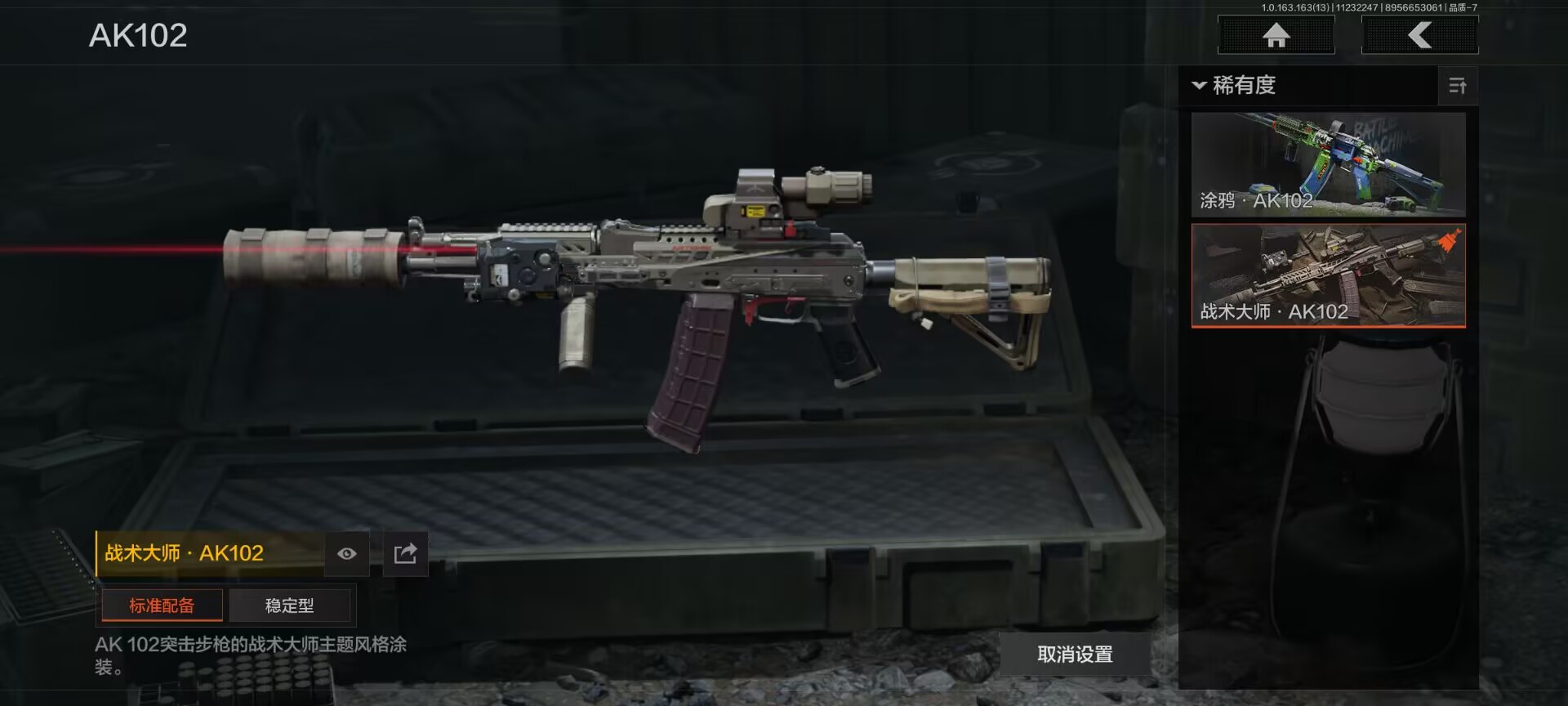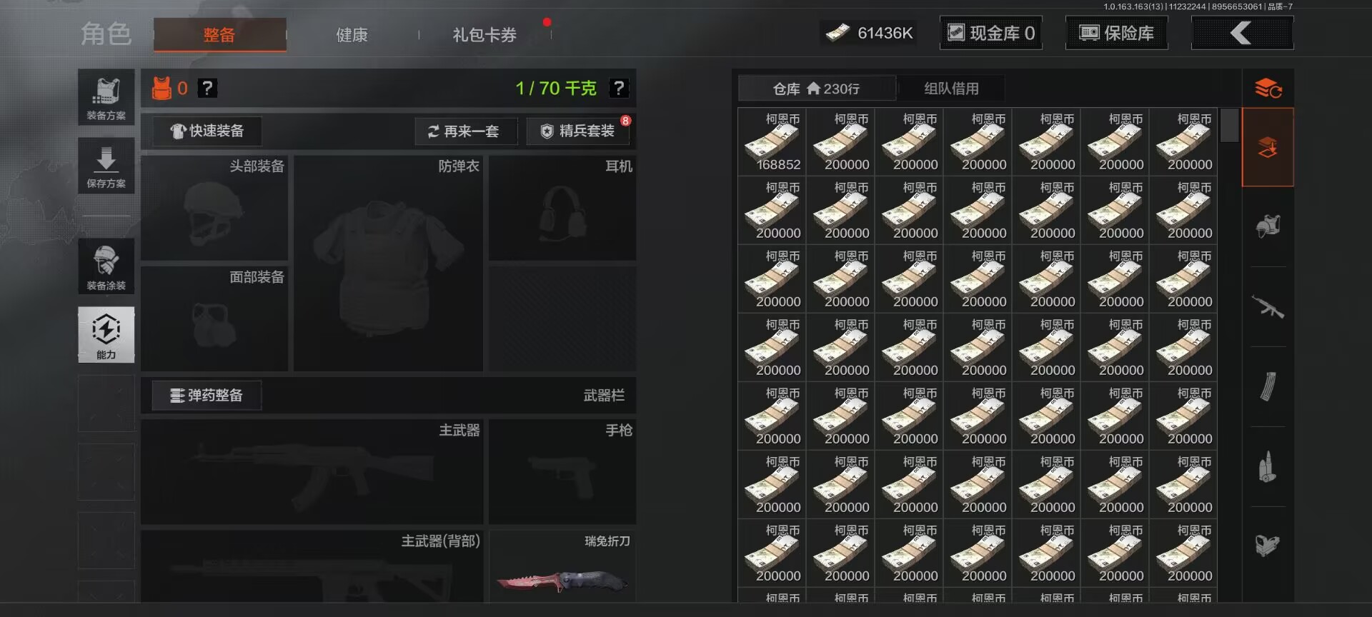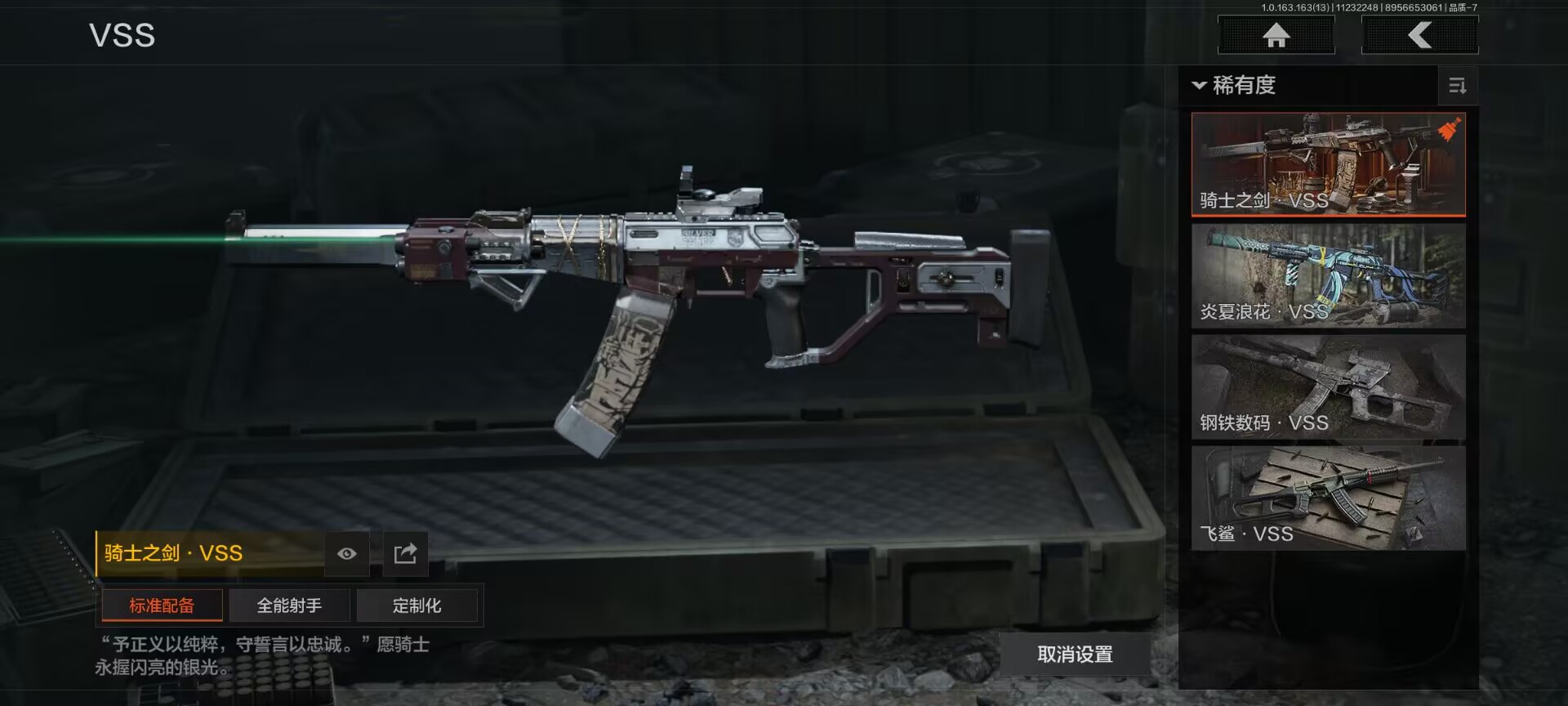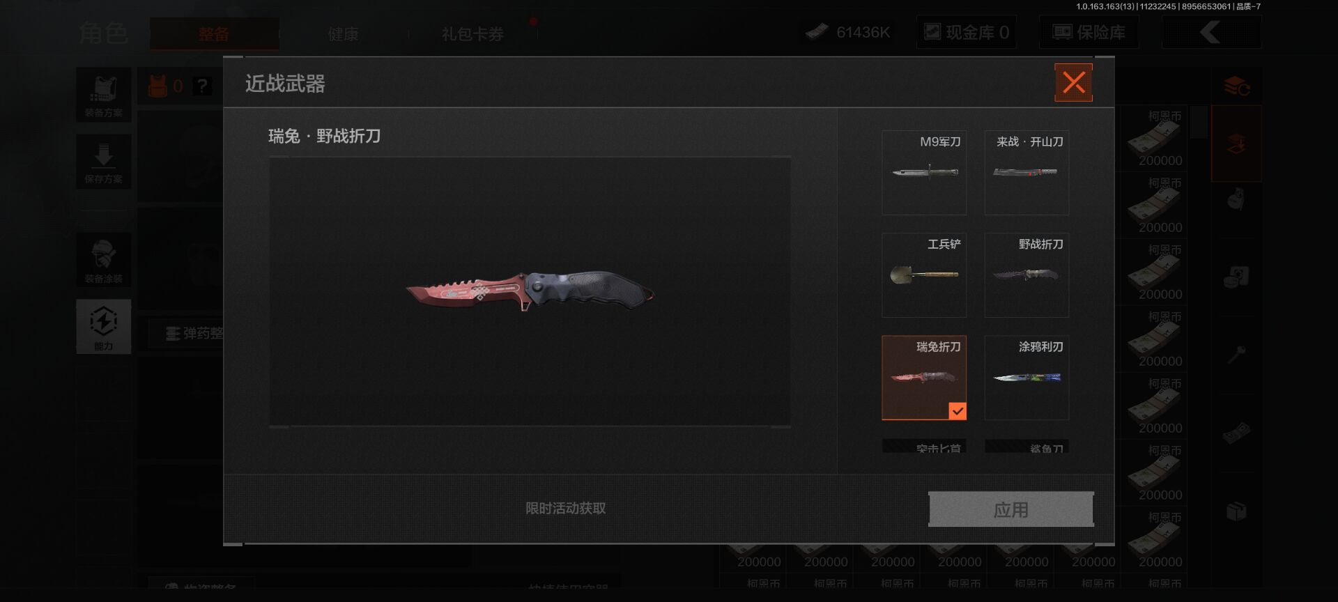 安卓q-等级30-仓库价值76.4m-科恩币61436k 【呛皮】 竞技·fal 战术大师·ak102 骑士之剑·vss 【近战武器】 瑞兔折刀 野战折刀 涂鸦利刃 开山刀 工兵铲 【套装】森林守望特种服 林地作战服 街区守卫