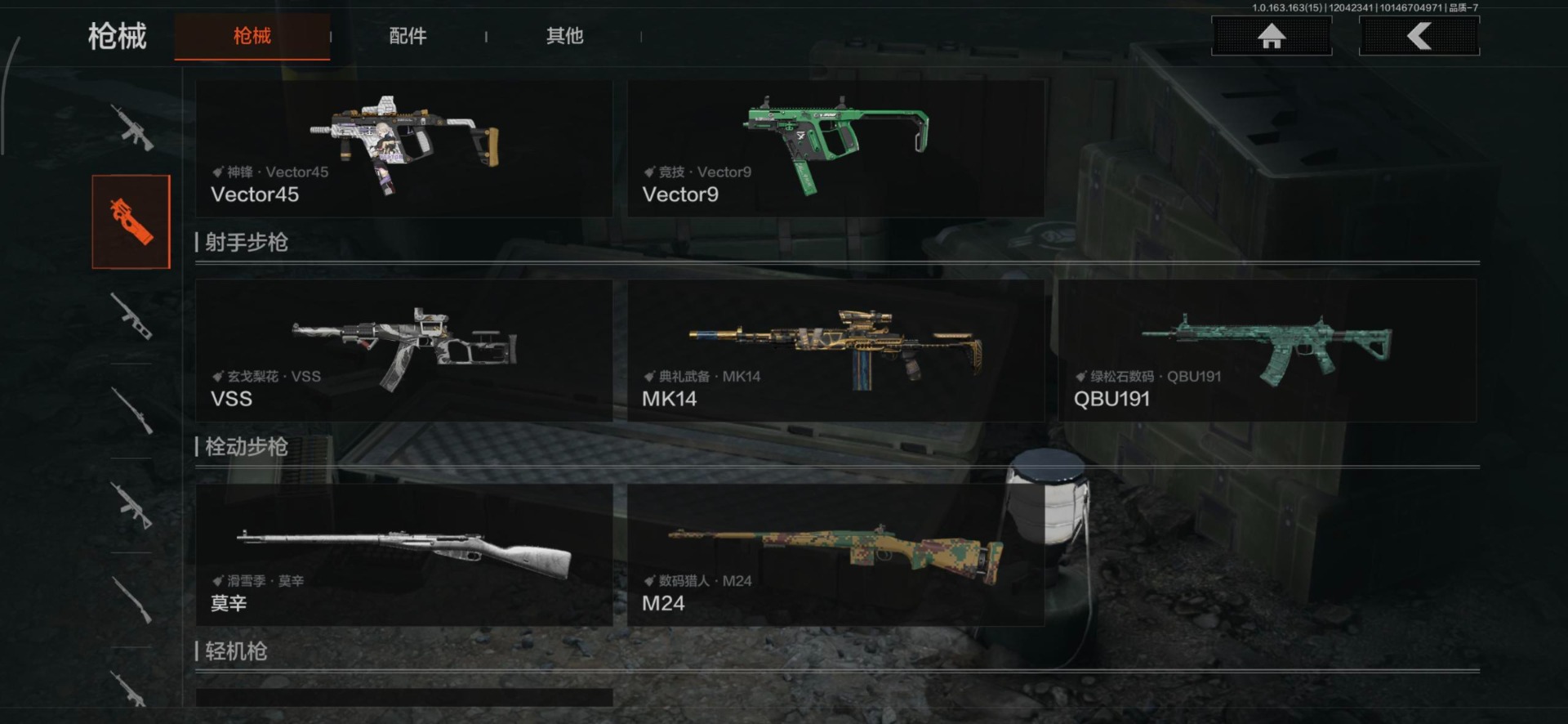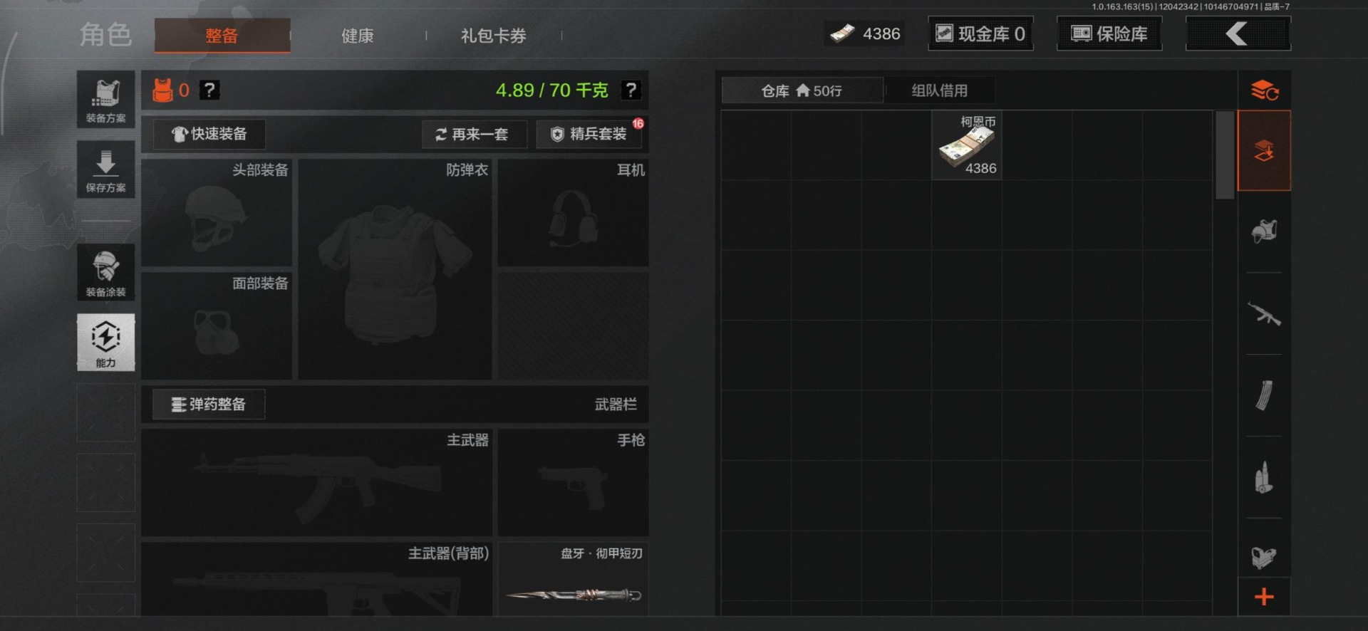 [14347335]库存价值0.06 2近战武器 1金呛皮 可修改实名 【柯恩币数量】:4386 【近战武器】:盘牙·彻甲短刃工兵铲 【金色呛皮】:旧王圣谕·q191 【紫色呛皮】:骤羽尖啸·ak12战术大师·sks典礼武备·14竞技·m4a1和平之手·fal神锋·vecto