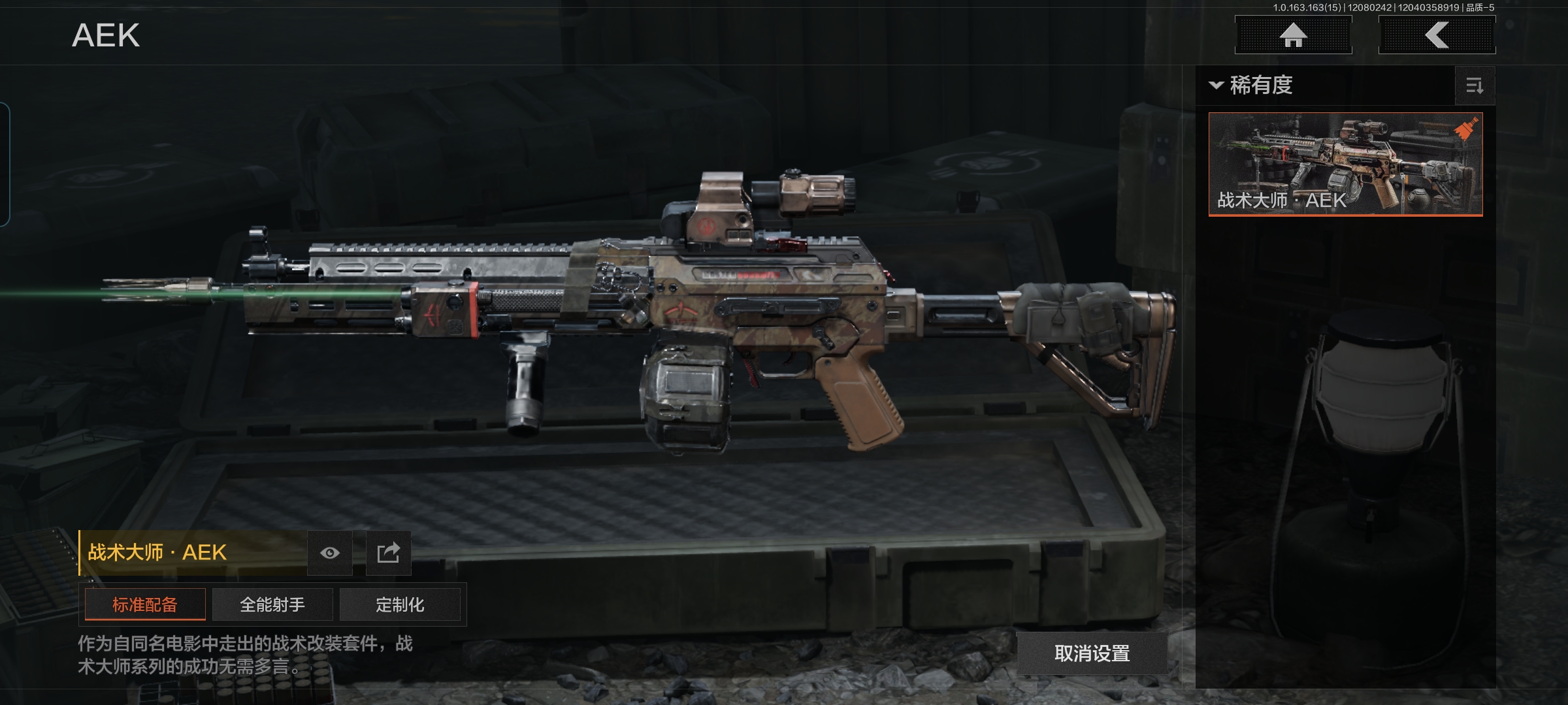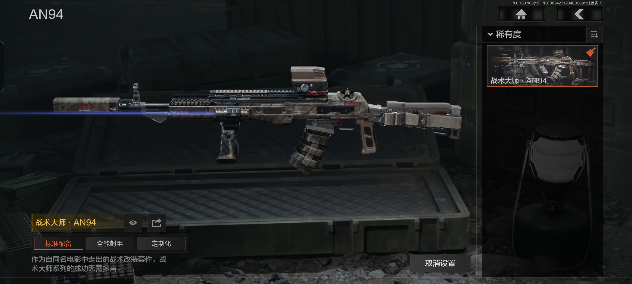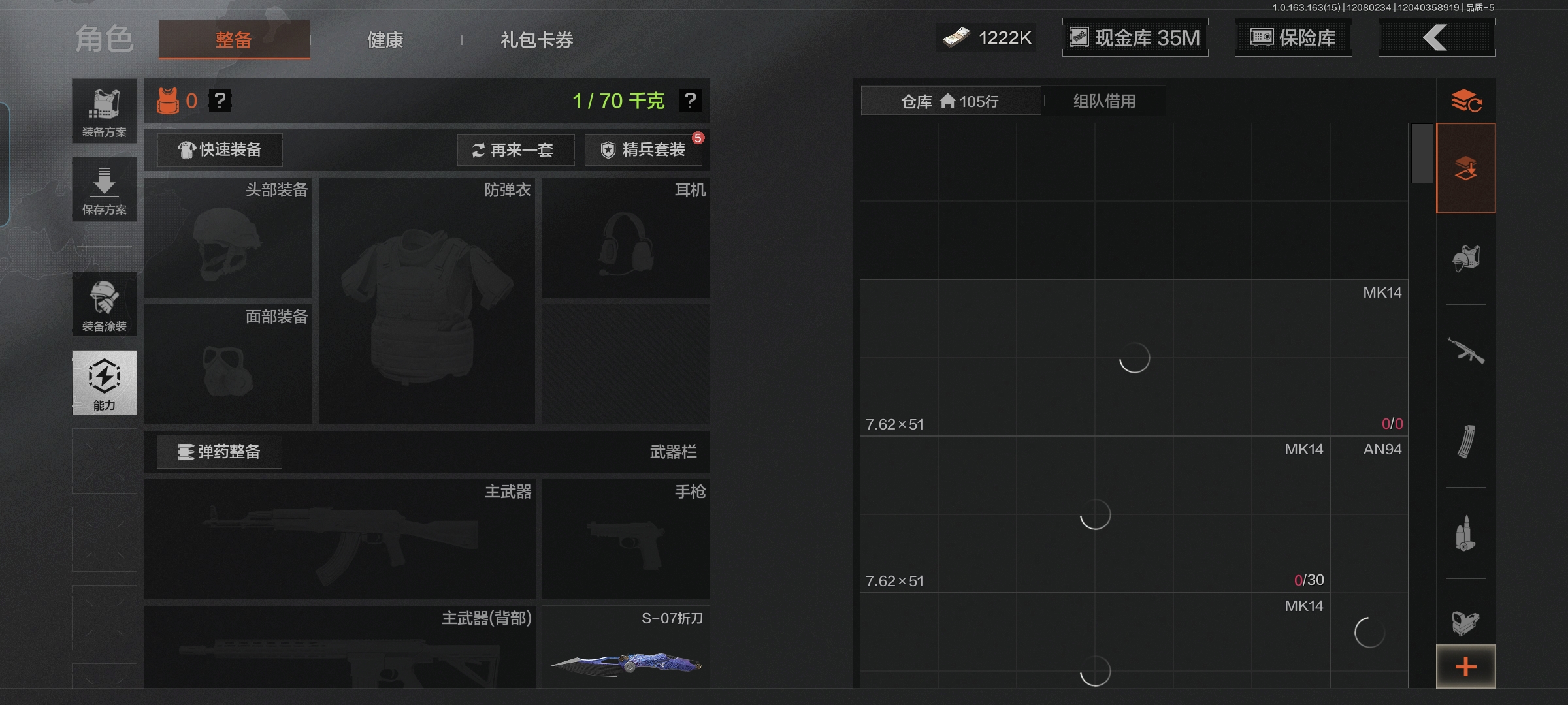 安卓q-等级30-仓库价值51.6m-科恩币1222k【现金库35m】【呛皮】战术大师·aek 战术大师·an94 利齿风暴·m 【刀皮】 热能武器·补牢 s-07折刀 苍穹利爪 工兵铲 【套装】 王国卫队礼装 ·轻装
