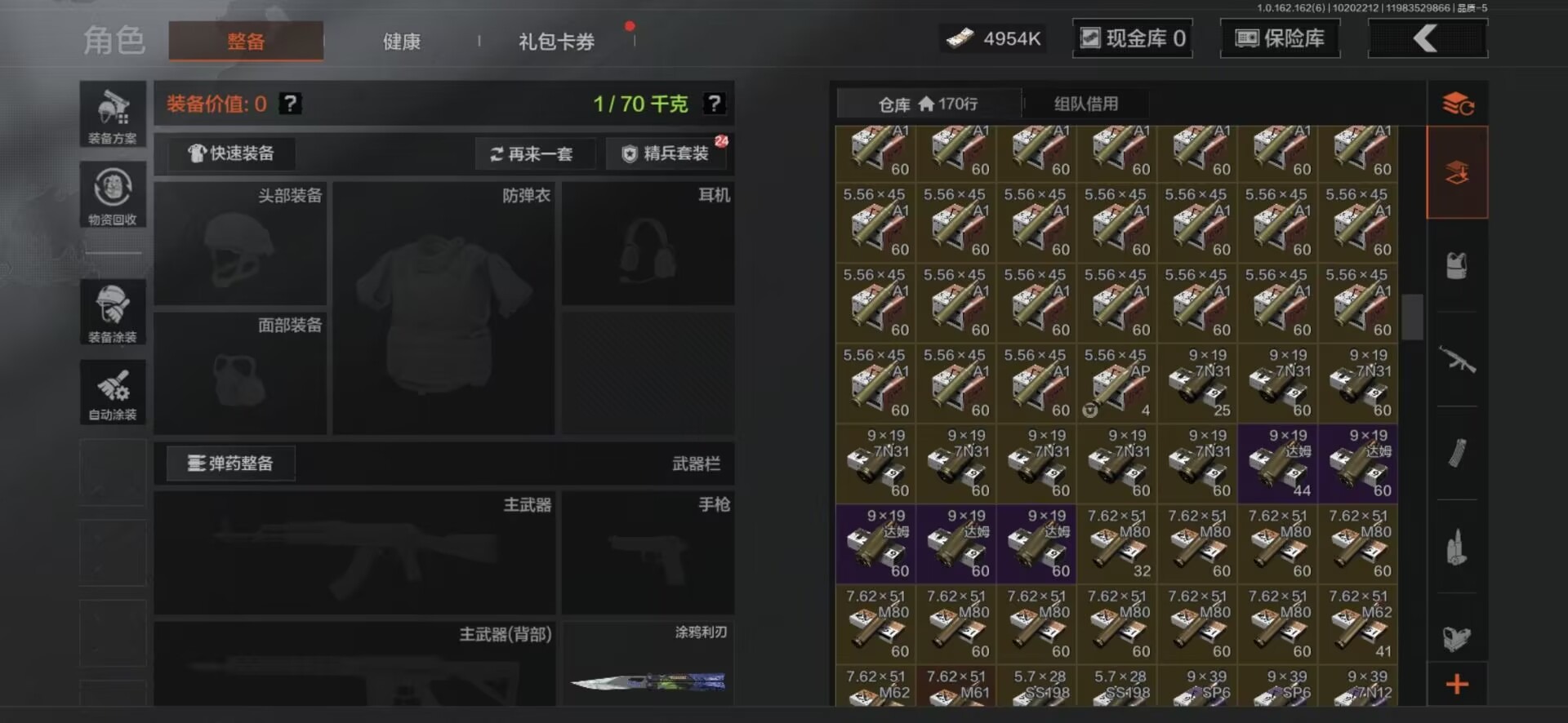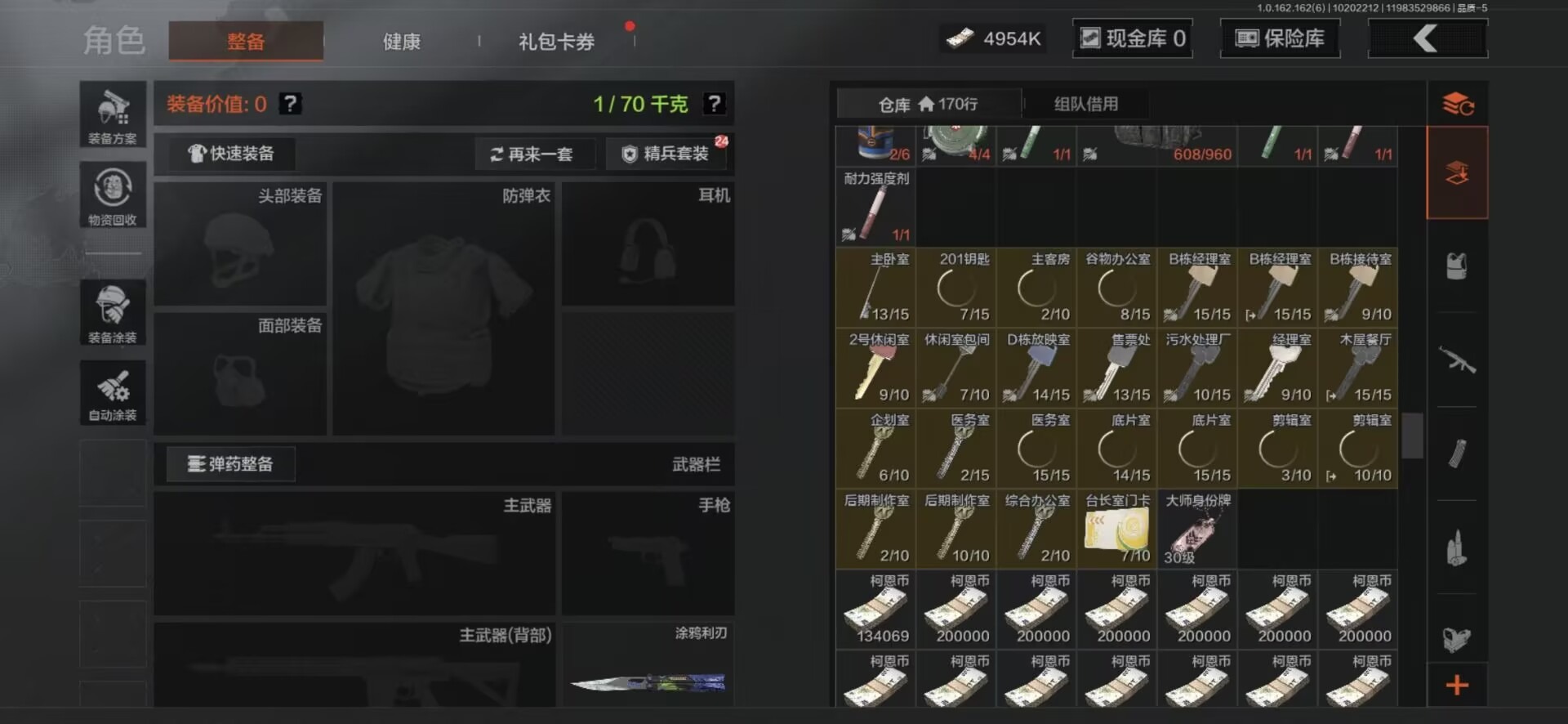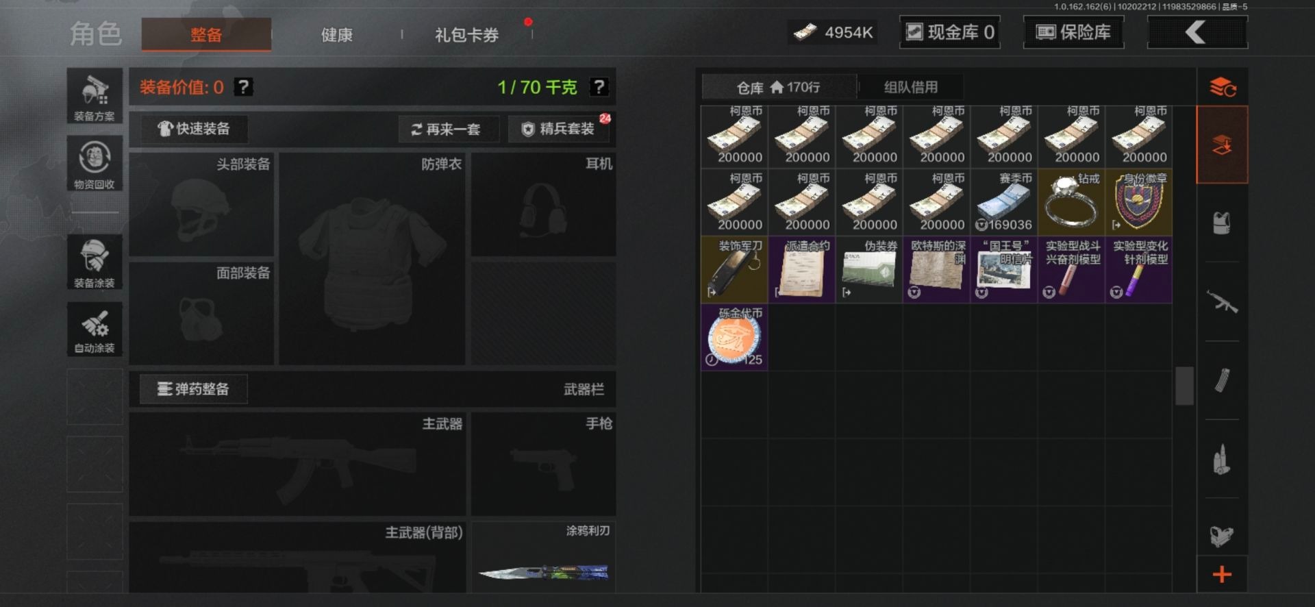 库存价值18.6 3近战武器 1金套装 6金呛皮 可修改实名 【柯恩币数量】:4954 【角色装扮(金)】:龙魂武术运动服 【近战武器】:热能武器·补牢工兵铲涂鸦利刃 【金色呛皮】:告丧夜曲·aug竞技·fal旗帜·aek棱光裂变·qbu191旧王圣谕·q191旧王圣谕·vss