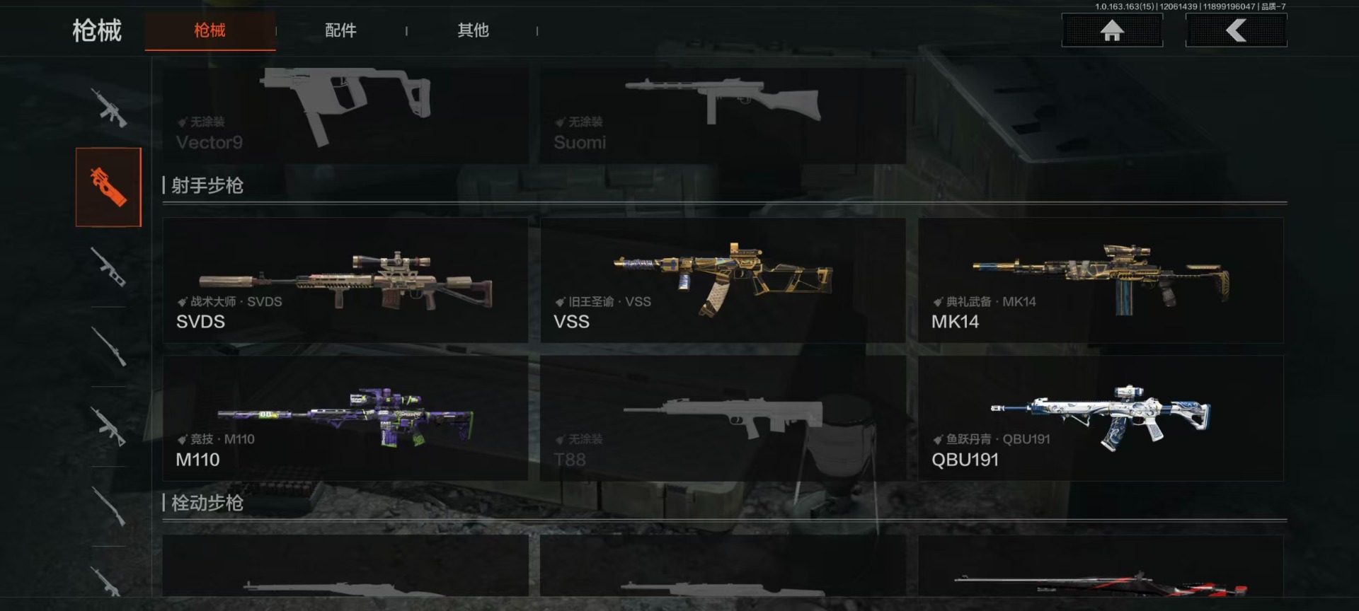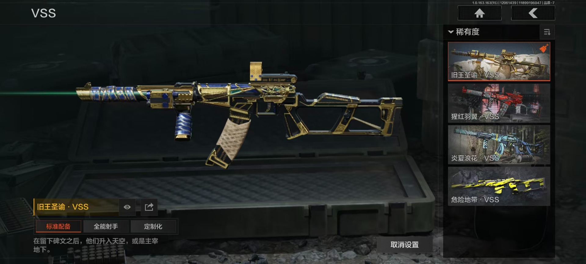 [14396175]库存价值138.2 1近战武器 2金呛皮 可修改实名 【柯恩币数量】:217710 【近战武器】:工兵铲 【金色呛皮】:旧王圣谕·q191旧王圣谕·vss 【紫色呛皮】:竞技·m110骤羽尖啸·m飨宴前兆·q191猩红羽翼·vss鱼跃丹青·qbu191