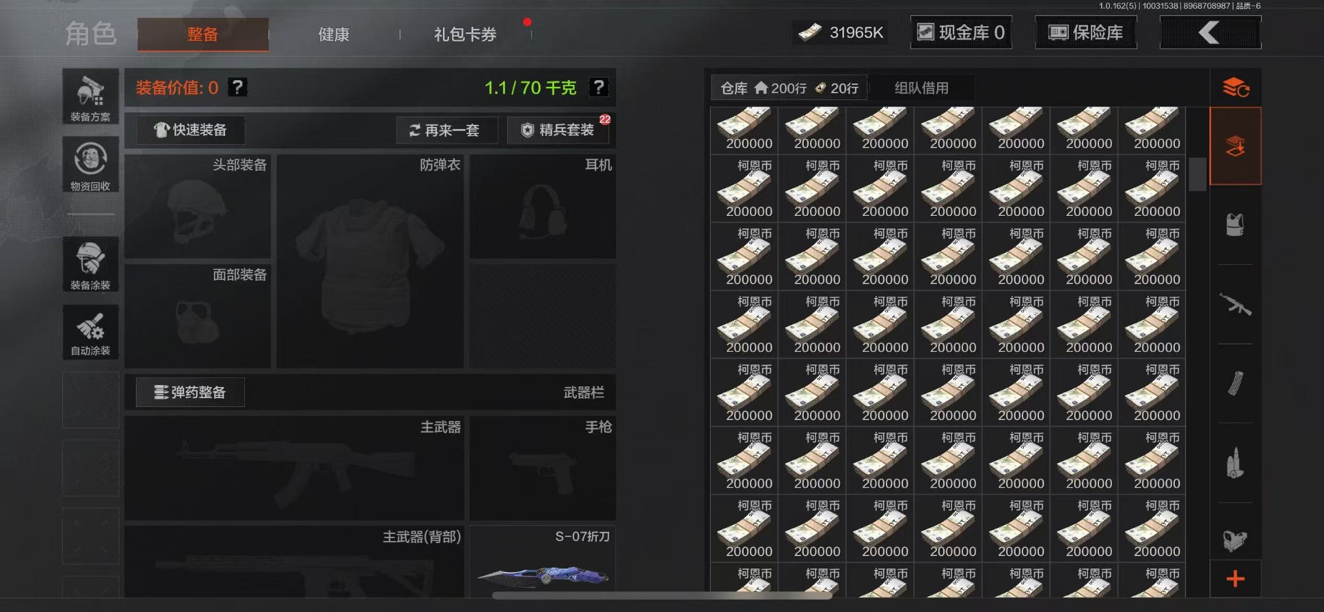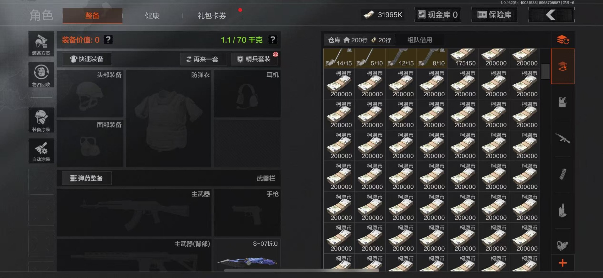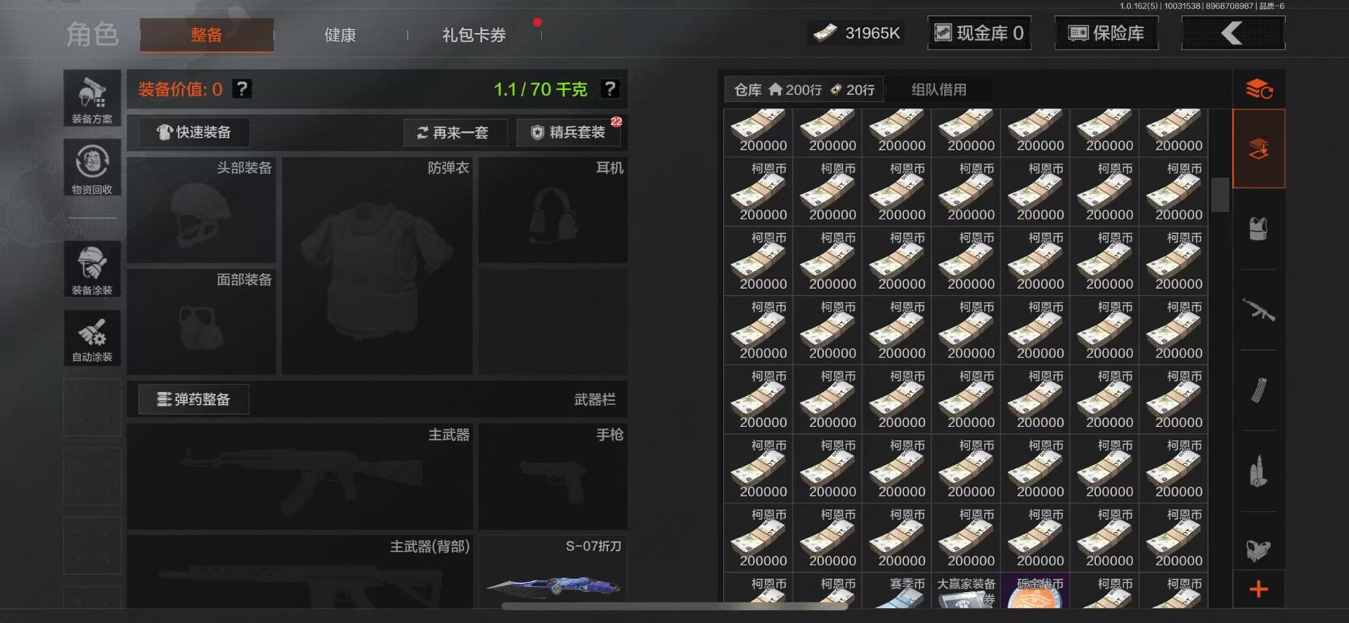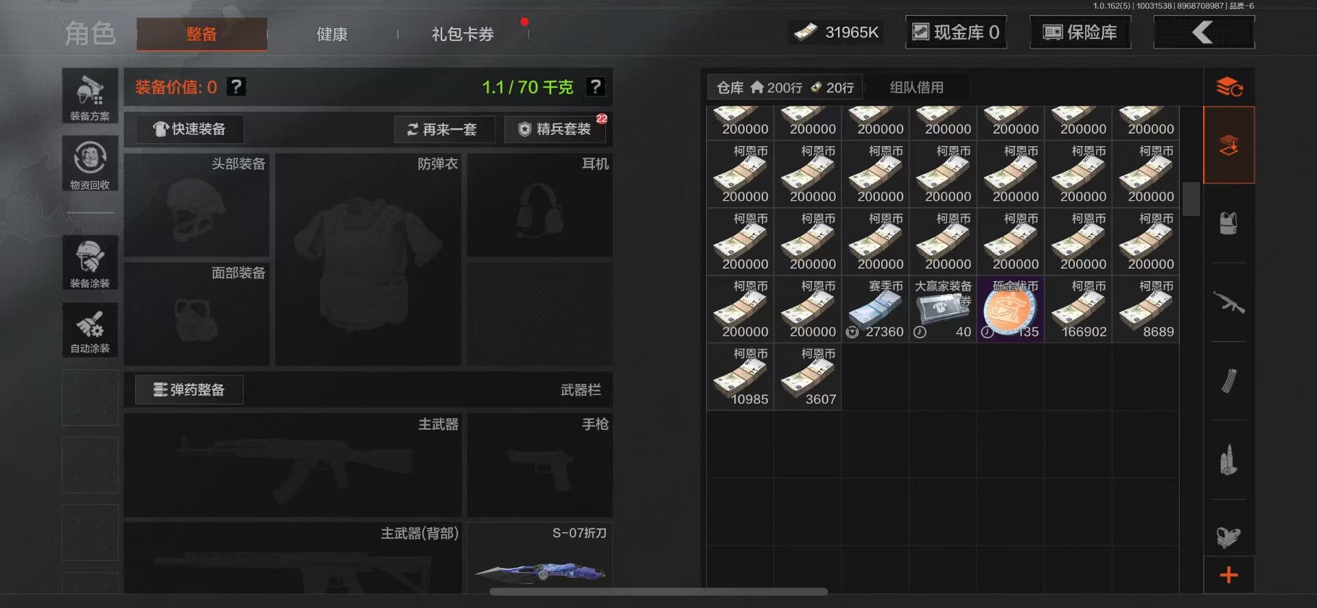 库存价值35.5 5近战武器 1金套装 6金呛皮 可修改实名 【柯恩币数量】:31965 【角色装扮(金)】:火绒·塔莉娅 【近战武器】:来战·开山刀s-07折刀寒牙手刺工兵铲急袭弯刀 【金色呛皮】:骑士之剑·vss竞技·fal旗帜·aek棱光裂变·qbu191利齿风暴·m
