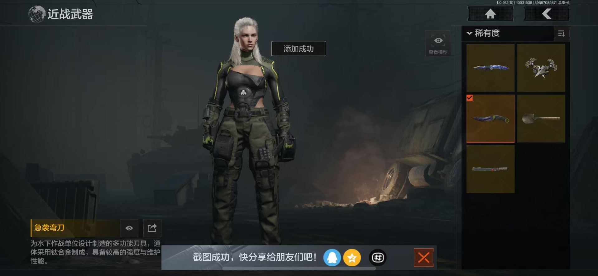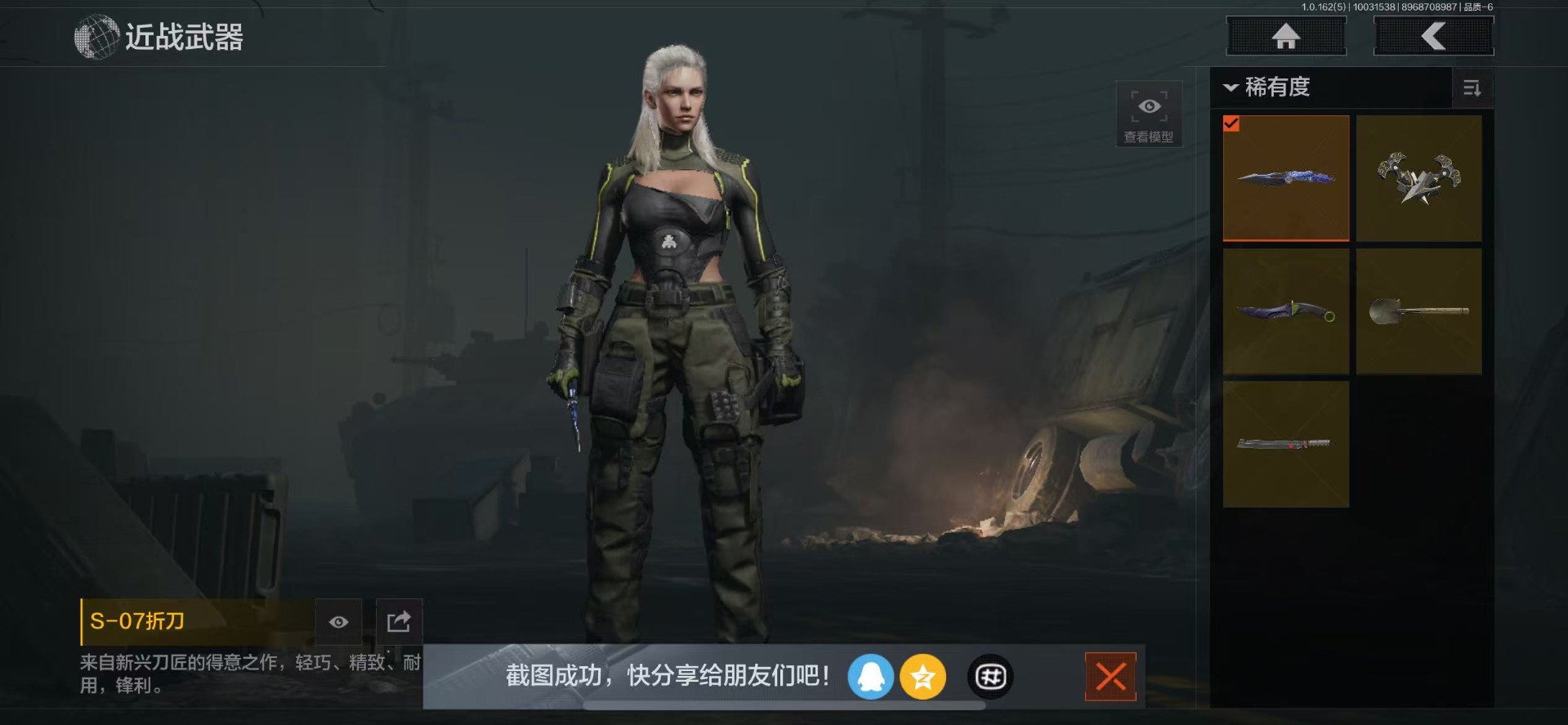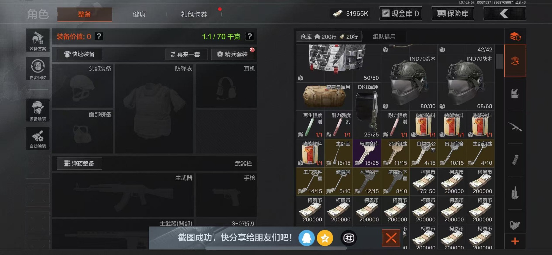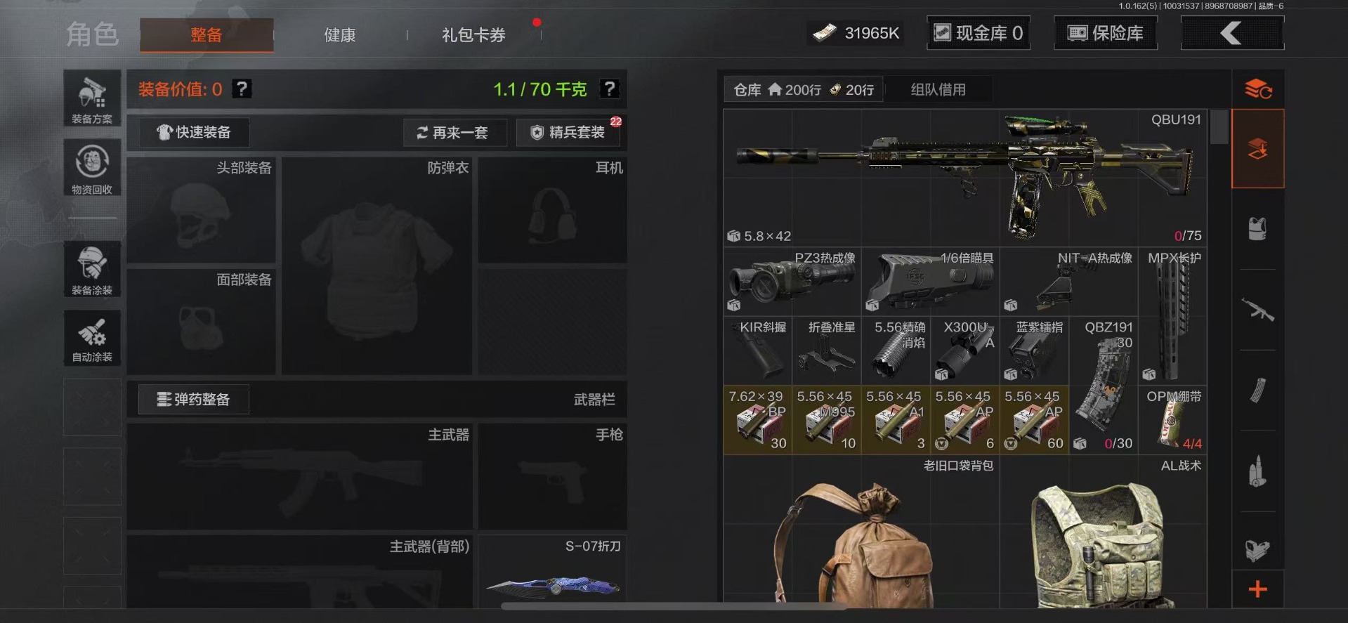 库存价值35.5 5近战武器 1金套装 6金呛皮 可修改实名 【柯恩币数量】:31965 【角色装扮(金)】:火绒·塔莉娅 【近战武器】:来战·开山刀s-07折刀寒牙手刺工兵铲急袭弯刀 【金色呛皮】:骑士之剑·vss竞技·fal旗帜·aek棱光裂变·qbu191利齿风暴·m