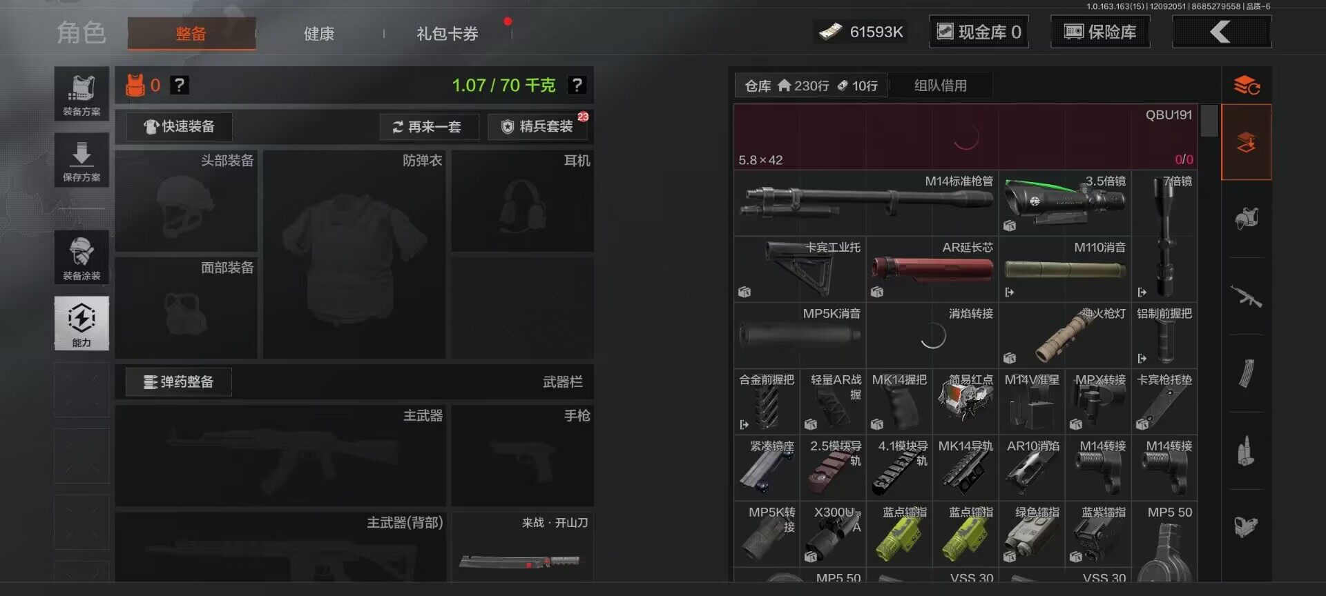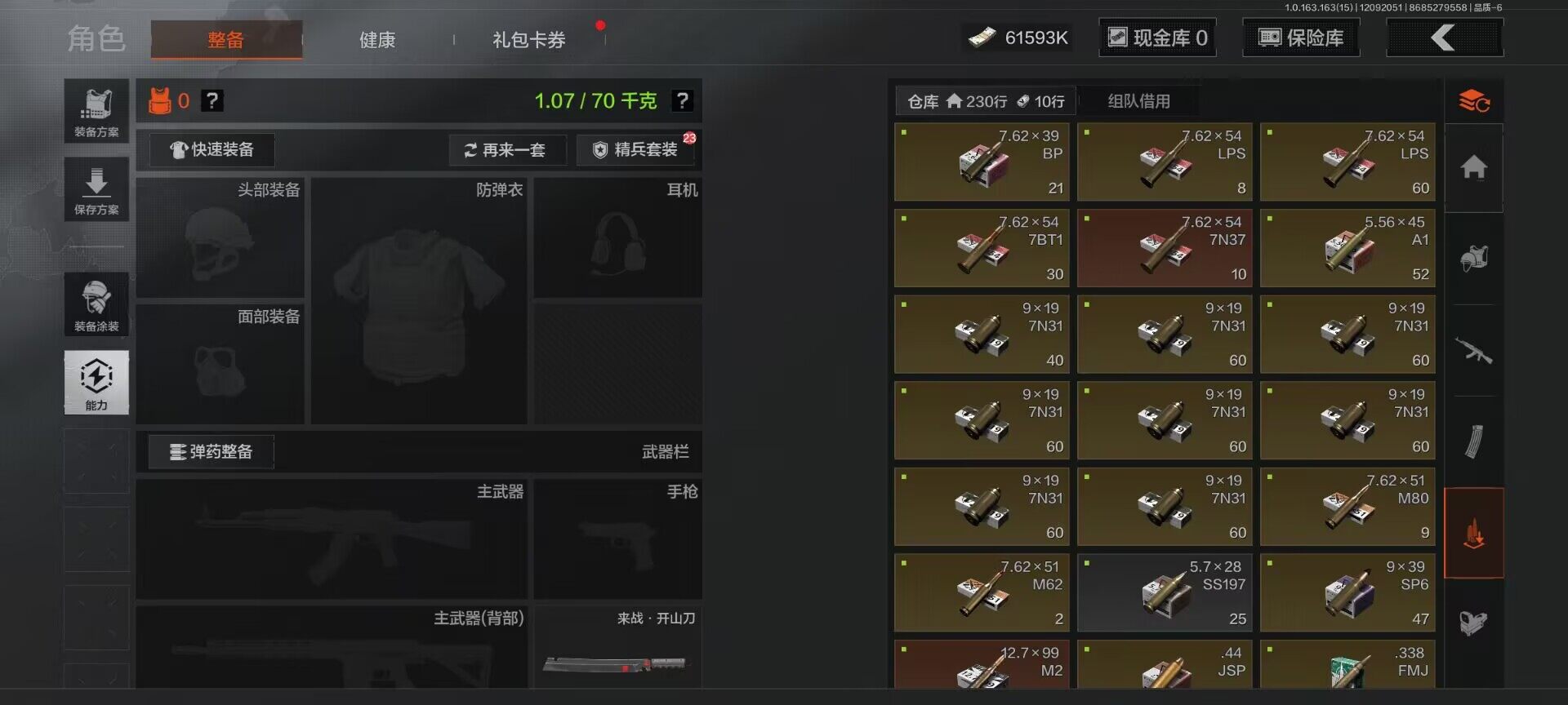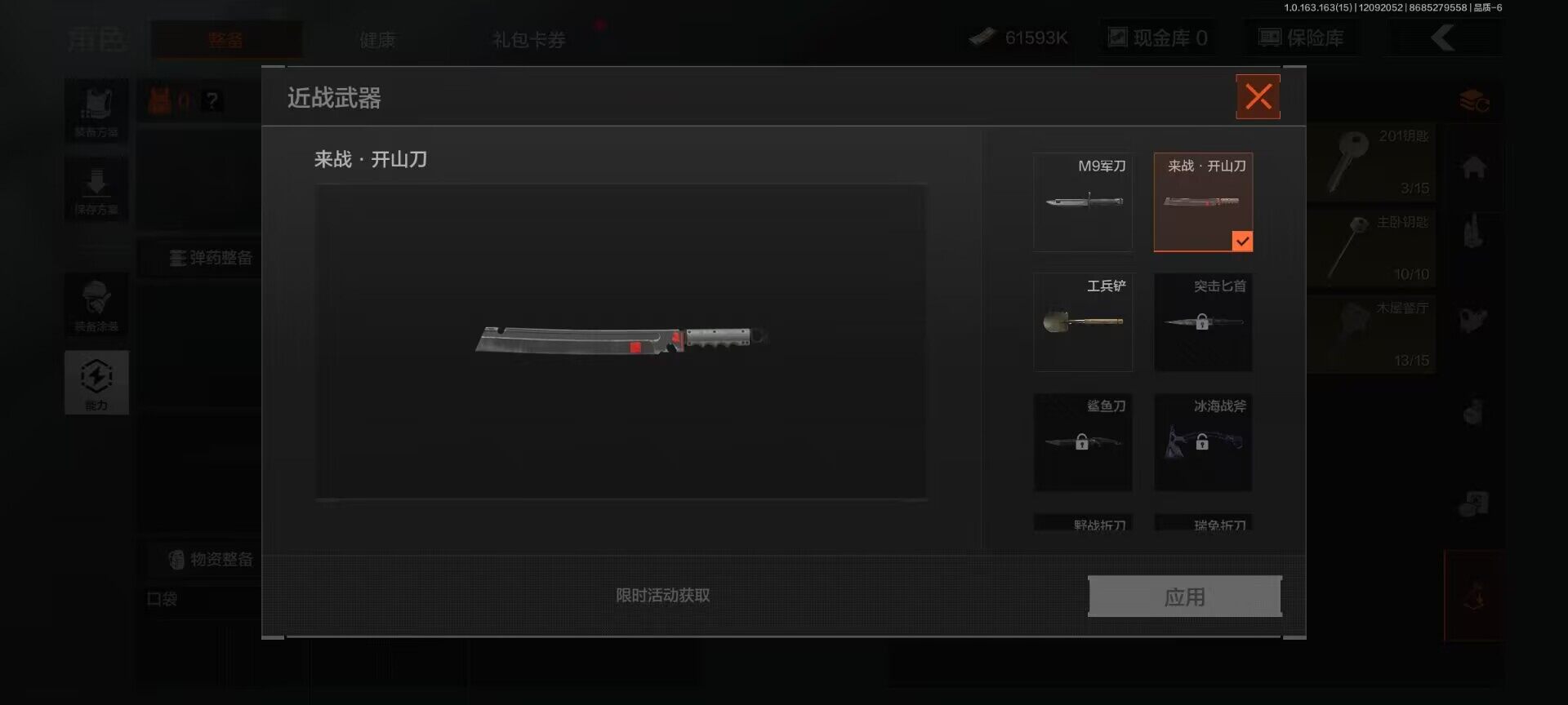 【aqzg657】等级:30/段位:专家/仓库价值百万:70.1/柯恩币:61593000/来战开山刀/工兵铲