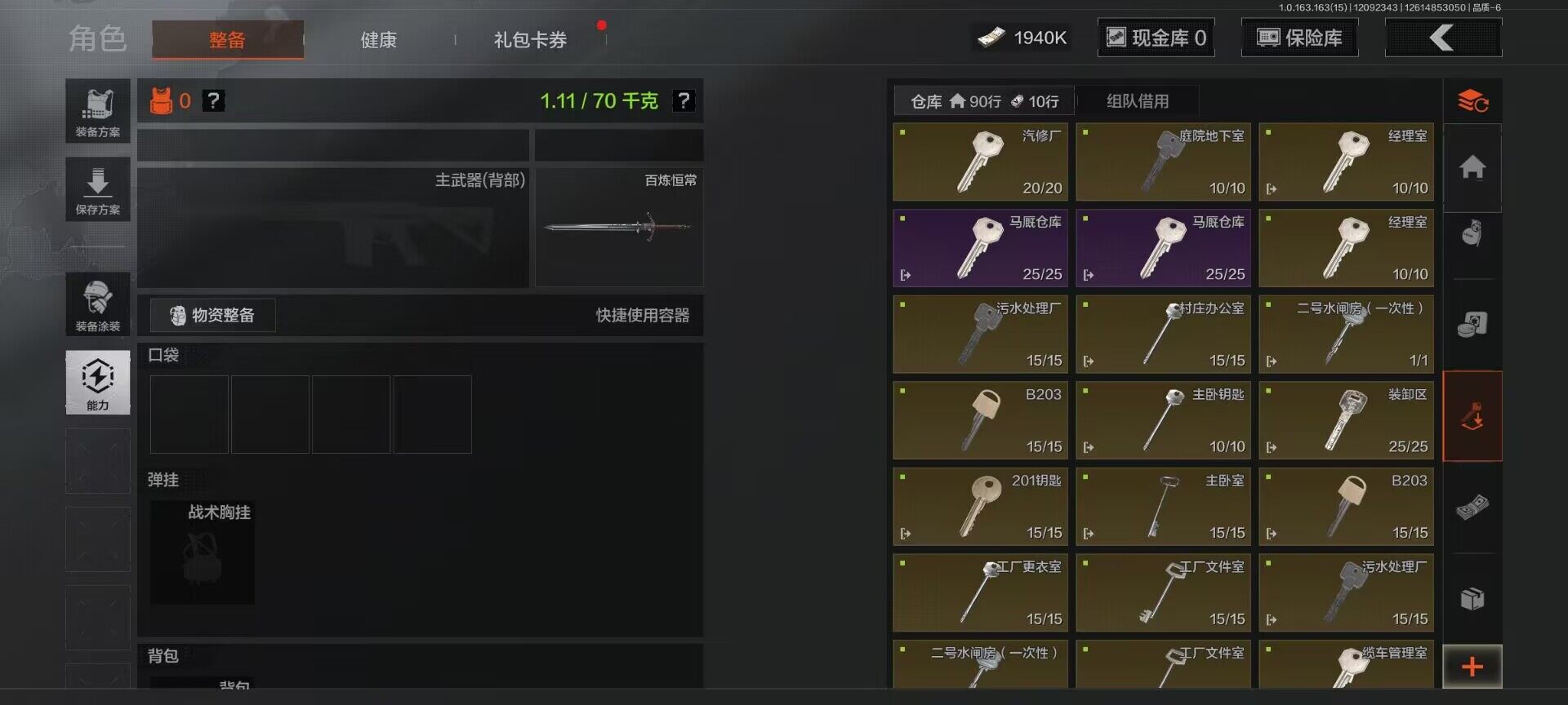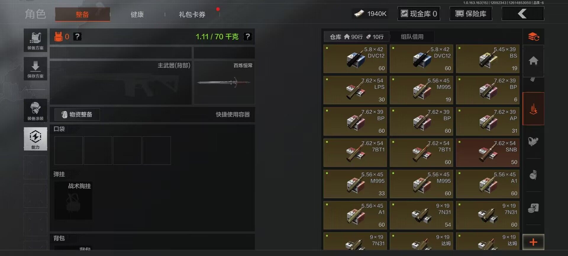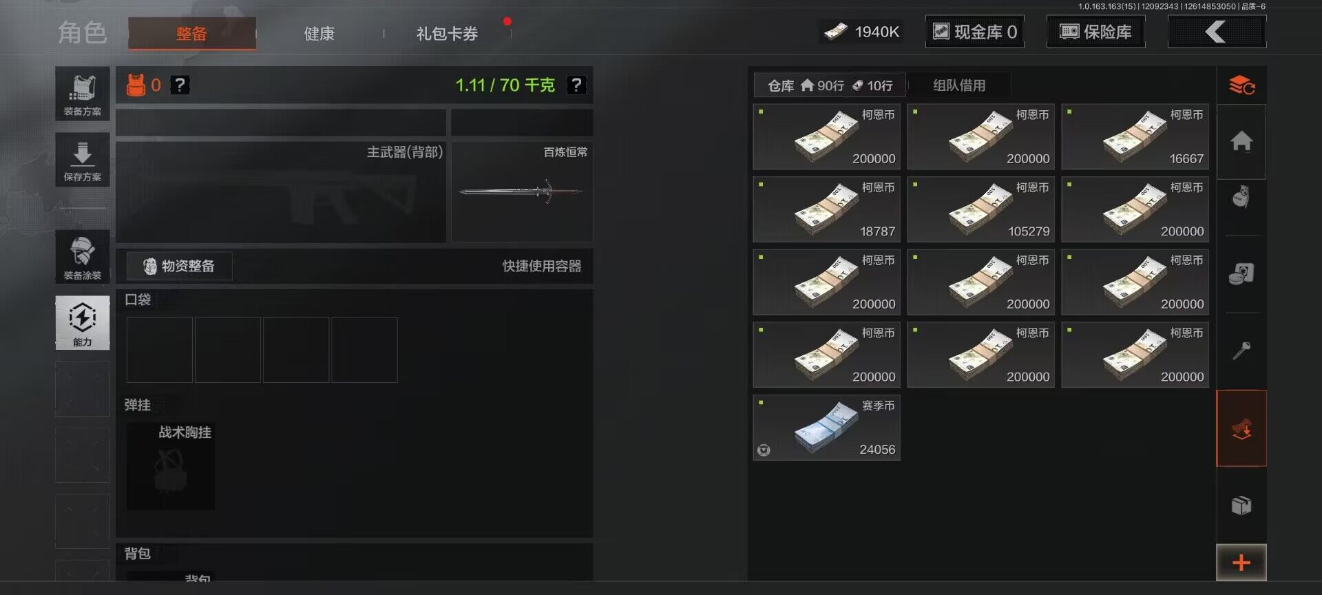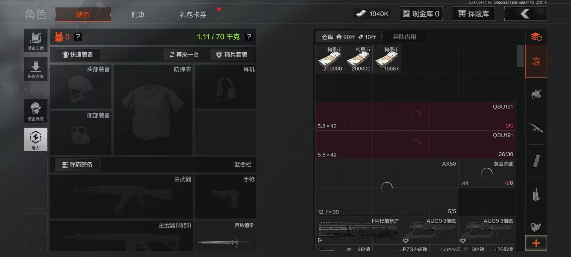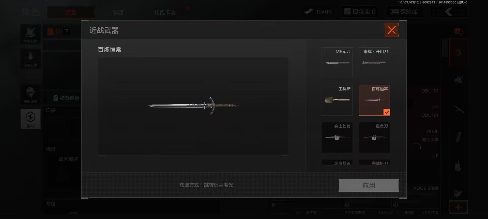 【aqzg661】等级:30/段位:大师/仓库价值百万:34.2/柯恩币:1940000/百炼恒常/来战开山刀/工兵铲