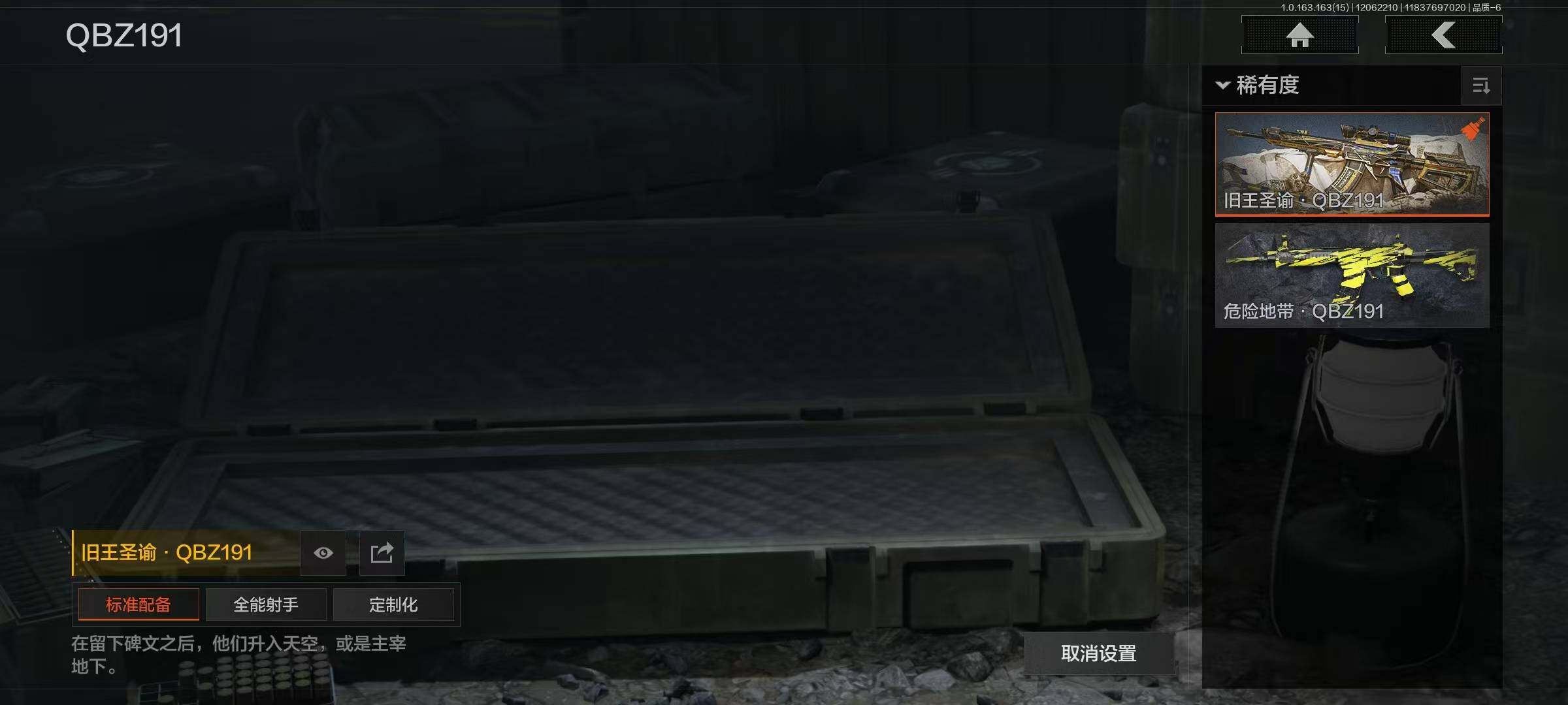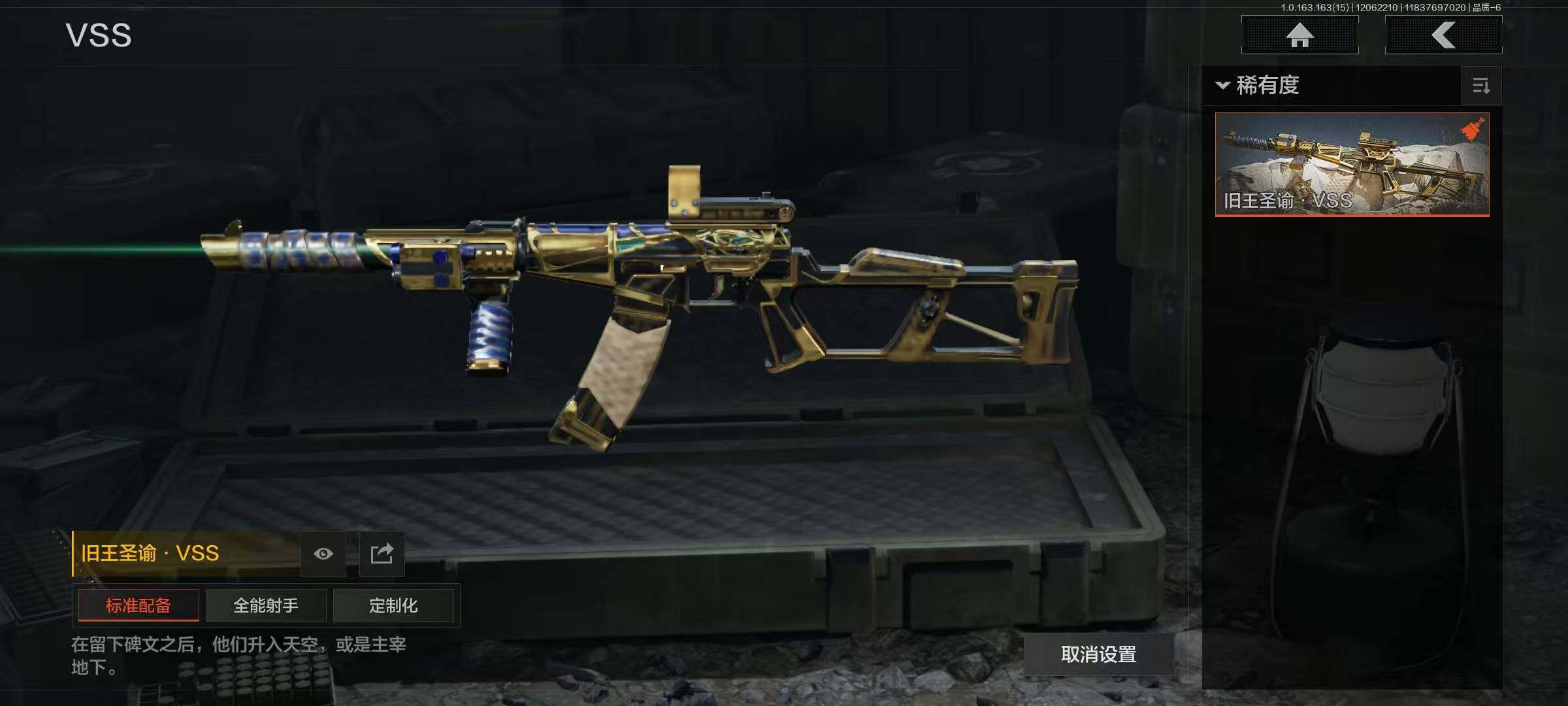 有二次 总价值35m 现金20m旧王圣谕·q191 旧王圣谕·vss 棱光裂变·qbu191 战术大师·q192 旗帜·aek 告丧夜曲·ar57