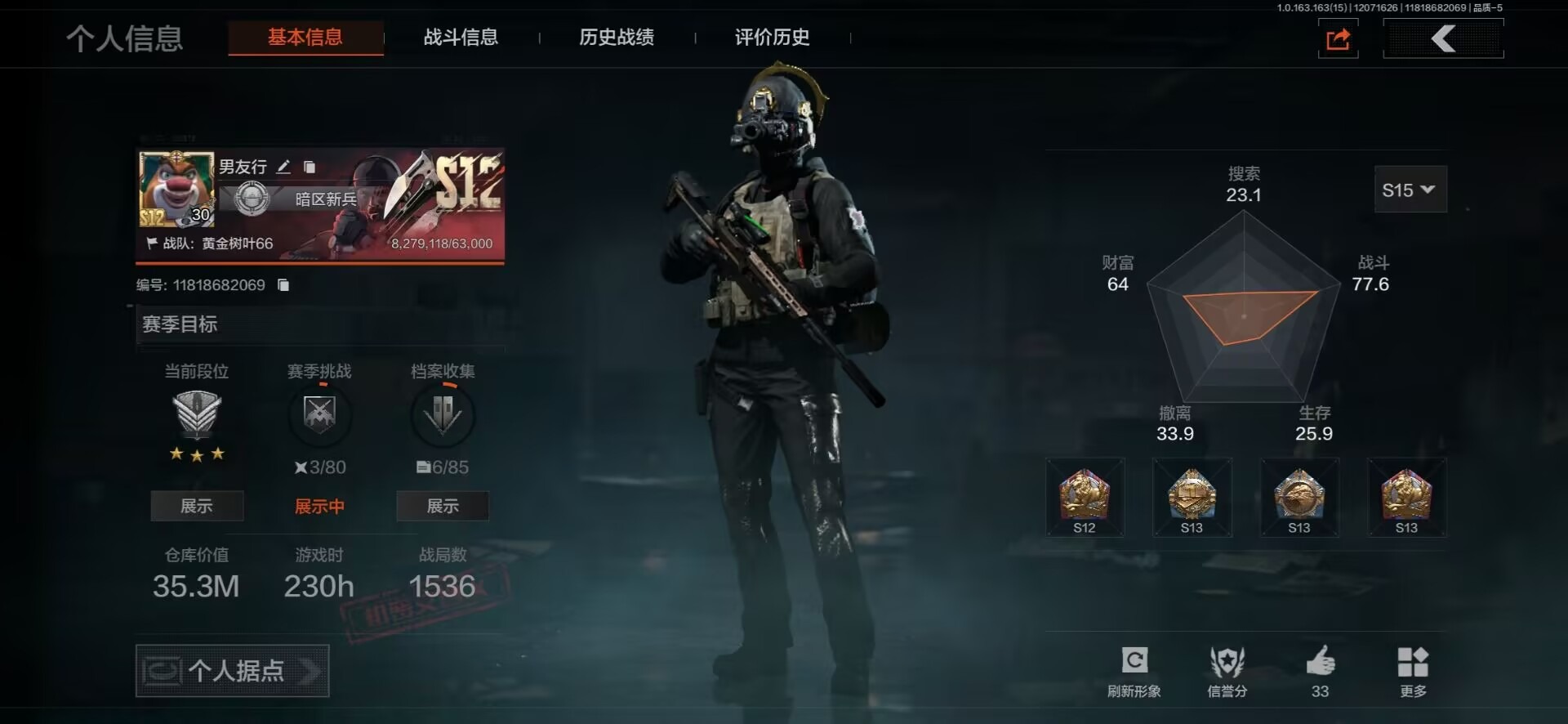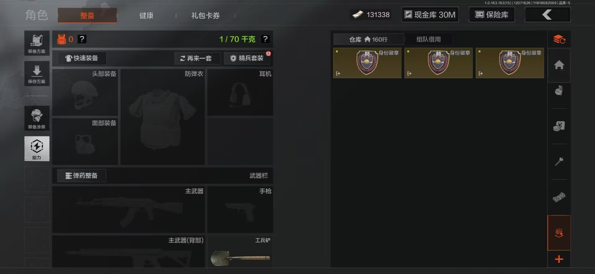 库存价值35.3 1近战武器 3金呛皮 可修改实名 【柯恩币数量】:131338 【近战武器】:工兵铲 【金色呛皮】:告丧夜曲·ar57利齿风暴·m旧王圣谕·vss 【紫色呛皮】:竞技·m110竞技·mdr利齿风暴·t03利齿风暴·t79鱼跃丹青·qbu191竞技·aug火力