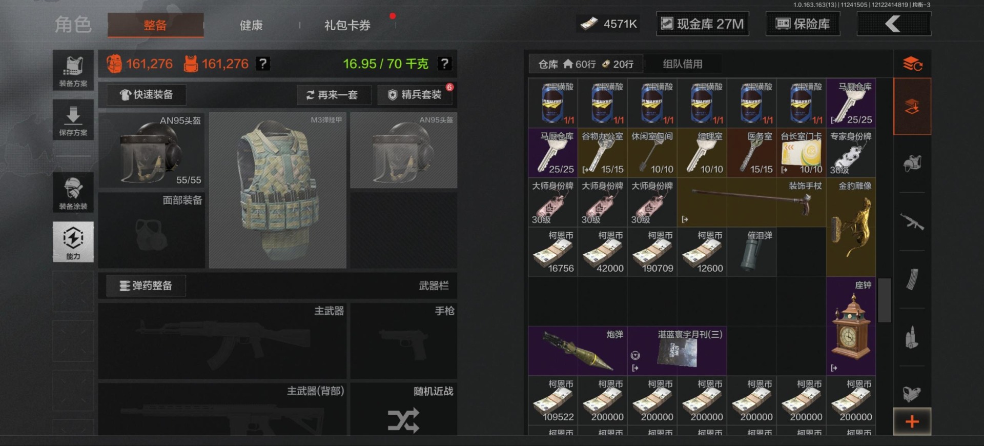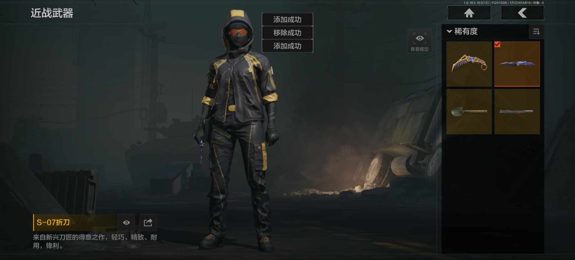 库存价值48.9 4近战武器 1金呛皮 可修改实名 【柯恩币数量】:4571 【近战武器】:苍穹利爪s-07折刀工兵铲来战·开山刀 【金色呛皮】:战术大师·an94 【紫色呛皮】:逆火玄石·akm幻域莎绫·m4a1骑士之剑·aks74u和平之手·fal 【角色装扮(紫)】:都市夜影套