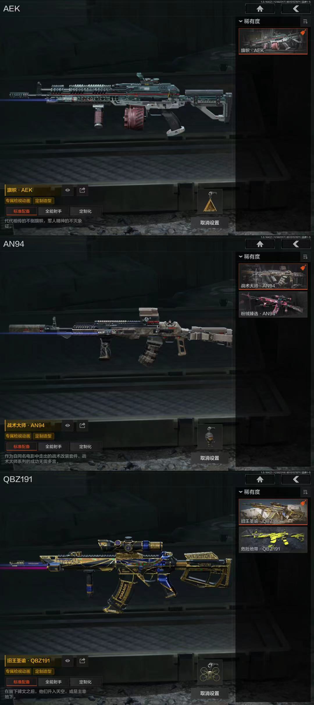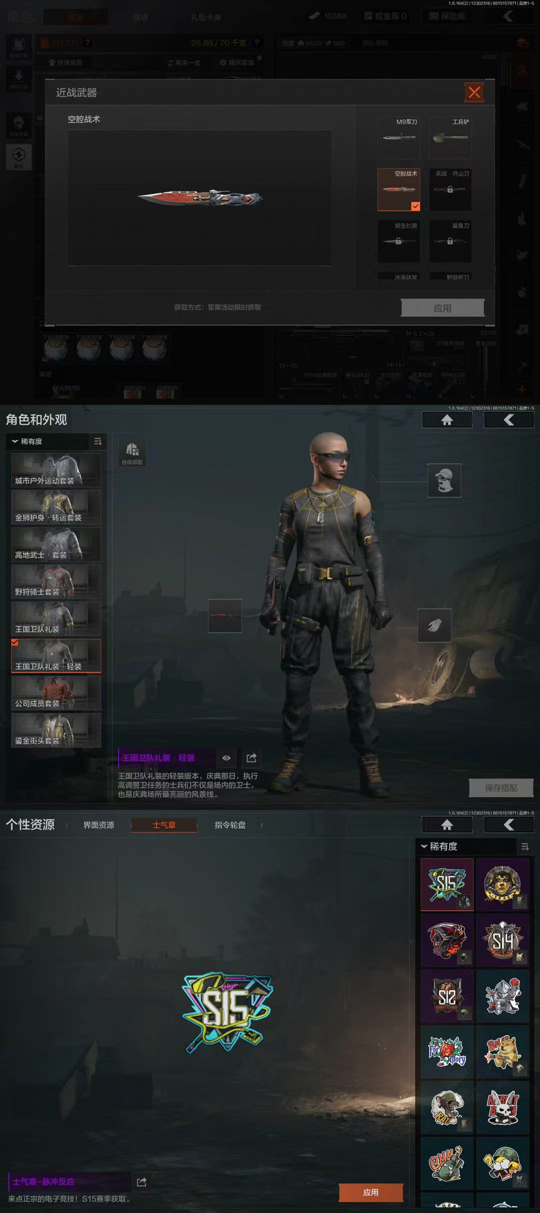 【9金呛 2刀皮】果q-等级30-仓库价值1.8m-科恩币1038k-【套装】 城市户外运动套装 金狮护身·转运套装 高地武士·套装 野狩骑士套装 王国卫队礼装 王国卫队礼装·轻装 公司成员套装 鎏金街头套装 【呛皮】 包络战术·akm 伦琴幻影·fal 告丧夜曲·ar57 旧王圣谕·q191 战术大师·an94 旗帜·aek 利齿风暴·m 骑士之剑·vss 棱光裂变·qbu191 【