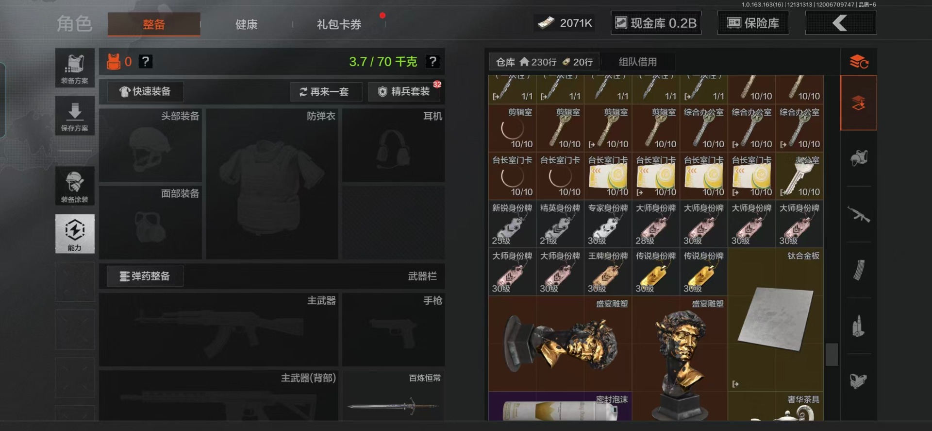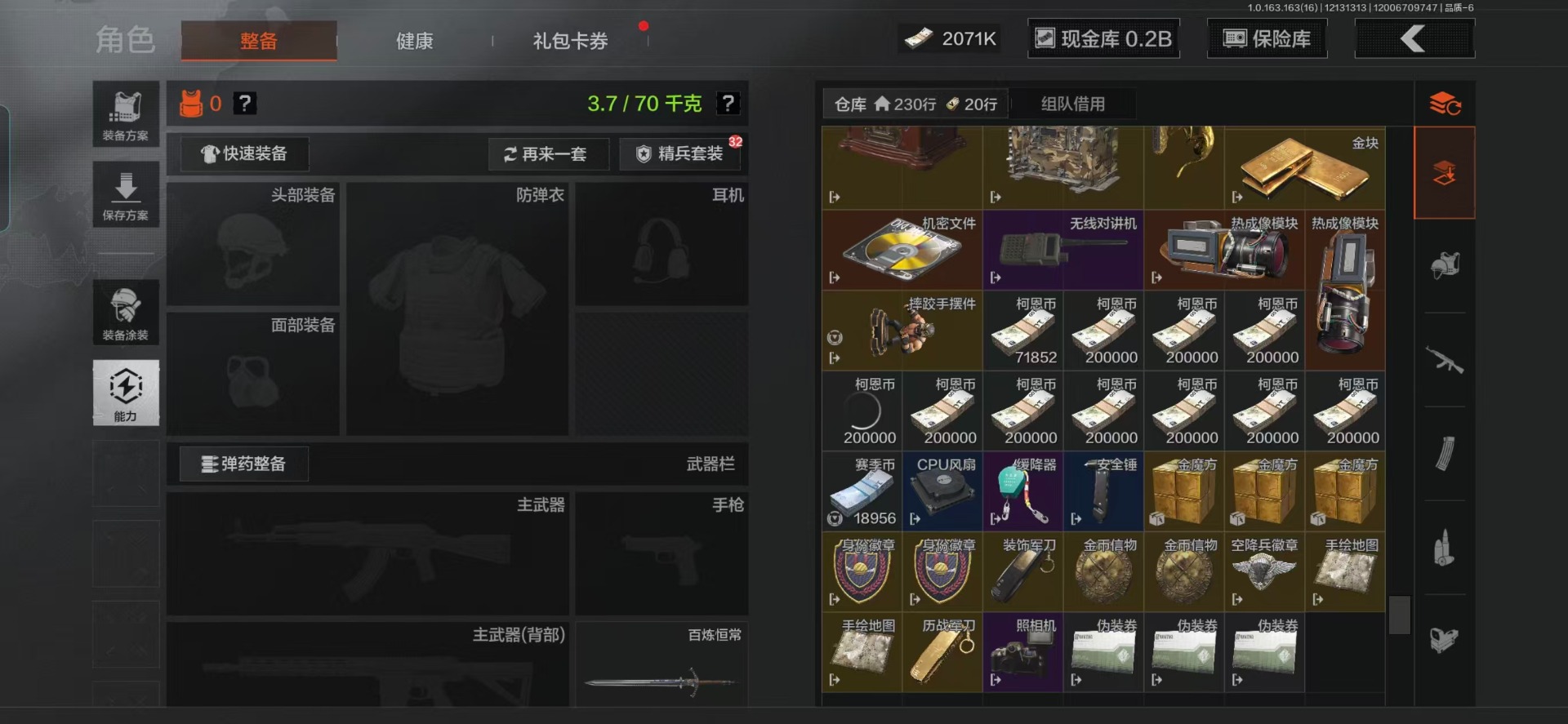 [15834509]库存价值240.5 22近战武器 4金套装 13金呛皮 可修改实名 【柯恩币数量】:2071 【角色装扮(金)】:绅士西服矿山霸主常服不败坚守作战服噤声者吉利服 【近战武器】:空腔战术苍穹利爪收割者s-07折刀热能武器·补牢赢家匕首瀚星斩铁不屈烈怒盘牙·彻甲短刃三尺万仞·战术剑寒牙手刺工兵铲来战·开山刀鲨鱼刀涂鸦利刃冬日冰镐裁决手杖剑急袭弯刀霜狼生存刀精英指虎野战折刀百炼恒常 【金色呛皮】:告丧夜曲·ar57战术大师·aek生物危害·ak74n骑士之剑·ax50旗帜·aek黄金·h416黄金·ak74n水果·ar57焰色反应·dp12蓝色咆哮·h416长缨风掣·rpk16伦琴幻影·h416骑士之剑·vss 【紫色呛皮】:竞技·ar57最后防线·aek火力倾泻·rpd棱光裂变·莫辛棱光裂变·ak74n旗帜脉冲·usas12战术大师·sks战术大师·suomi战术大师·ak74n生化污染·m870伦琴计量·vect45伦琴计量·ak74n典礼武备·m249逆火玄石·aek自喷网格·h416灰鼠幻歌·p90骑士之剑·sj16涂绘猎人·ar57雪原凌锋·svds玄戈梨花·m 【角色装扮(紫)】:高地武士套装使徒·瑞文金狮护身·转运套装速降反光·户外运动套装赤红雄狮作战套装荣耀之熊作战套装台风iii竞技运动服台风iv竞技运动服秋日盛宴风衣