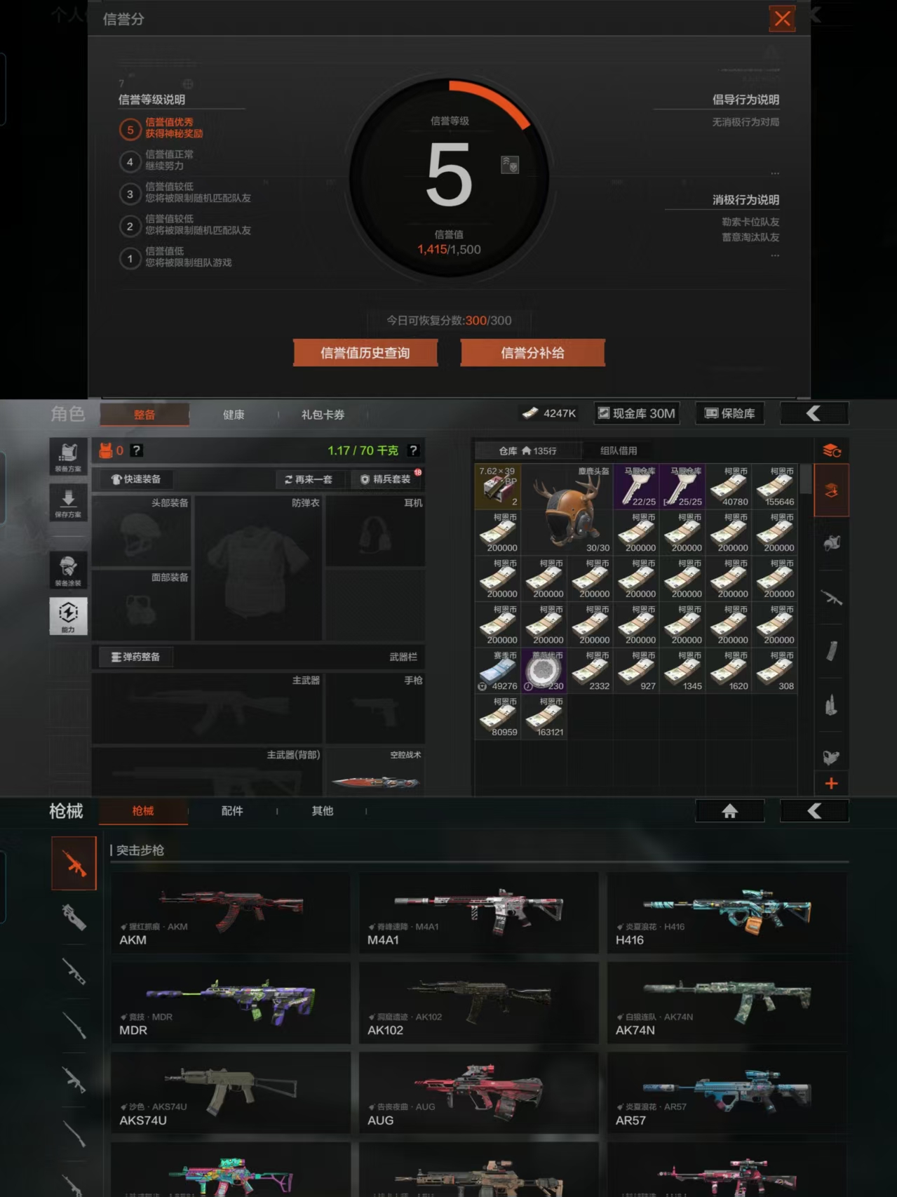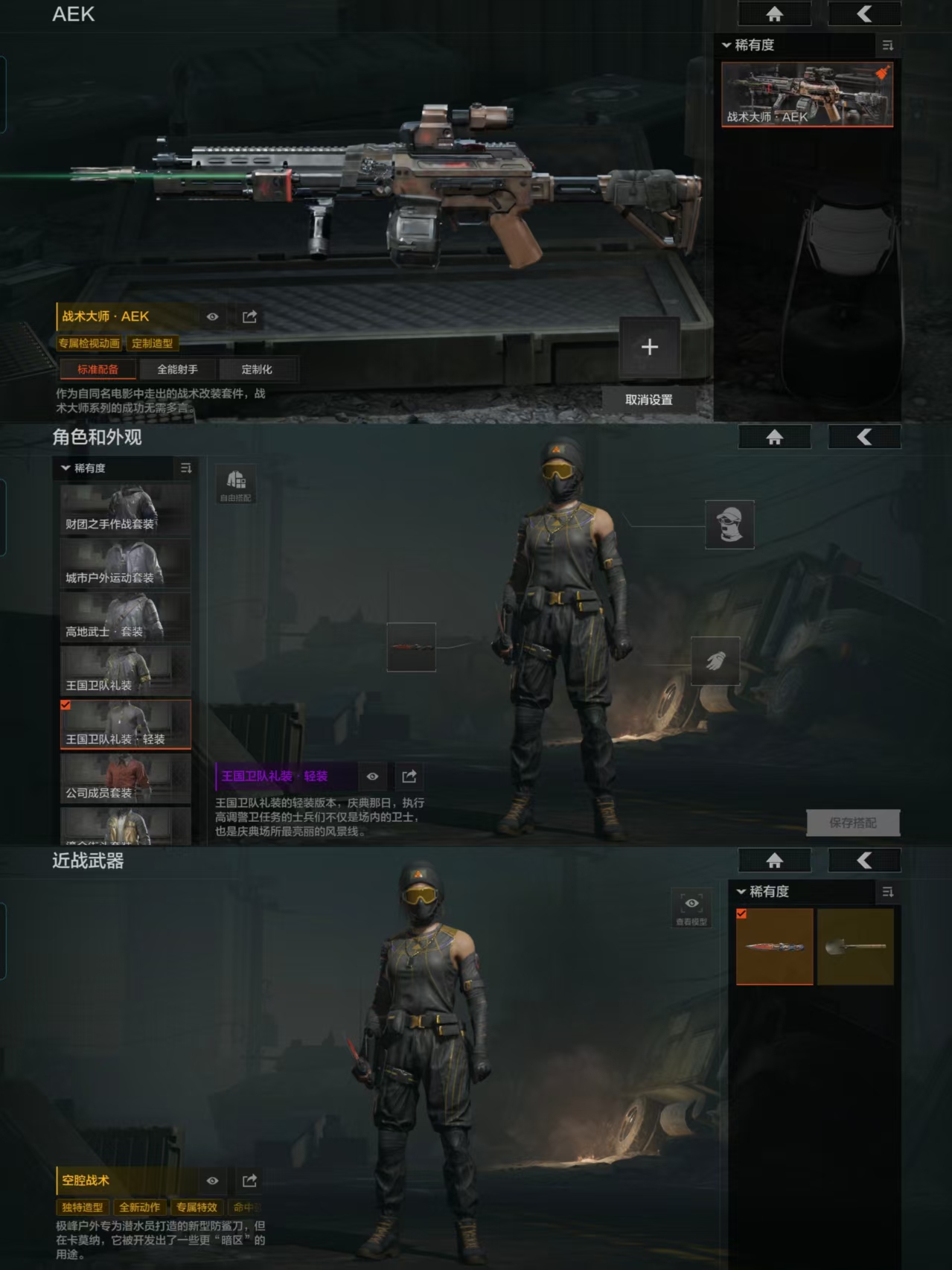 安卓q-等级30-仓库价值34.5m-科恩币4247k 30m现金-【套装】鎏金街头套装 财团之手作战套装 高地武士套装 王国卫队礼装 王国卫队礼装.轻装 城市户外运动套装 公司成员套装【呛皮】告丧夜曲.aug 战术大师.aek【近战武器】 空腔战术 工兵铲